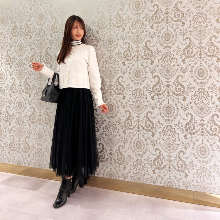 スワロフスキーのボタンがきらりと輝くカーディガンを組み合わせた大人エレガントなスタイリングを意識してみました。