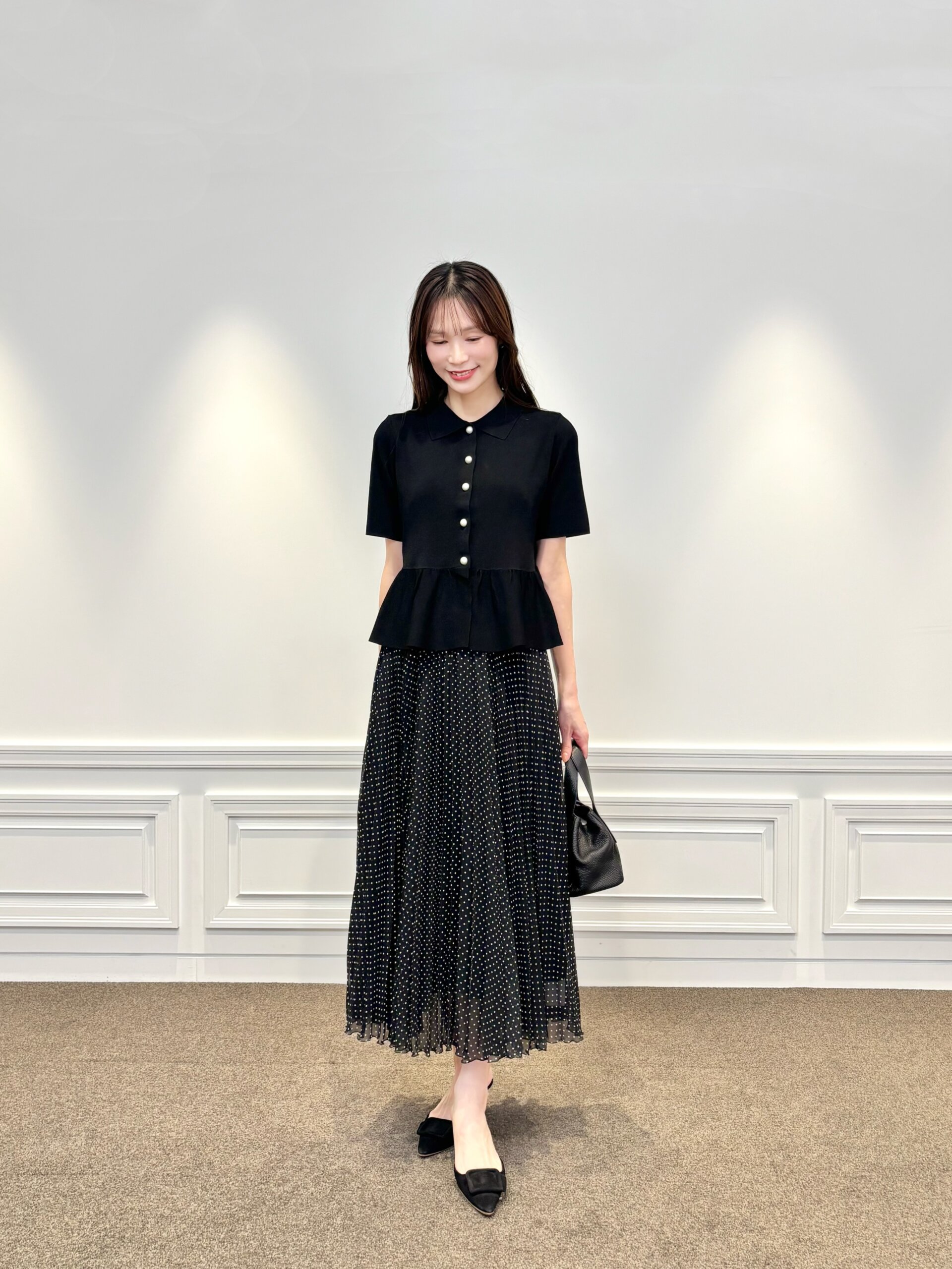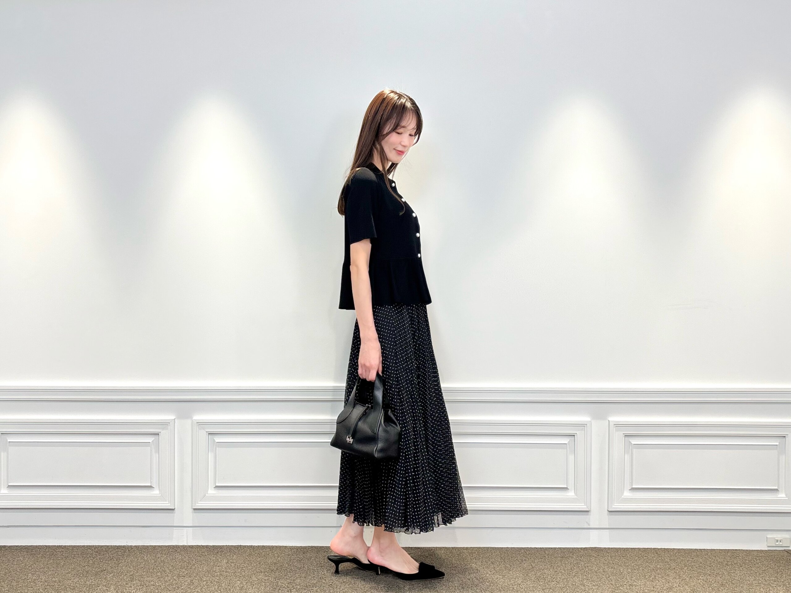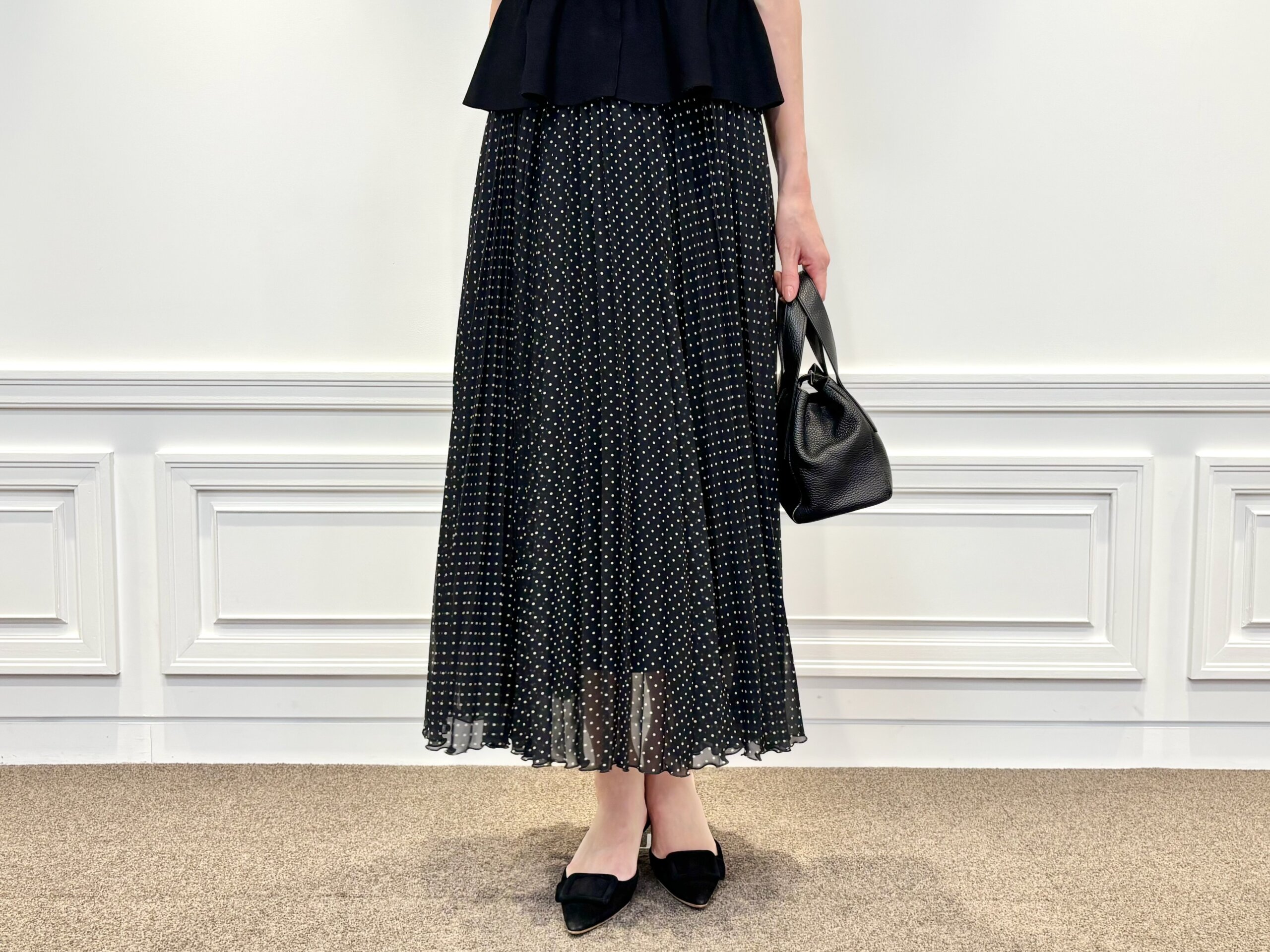 ボトムには、黒地に白の細かなドット柄を配したプリーツスカートを合わせました。軽やかに揺れる細プリーツと繊細なドットが、大人の女性にふさわしい控えめな可愛らしさを演出。モノトーン配色なので甘くなりすぎず、洗練されたフェミニンスタイルが完成します。
