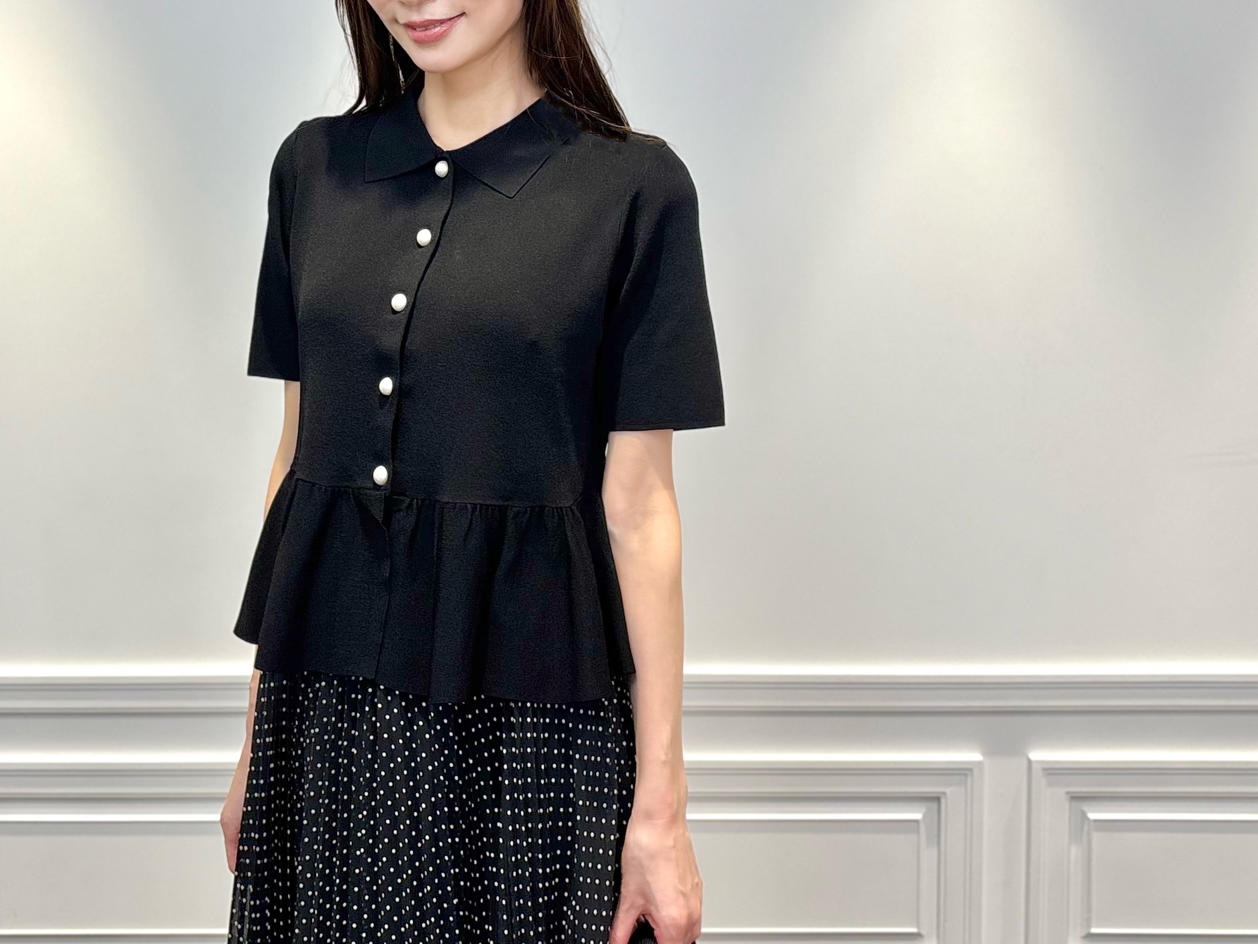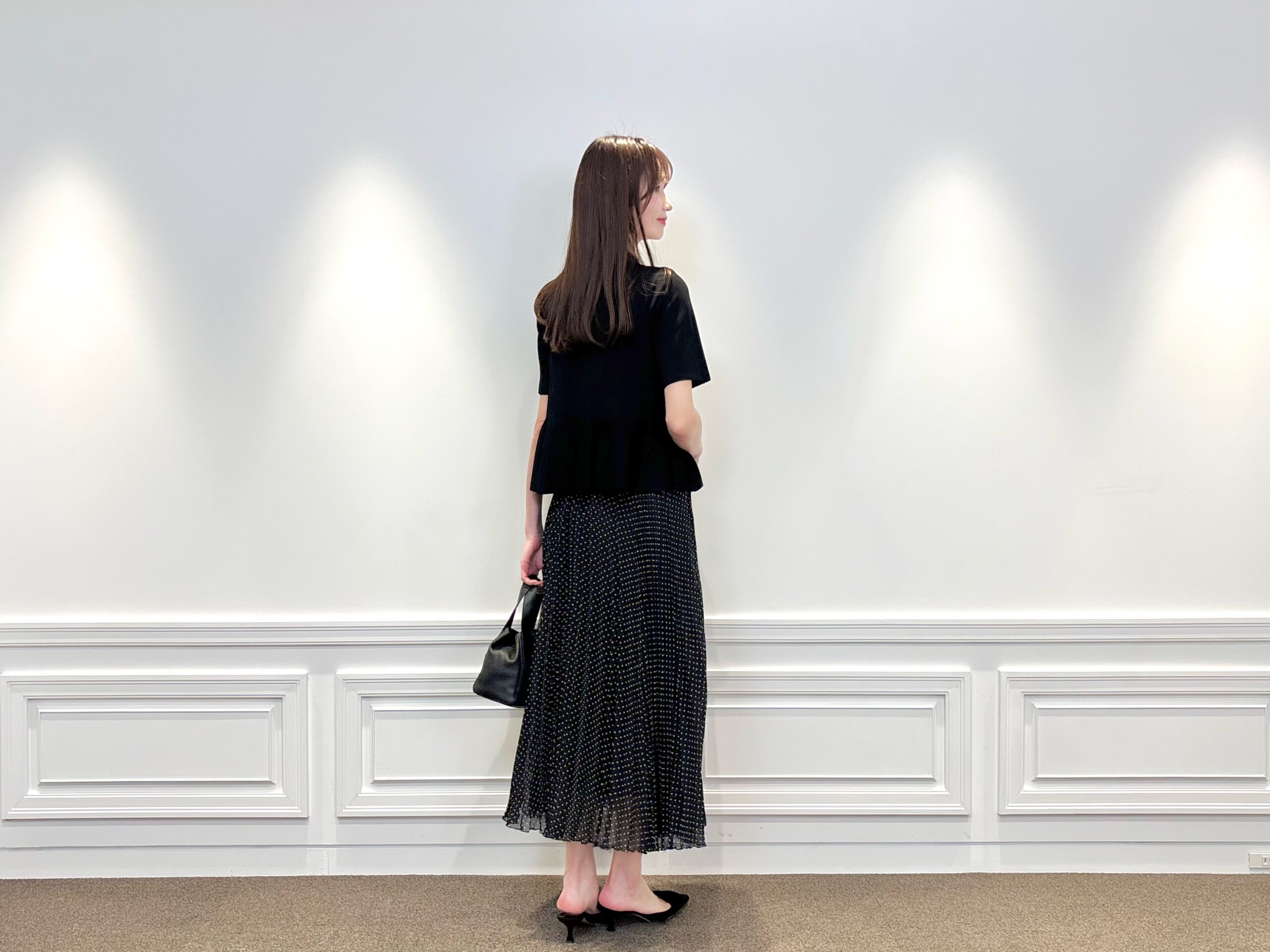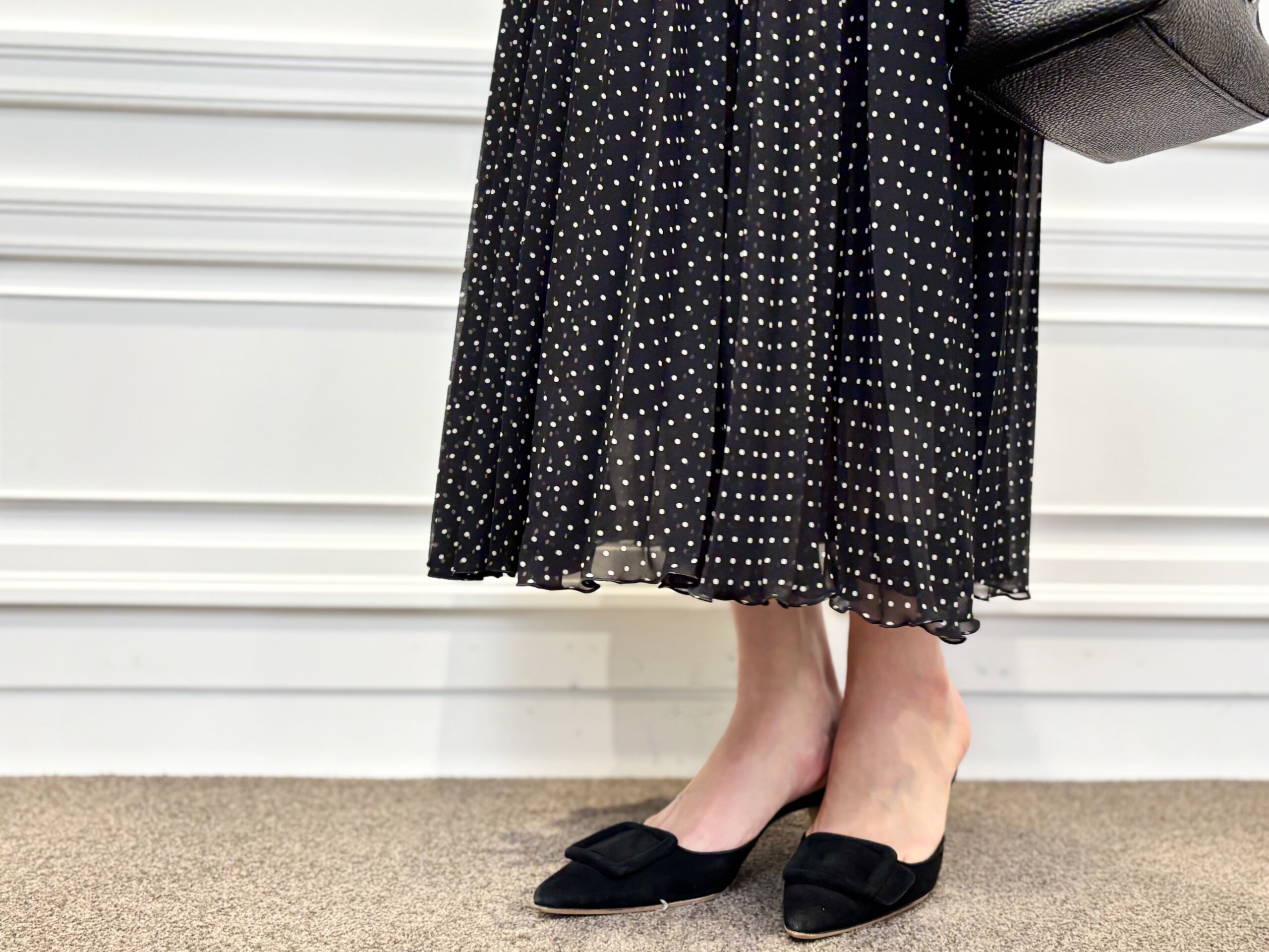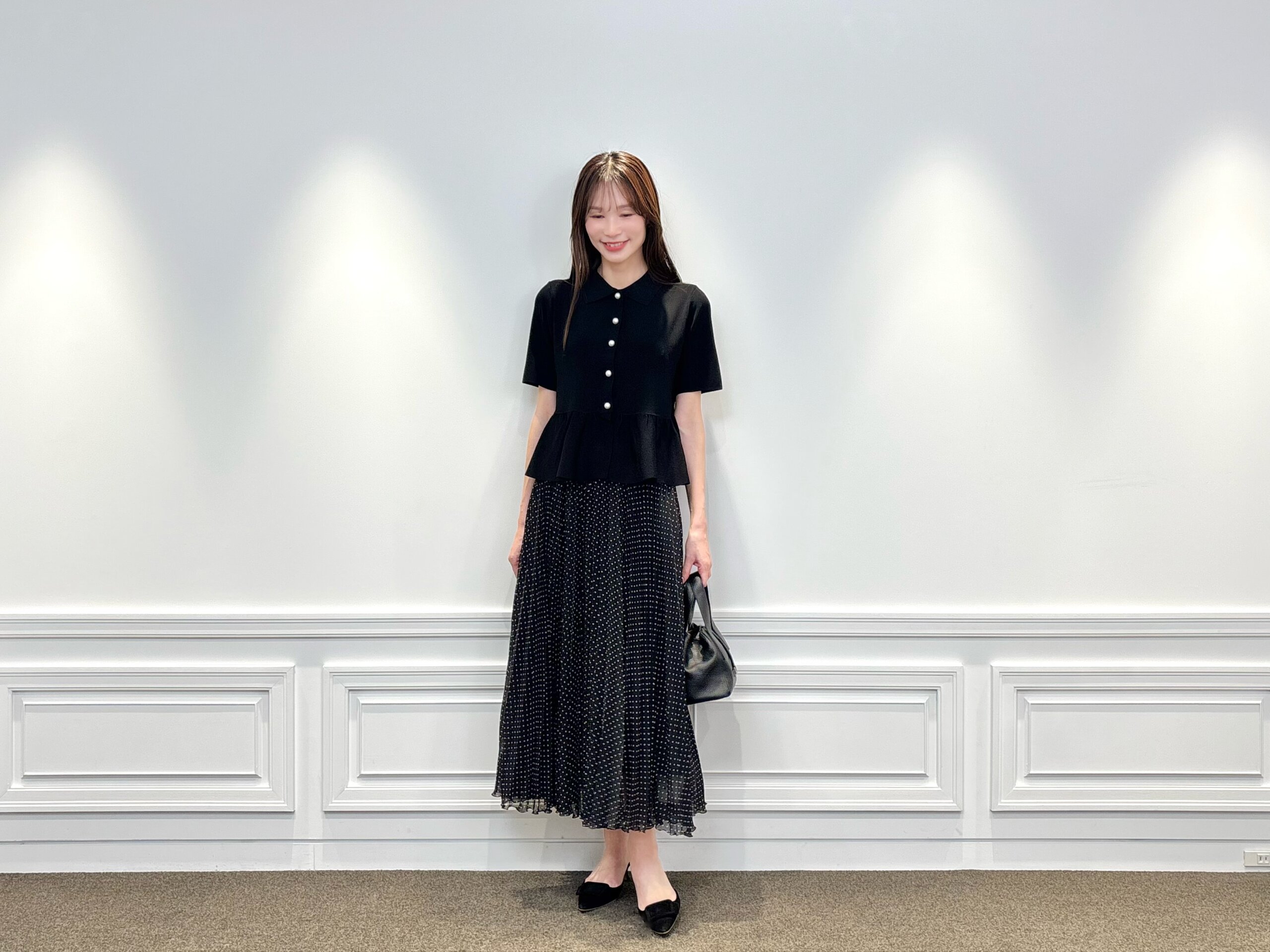 ボトムには、黒地に白の細かなドット柄を配したプリーツスカートを合わせました。軽やかに揺れる細プリーツと繊細なドットが、大人の女性にふさわしい控えめな可愛らしさを演出。モノトーン配色なので甘くなりすぎず、洗練されたフェミニンスタイルが完成します。