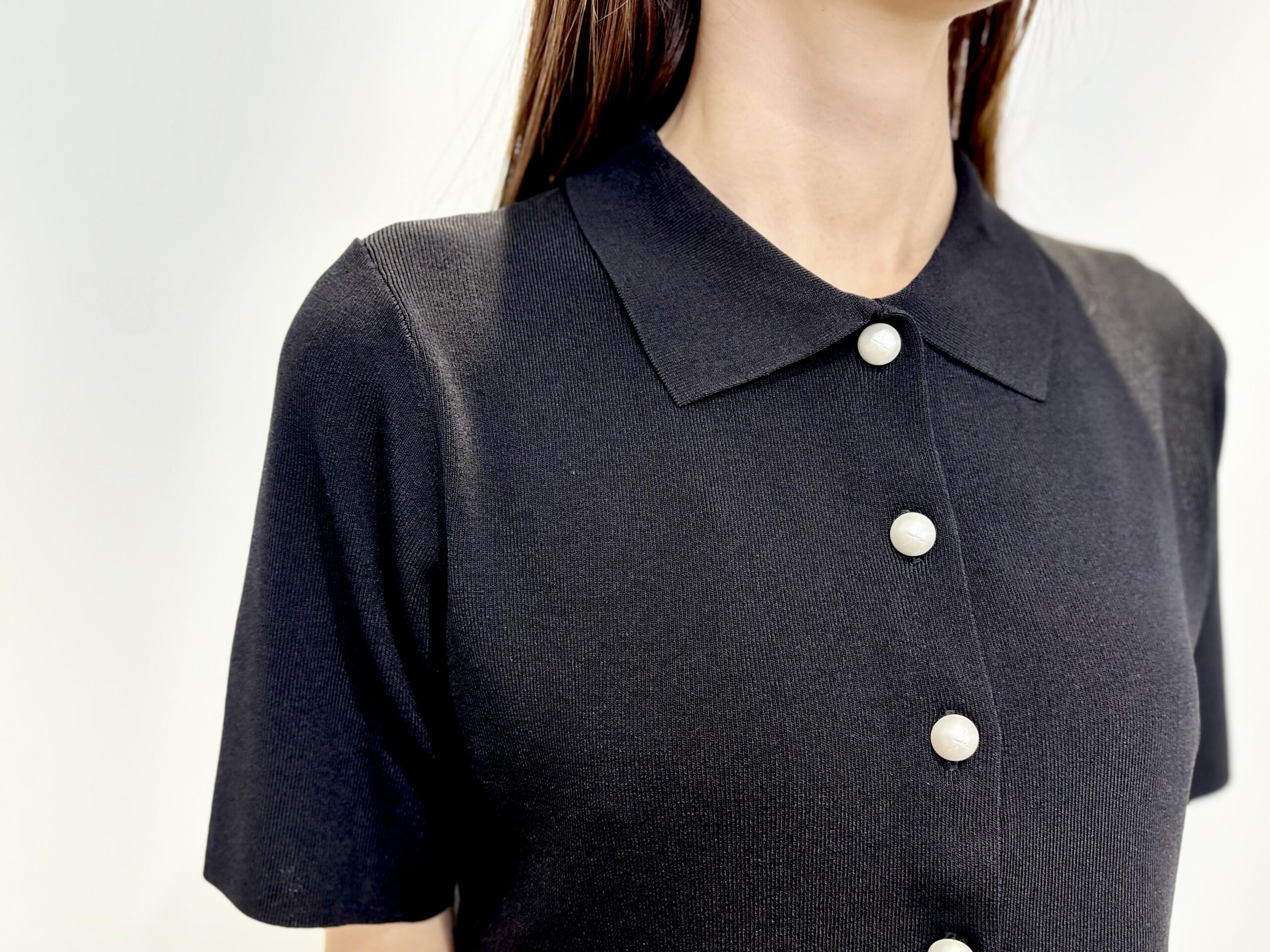 トップスには、きちんと感のある襟付きニットをセレクト。ブラックカラーが全体を引き締めつつ、首元にあしらわれたパールボタンがさりげない華やぎをプラスします。顔まわりを明るく見せてくれるディテールは、アクセサリーいらずでも上品な印象に。