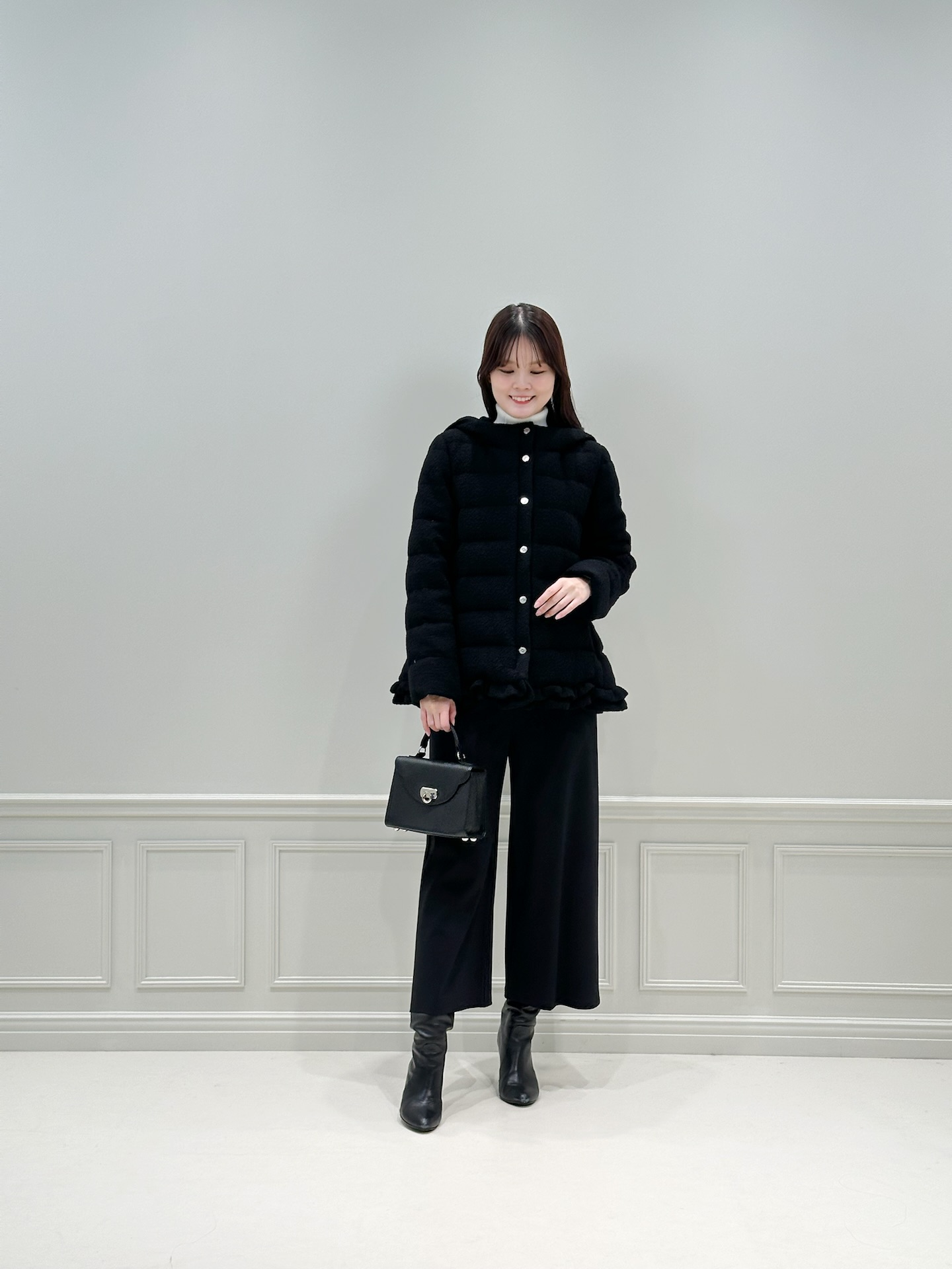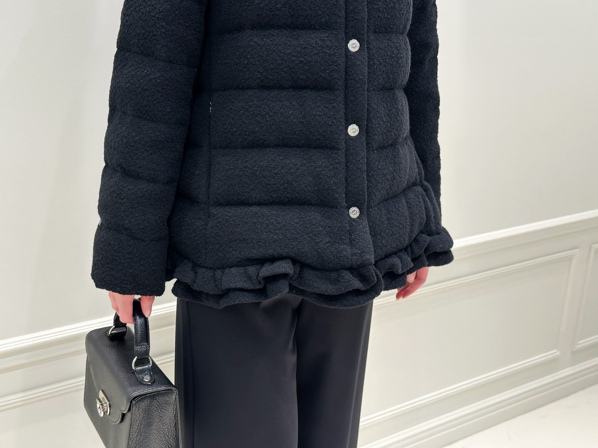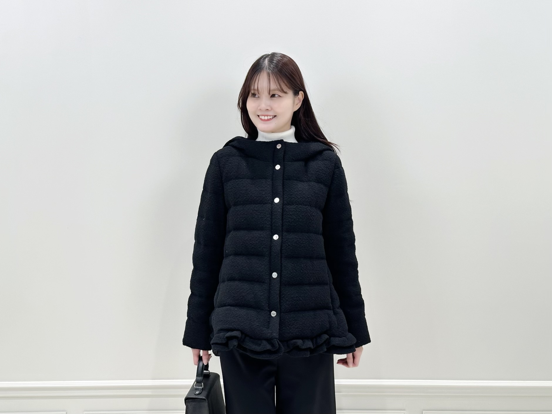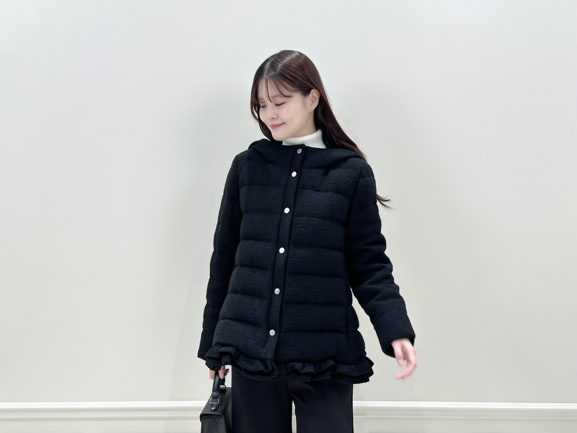ダウンというとカジュアルな印象を持つ方も多いですが、このツイードフリルダウンは、“エレガントに着られる”というのが最大の魅力。