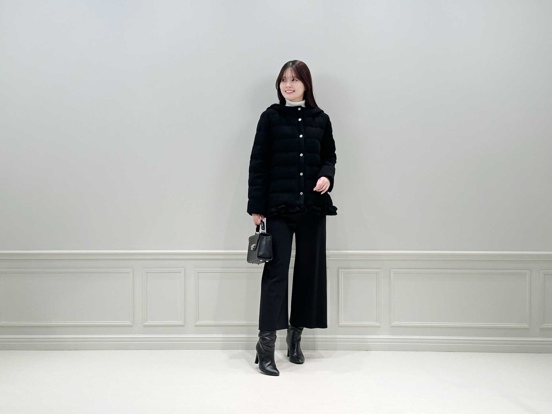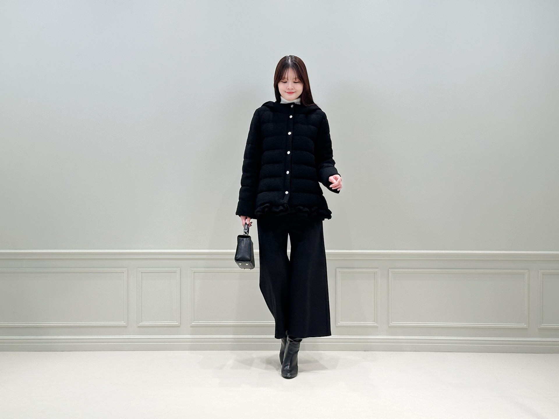 きちんと感のあるモノトーンでまとめた大人の洗練スタイル。暖かさと華やかさを両立した「ツイードフリルダウンコート」を主役にしたコーディネートです!