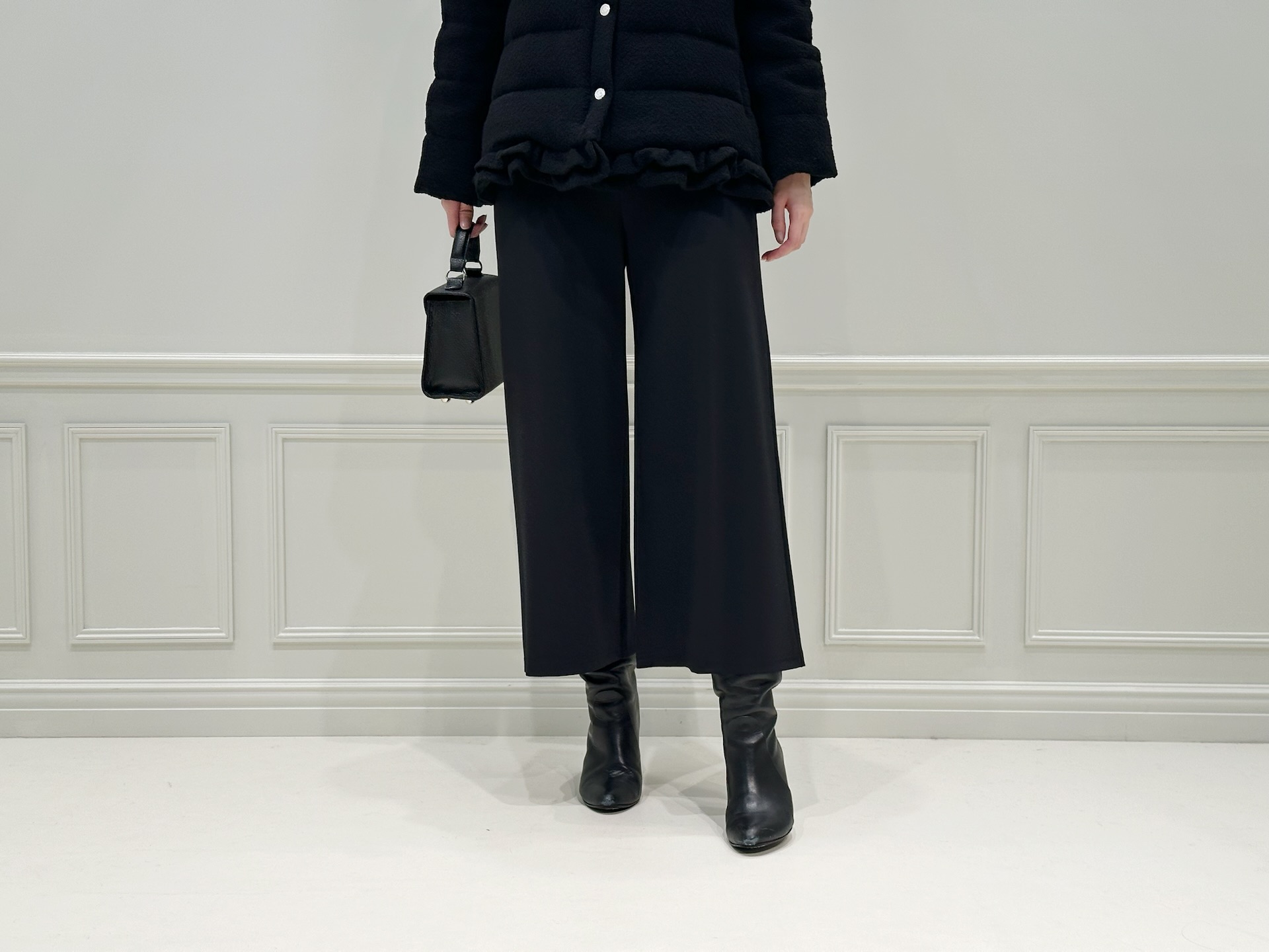 合わせた「ストレッチポンチガウチョパンツ」は、ウエスト総ゴムで快適な穿き心地ながら、美しい落ち感が魅力。ツイードダウンのような主役アウターとも好バランスで、エフォートレスに大人のモノトーンスタイルを完成させてくれます。