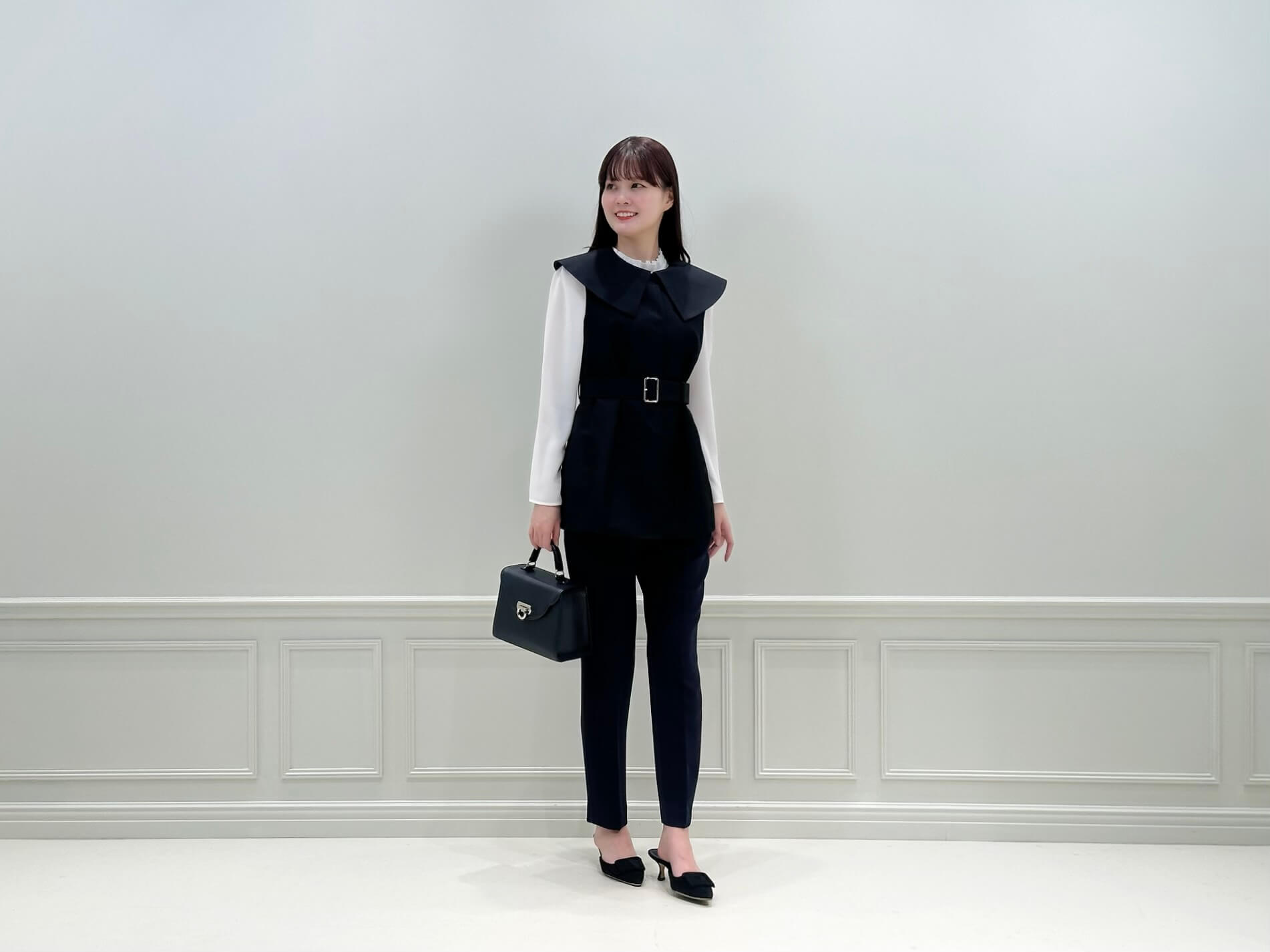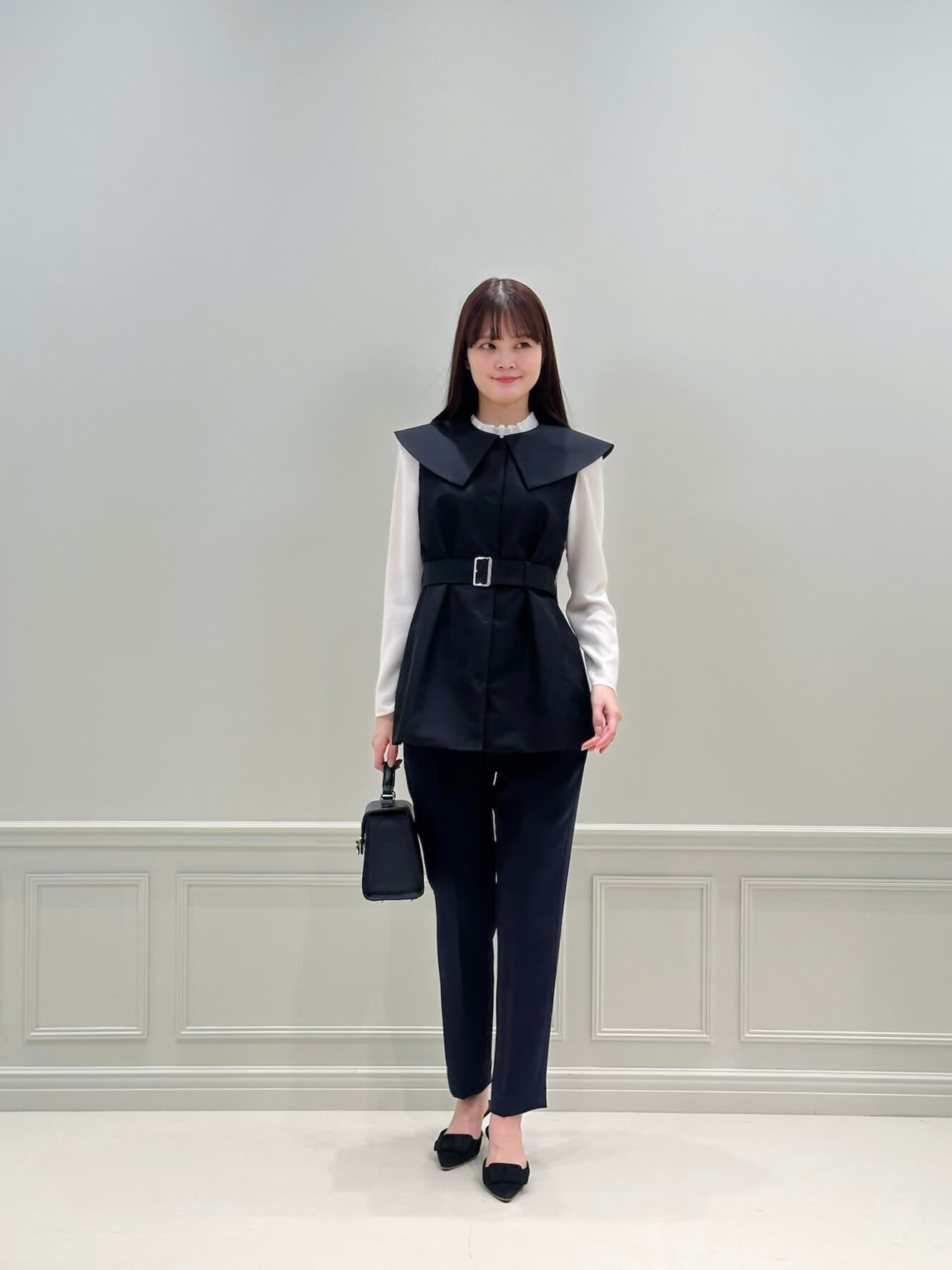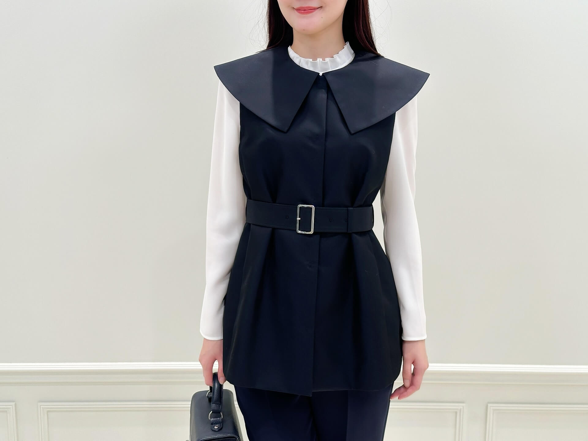 ジレとブラウスの組み合わせは、通勤はもちろん、少しきちんとした場面や会食、学校行事などにもおすすめ。甘さのあるブラウスも、ネイビーのジレを重ねることで大人っぽく引き締まり、程よく上品な印象に仕上がります。