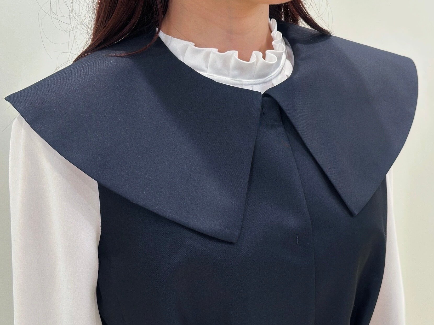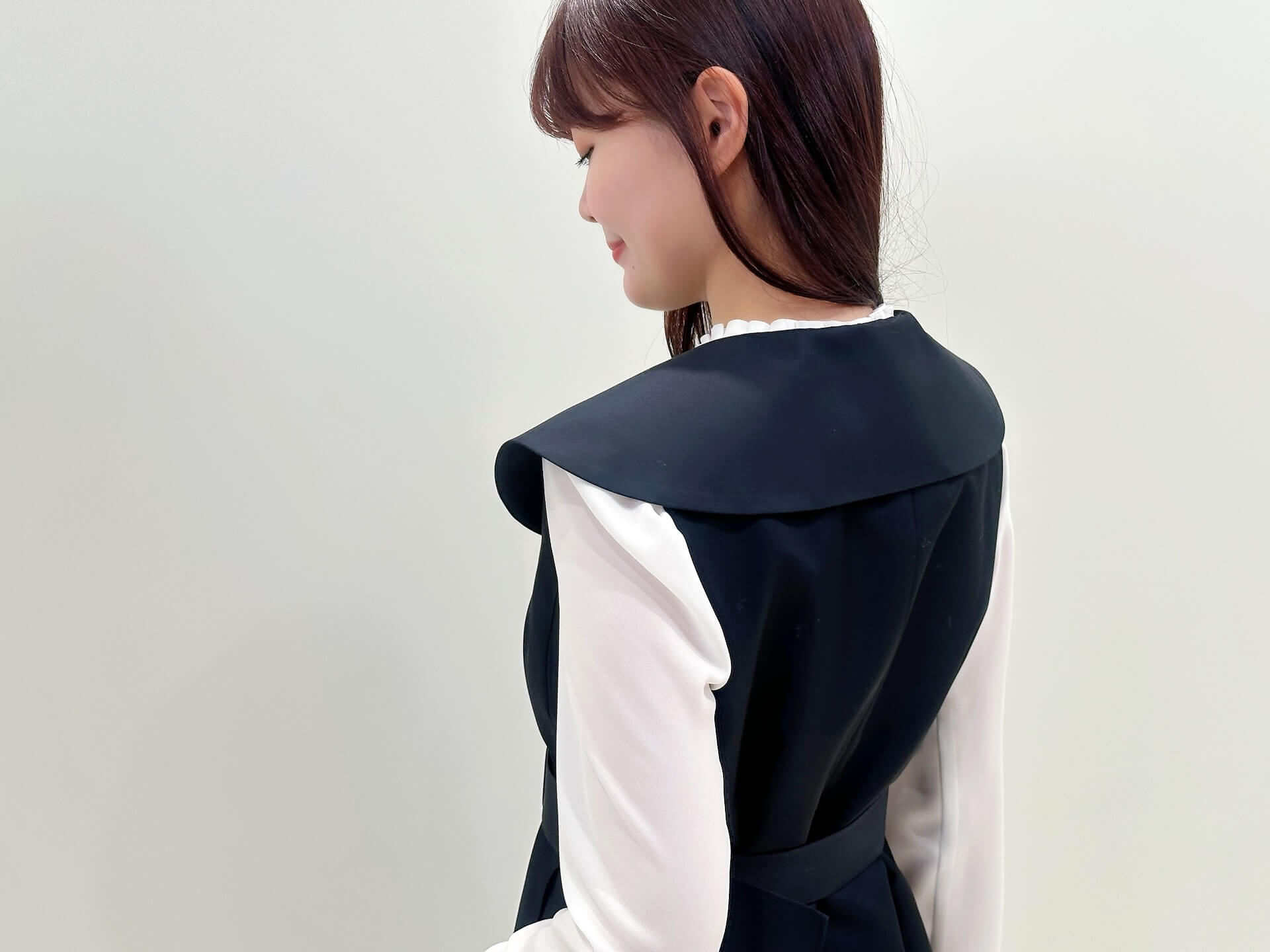 ジレの襟は取り外し可能な仕様になっており、気分やシーンに合わせて印象を変えられるのも魅力のひとつ。後ろまでしっかりと続くデザインなので、バックスタイルまで抜かりなく可愛く決まり、どの角度から見ても完成度の高い一着です!