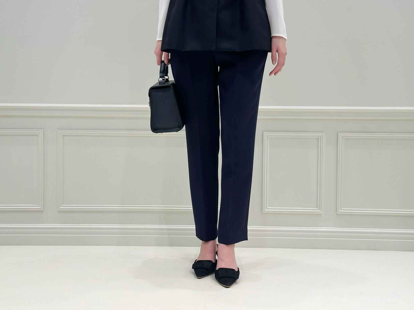 ボトムには、センプレのネイビーパンツをセレクト。ジレと同色でまとめることで、縦のラインが強調され、全体がすっきりとした印象に。