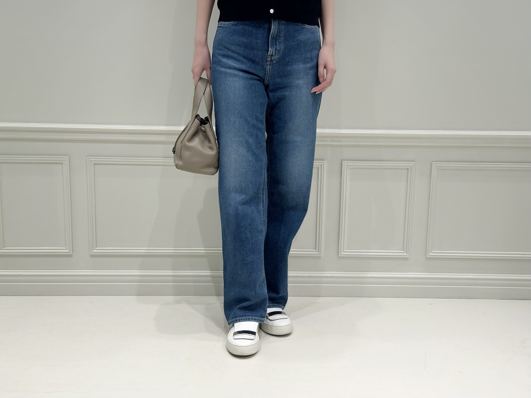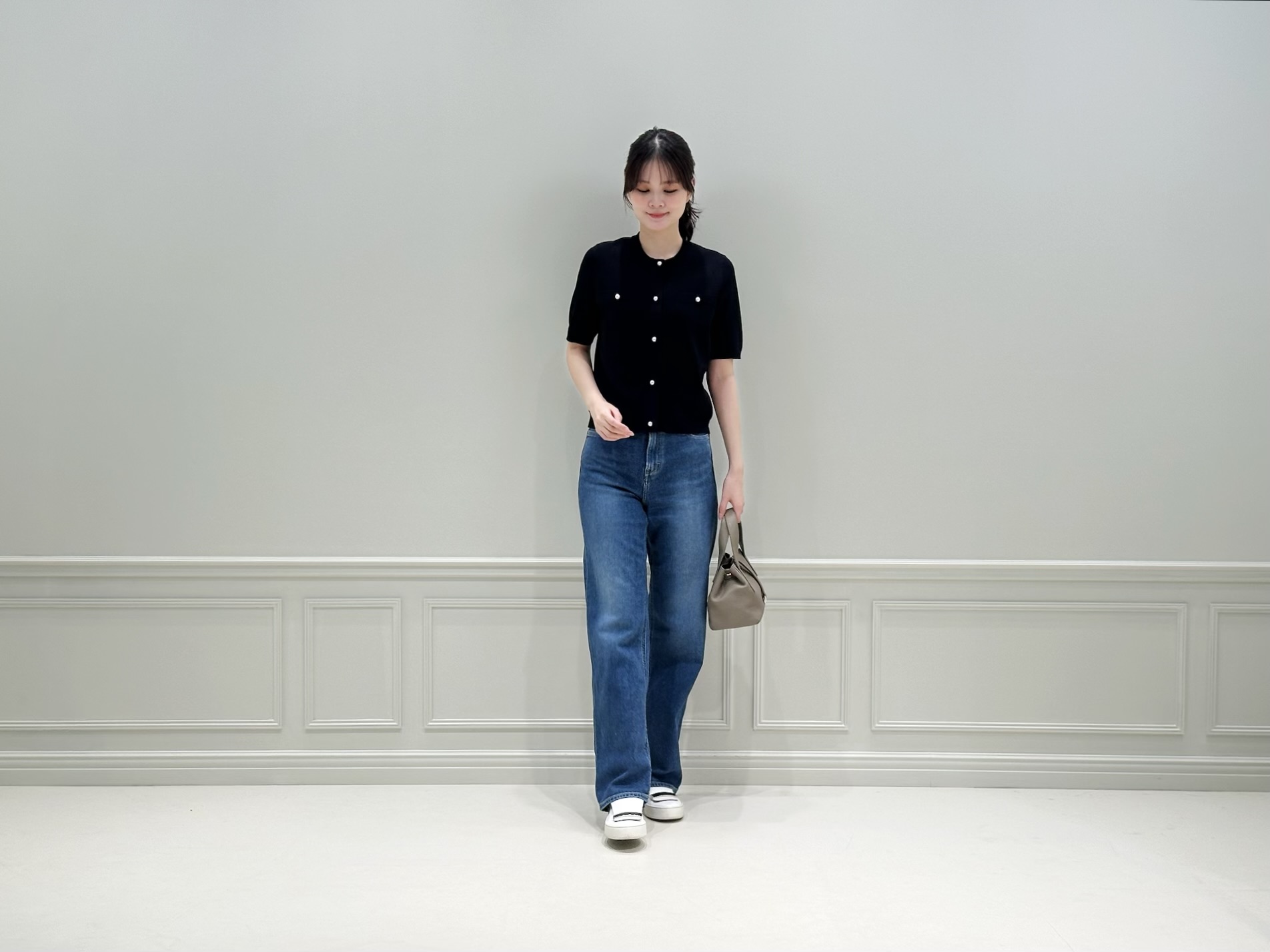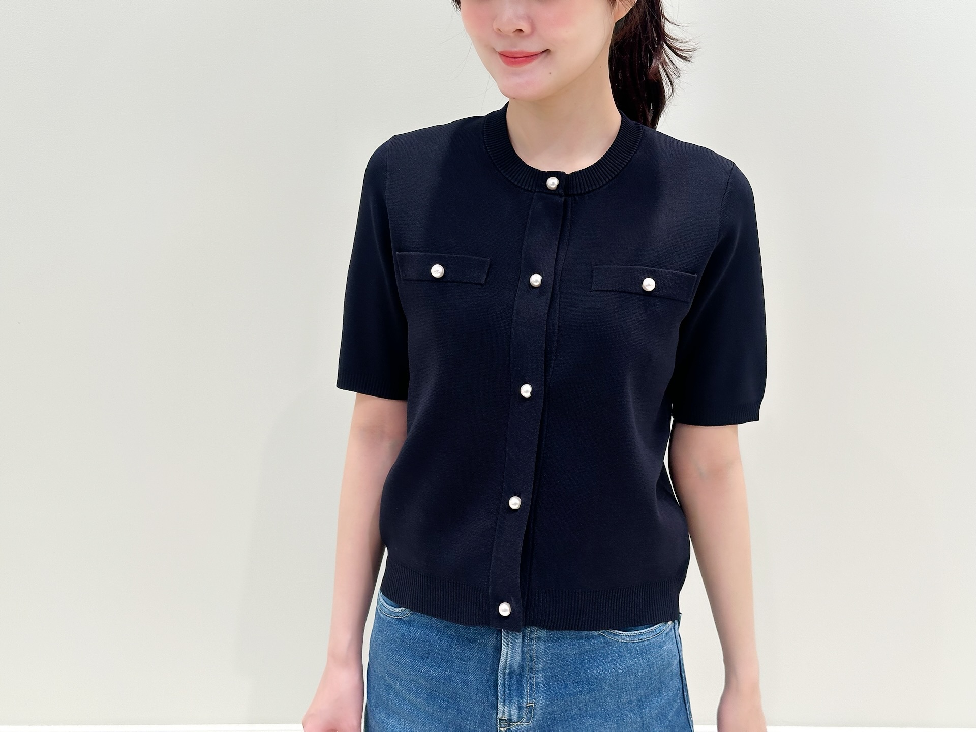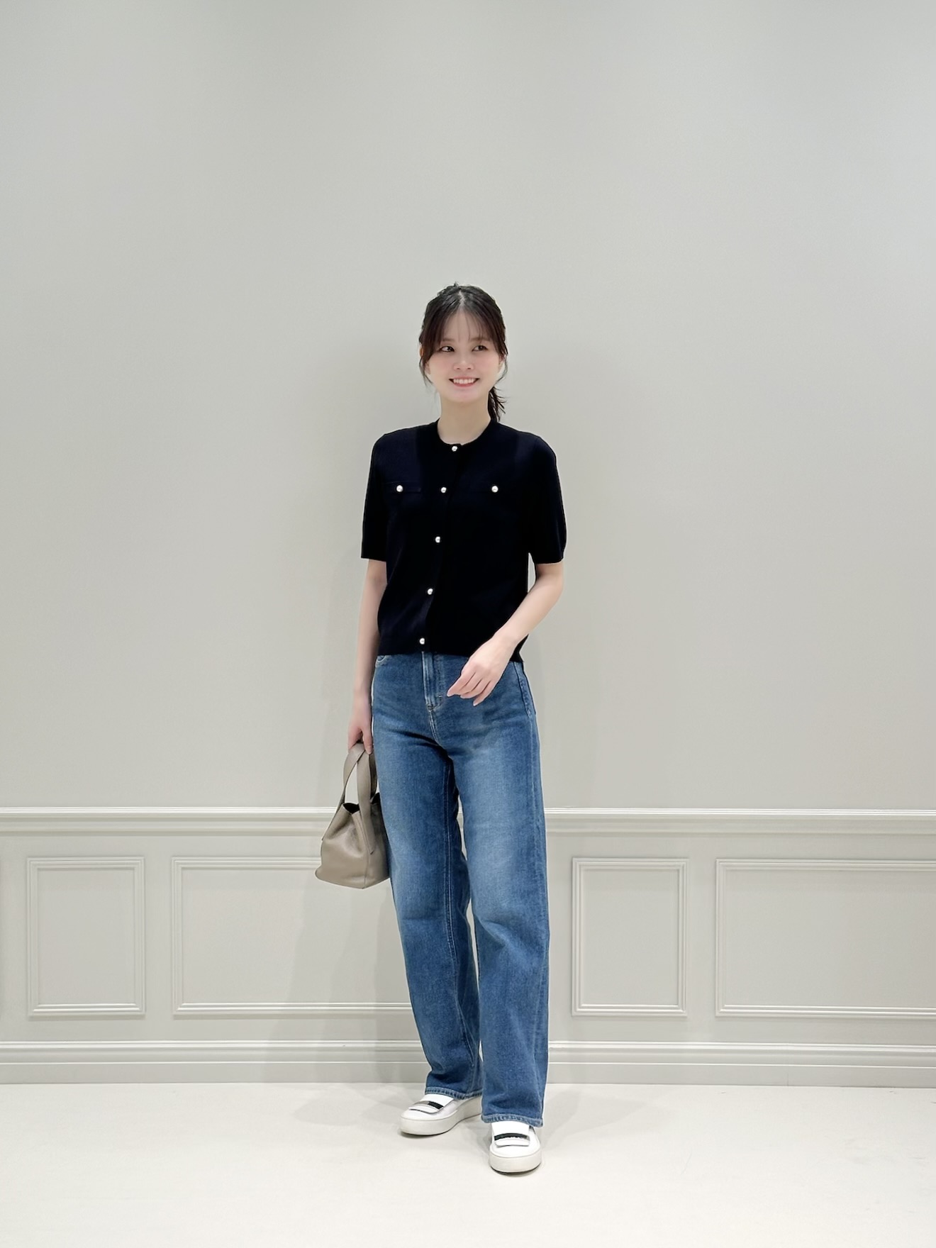 トップスの上品なネイビーがコーディネートをきれいめにまとめてくれるため、デニムを合わせてもラフになりすぎず、大人のカジュアルスタイルが完成します。足元はスニーカーで軽やかにまとめ、デイリーに取り入れやすいリラックス感のあるスタイリングにしました!