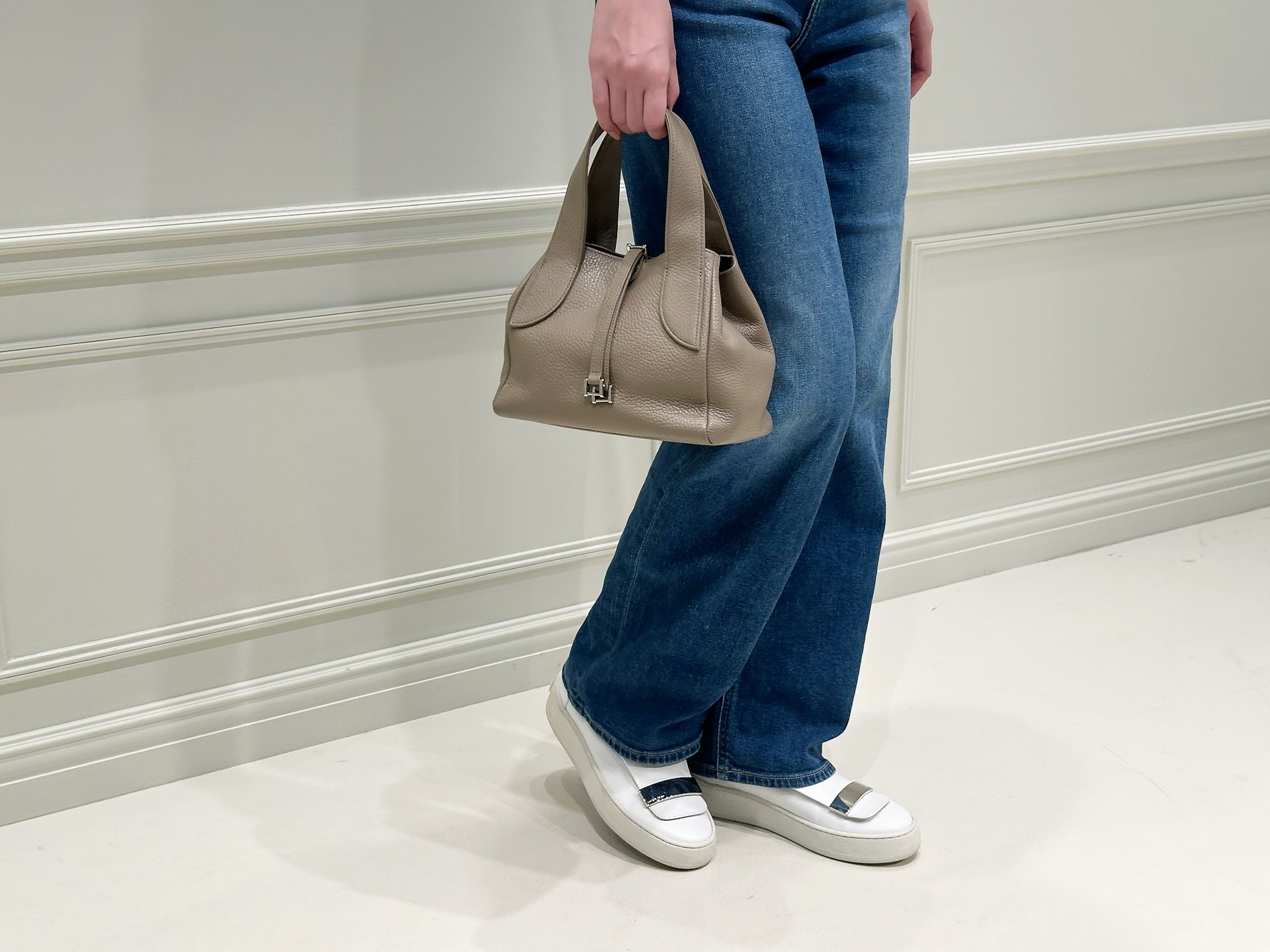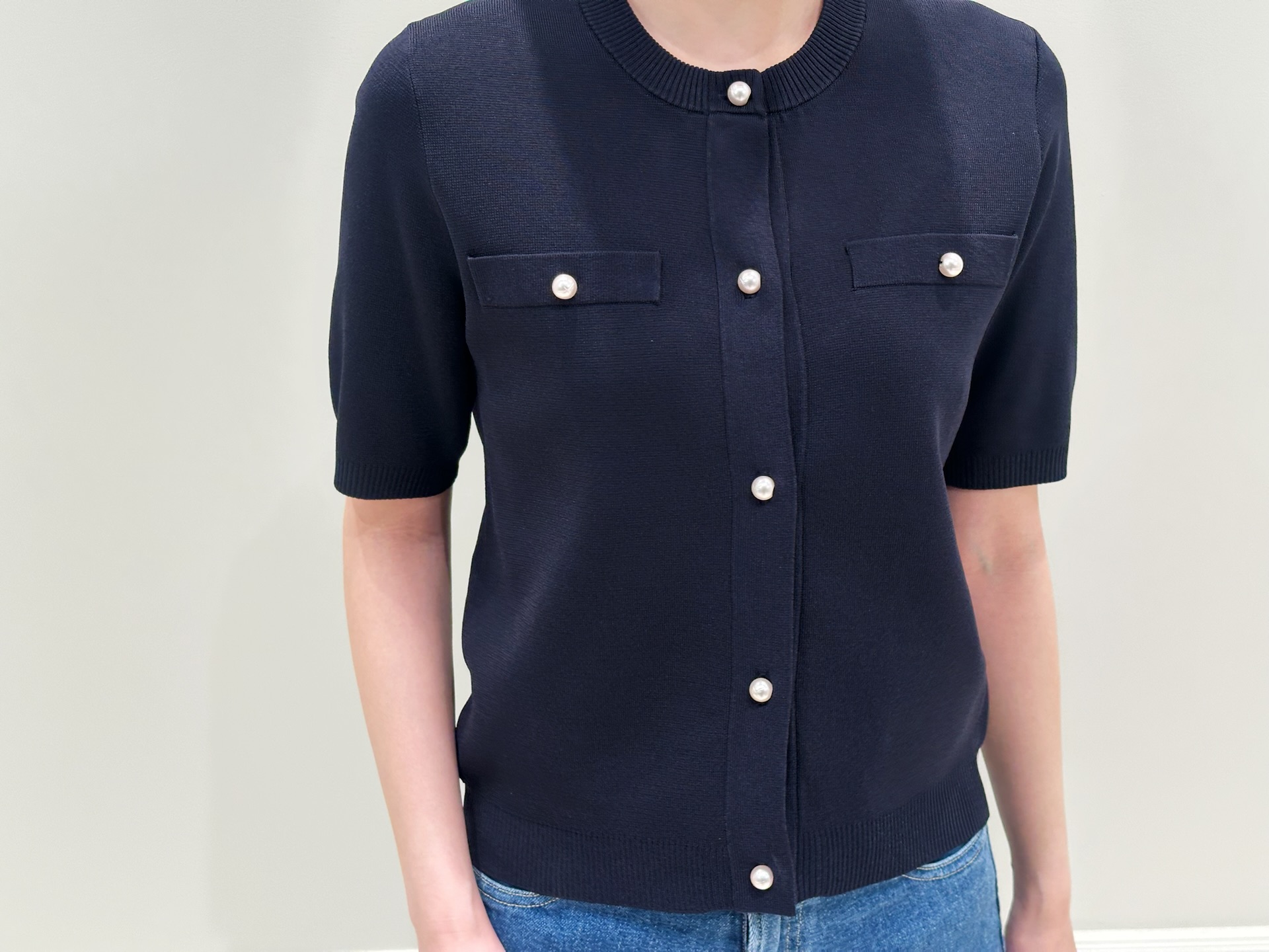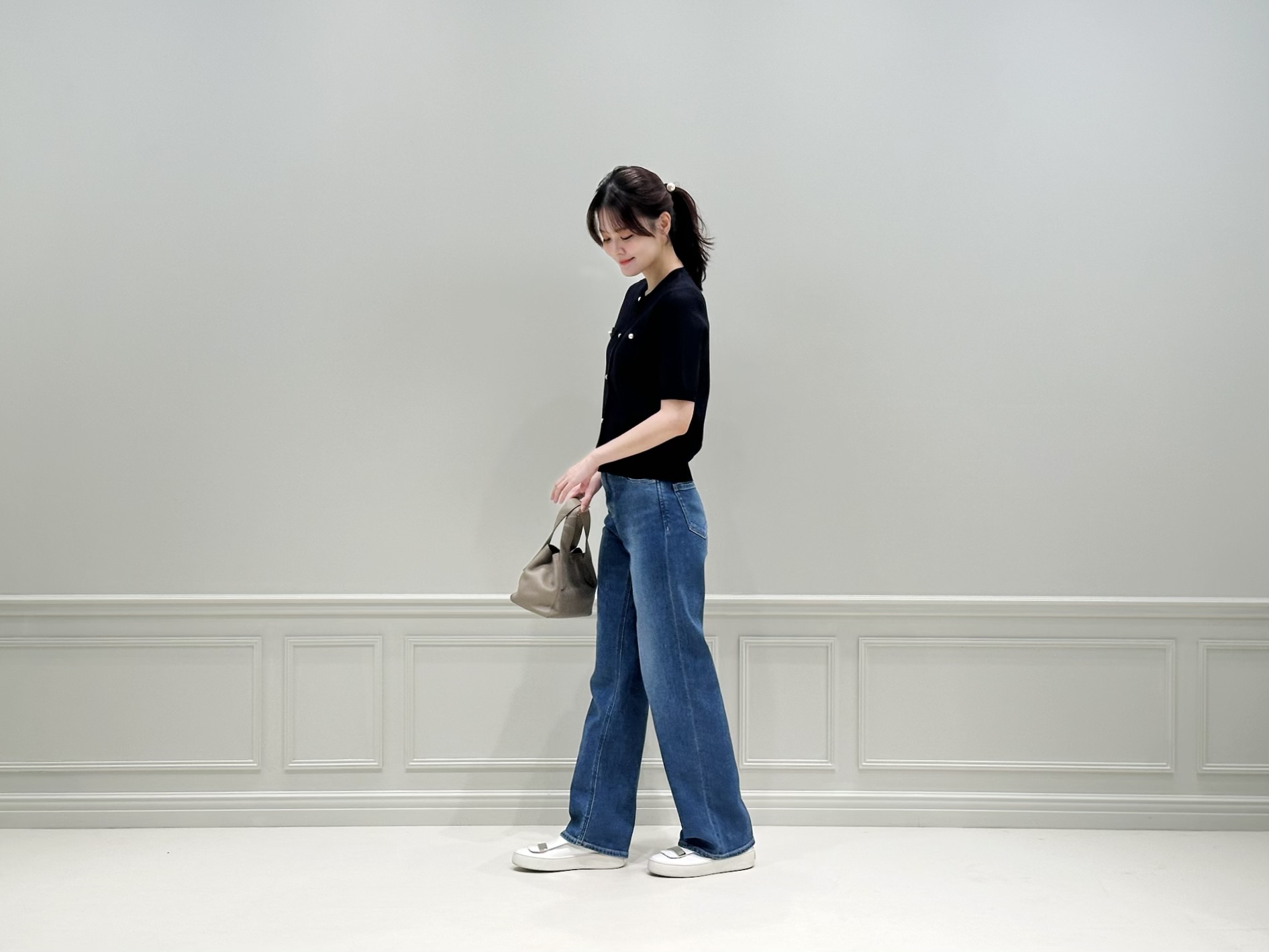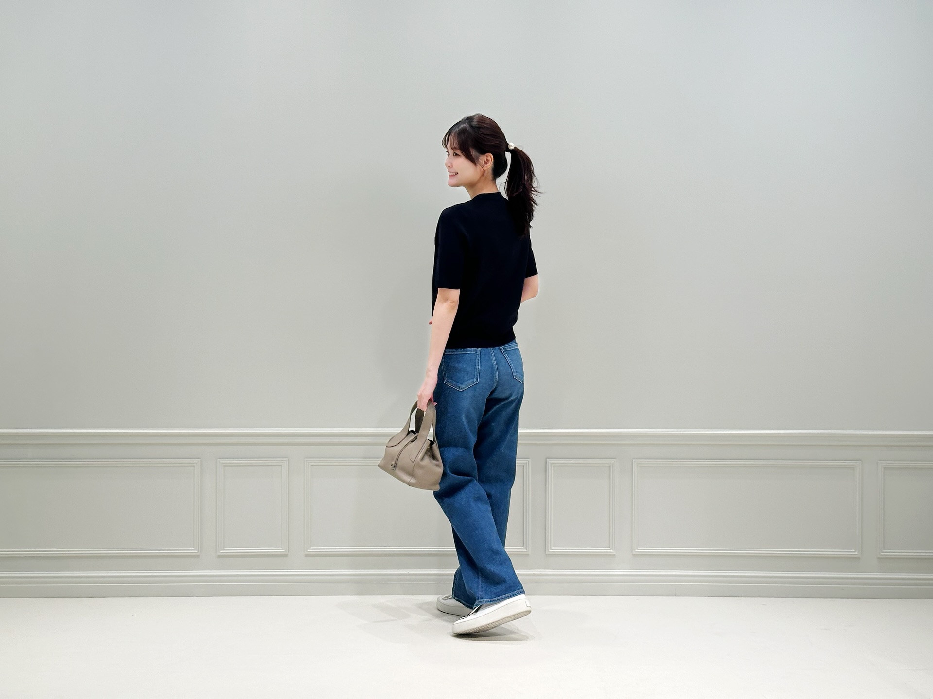 トップスの上品なネイビーがコーディネートをきれいめにまとめてくれるため、デニムを合わせてもラフになりすぎず、大人のカジュアルスタイルが完成します。足元はスニーカーで軽やかにまとめ、デイリーに取り入れやすいリラックス感のあるスタイリングにしました!