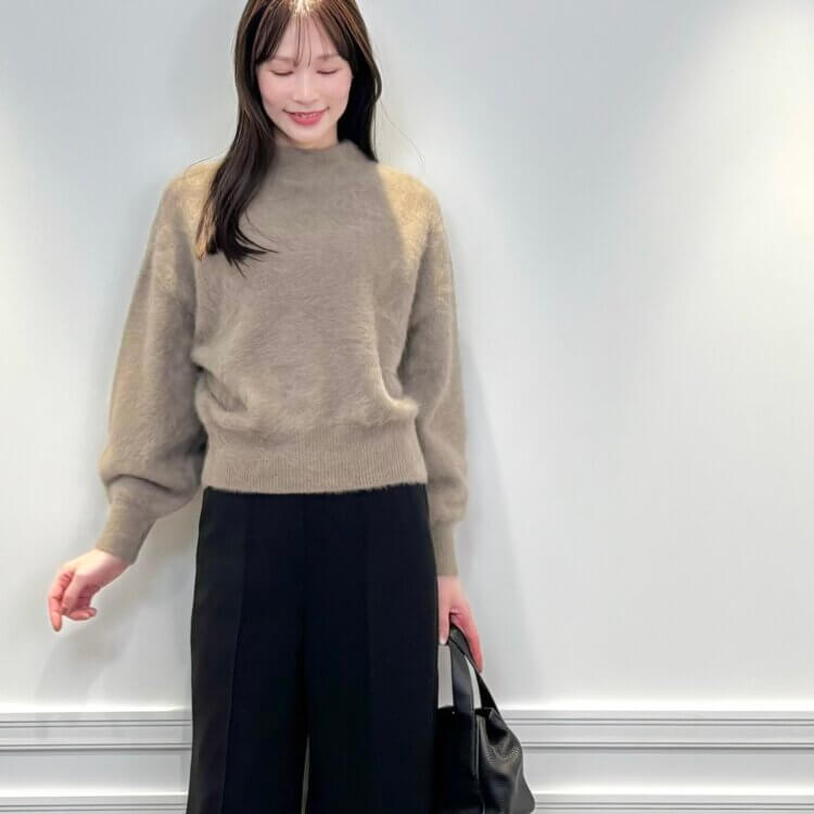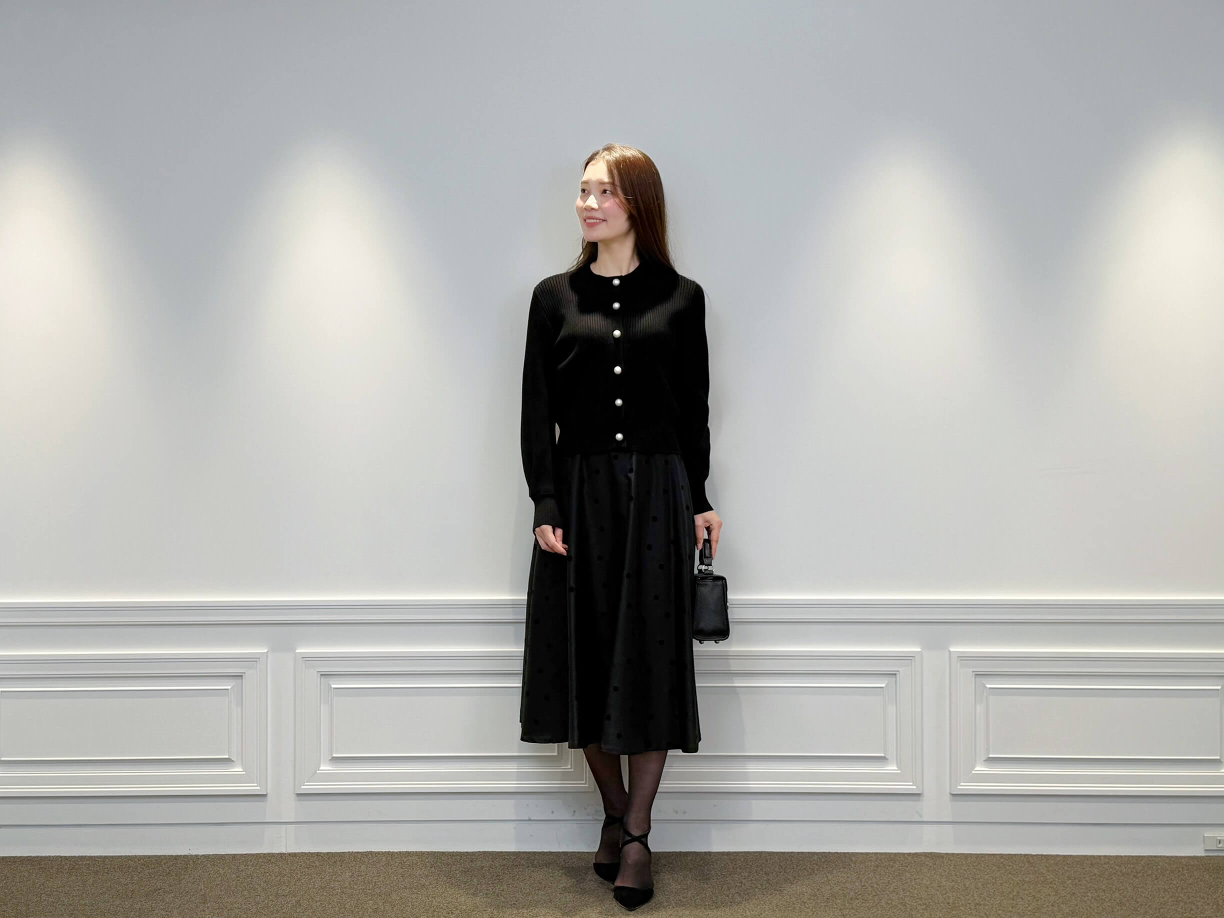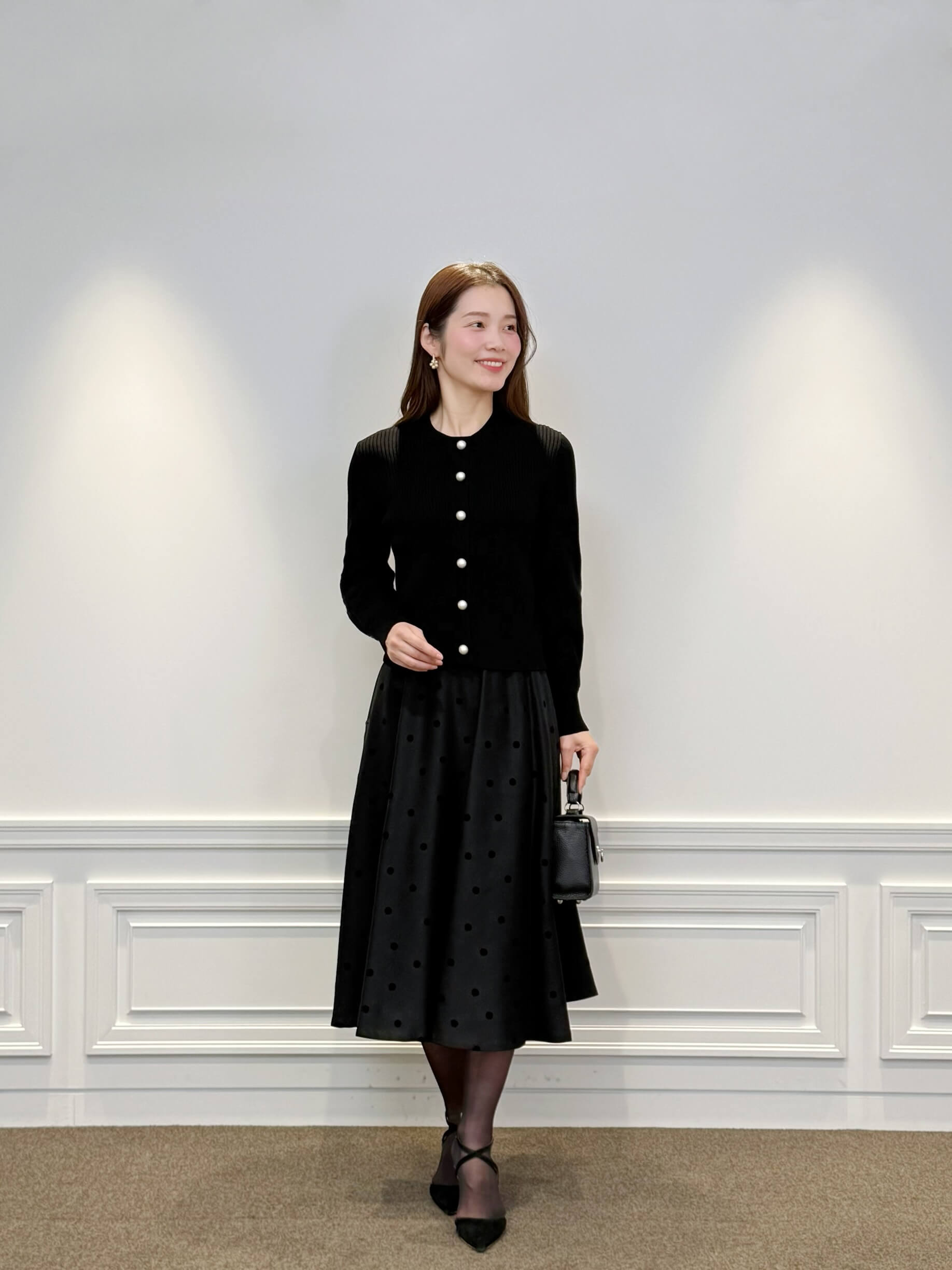ブラックを基調にしながらも、素材感とディテールで奥行きを持たせた、大人のためのエレガントな装いです。トップスには艶やかなパールボタン、ボトムには立体感のあるドット柄を取り入れ、単調にならない表情を演出。黒のパンプスを合わせることで、全体をより引き締め、きちんと感のある佇まいに仕上げました。オンにもオフにも対応できる、品格あるブラックスタイルです。