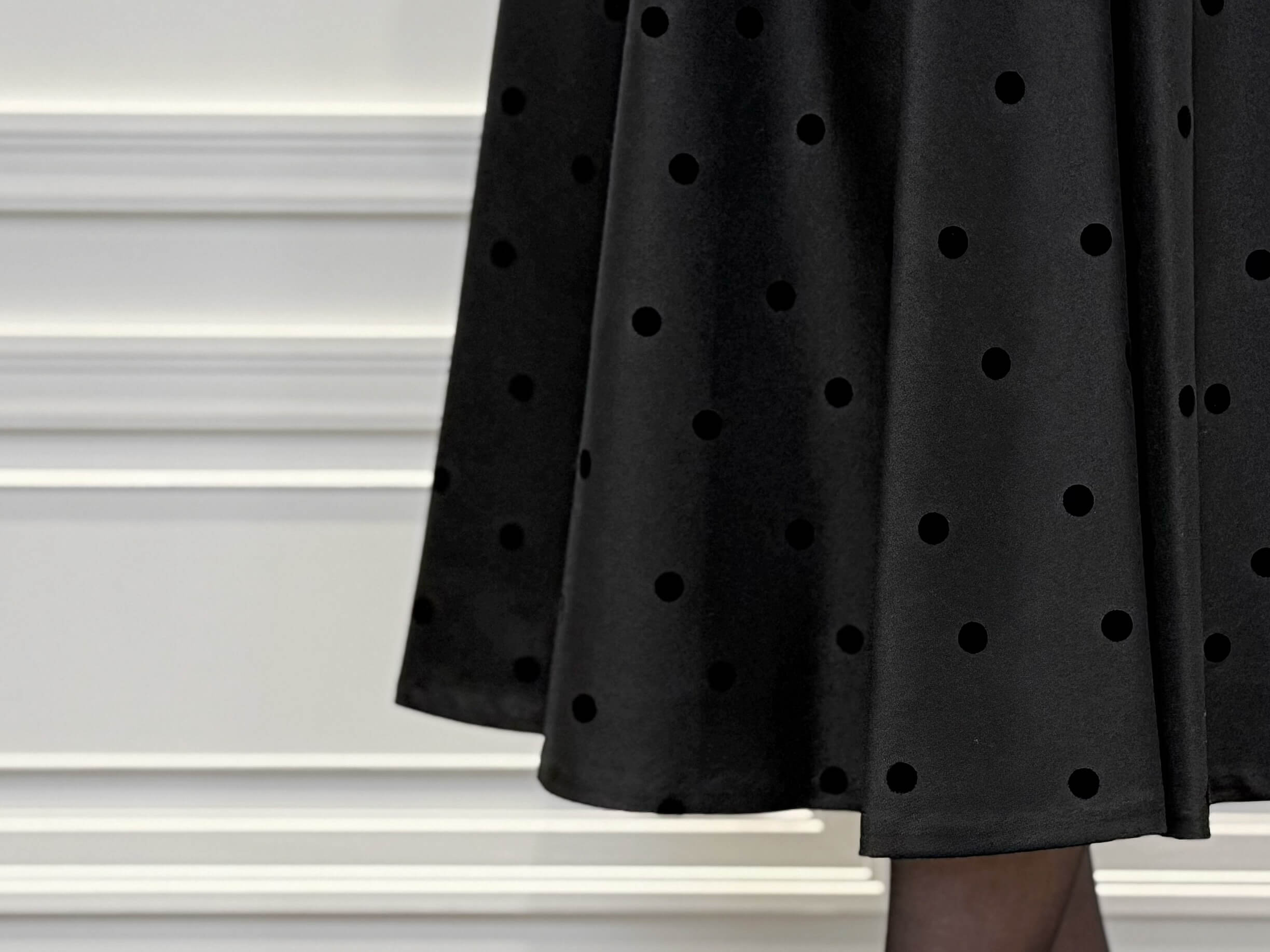 <フロッキードットフレアスカート>は、立体的なフロッキードットがブラックスタイルに奥行きをもたらす存在感のある一着。動くたびに美しく揺れるフレアシルエットが、女性らしい柔らかさを演出します。シンプルなトップスと合わせるだけで装いが完成し、オールブラックでも重く見えない、洗練されたバランスを叶えてくれます。