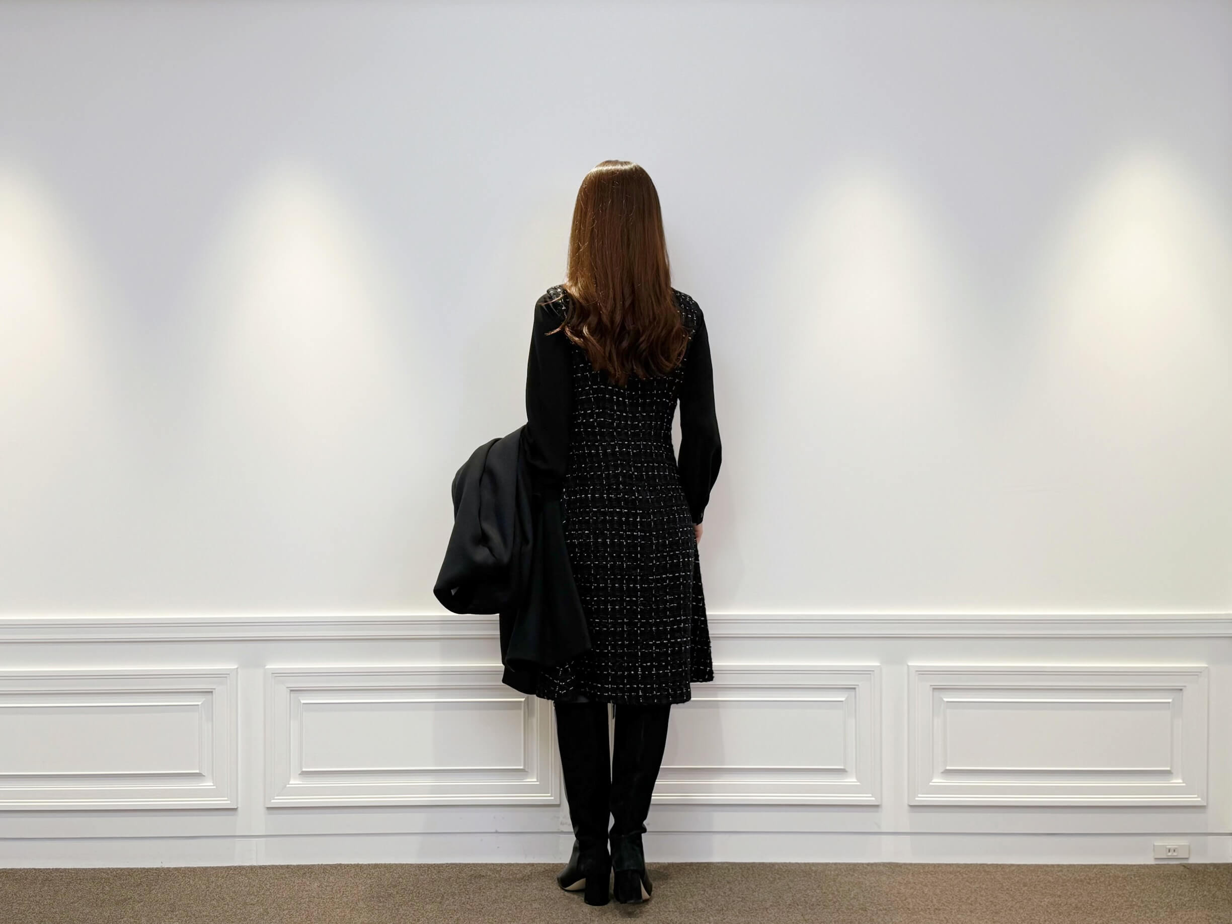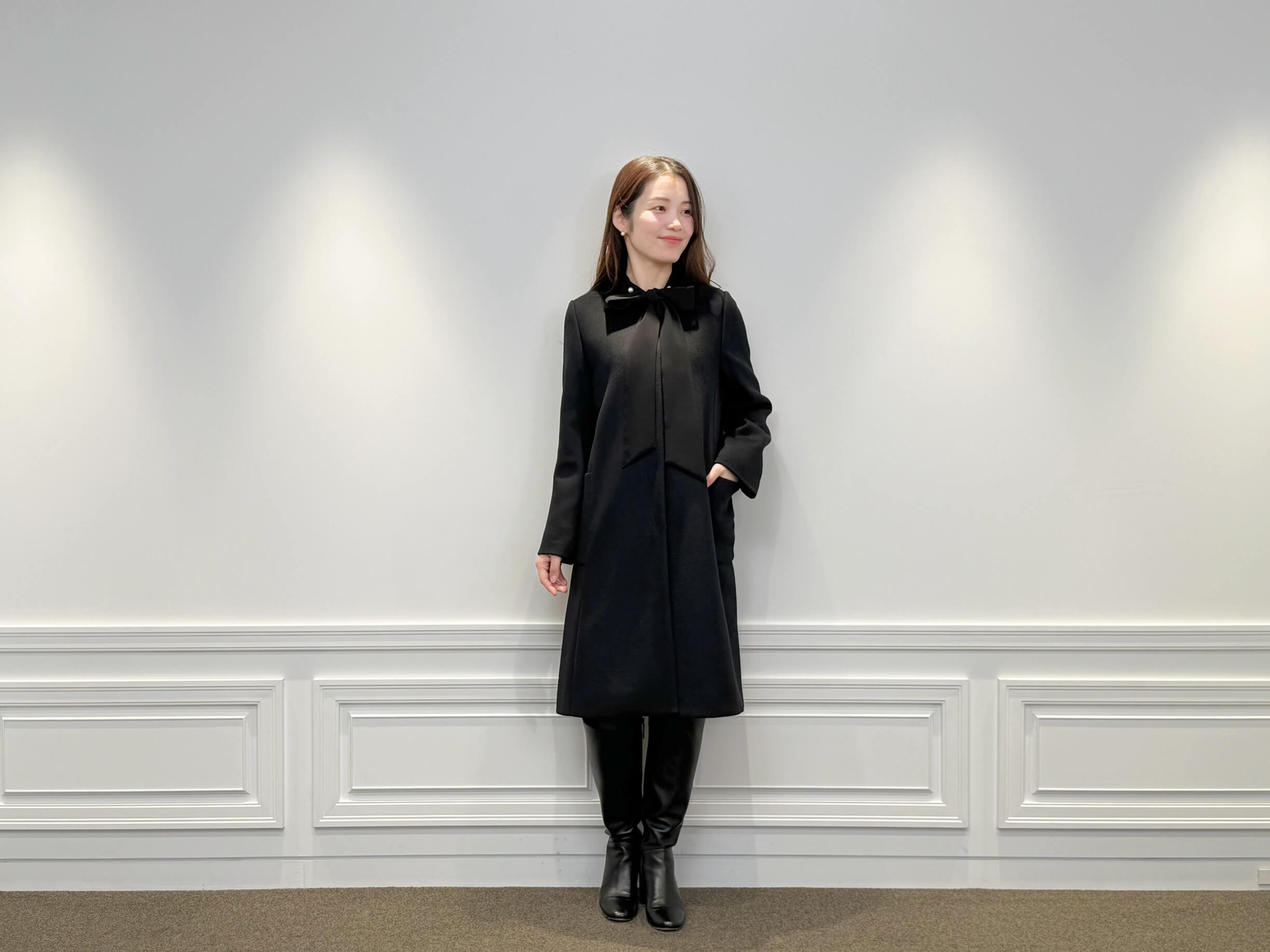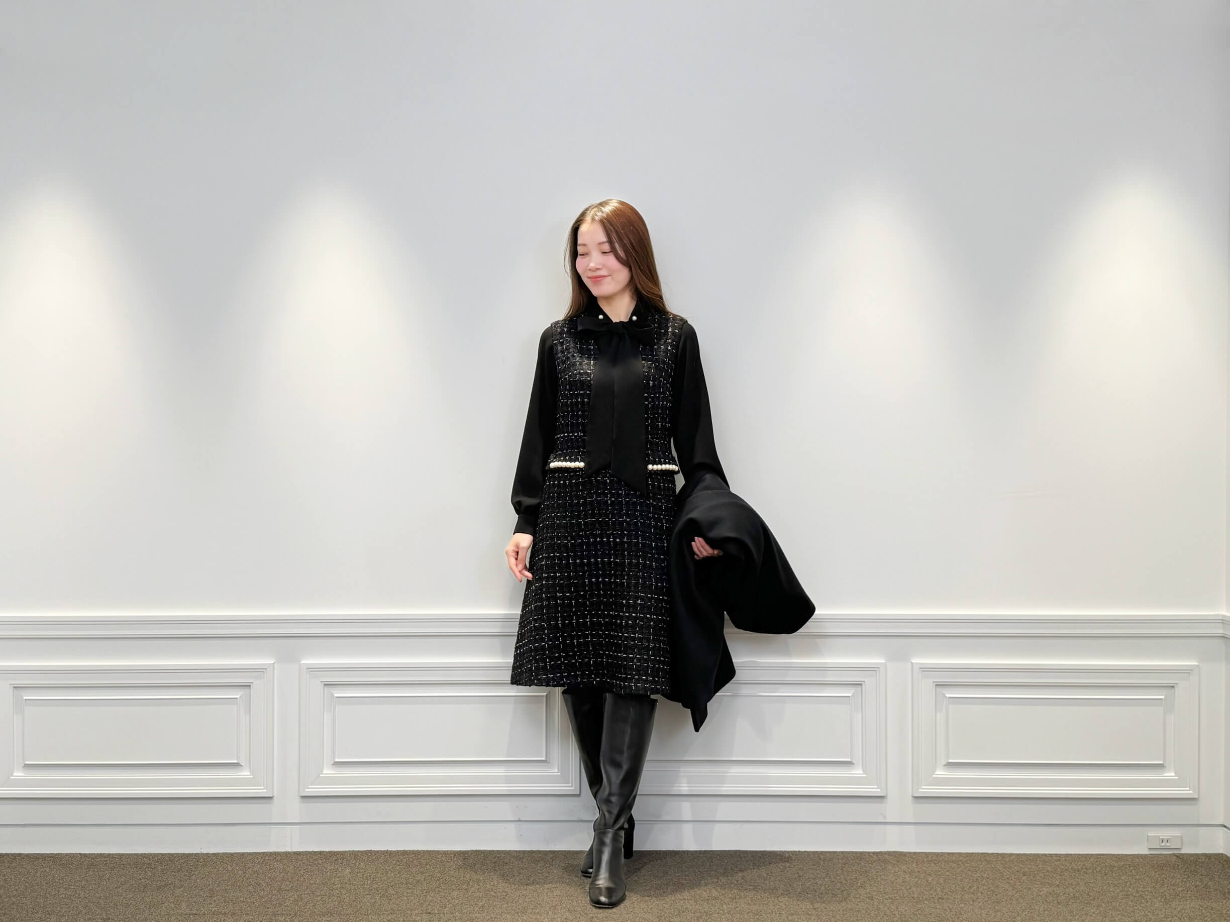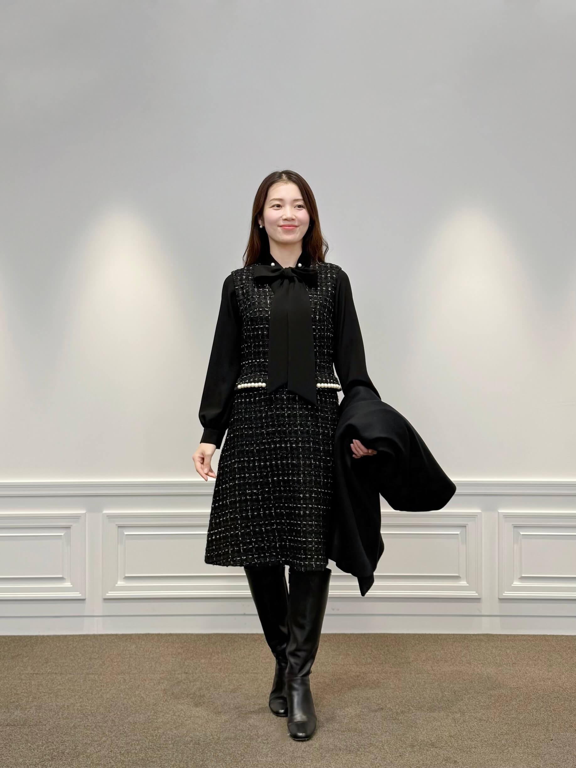 奥行きのあるツイードワンピースに、繊細なリボンタイブラウスを重ねることで、黒を基調としながらも華やぎのある表情を演出。上質なウール素材を使用したノーカラーコートが全体を凛とまとめ、縦のラインを際立たせるロングブーツがスタイルの完成度を高めます。