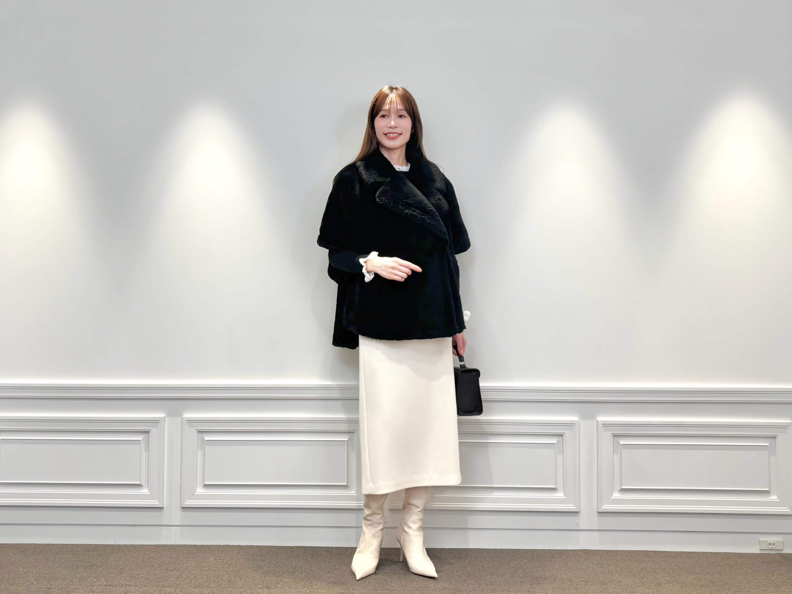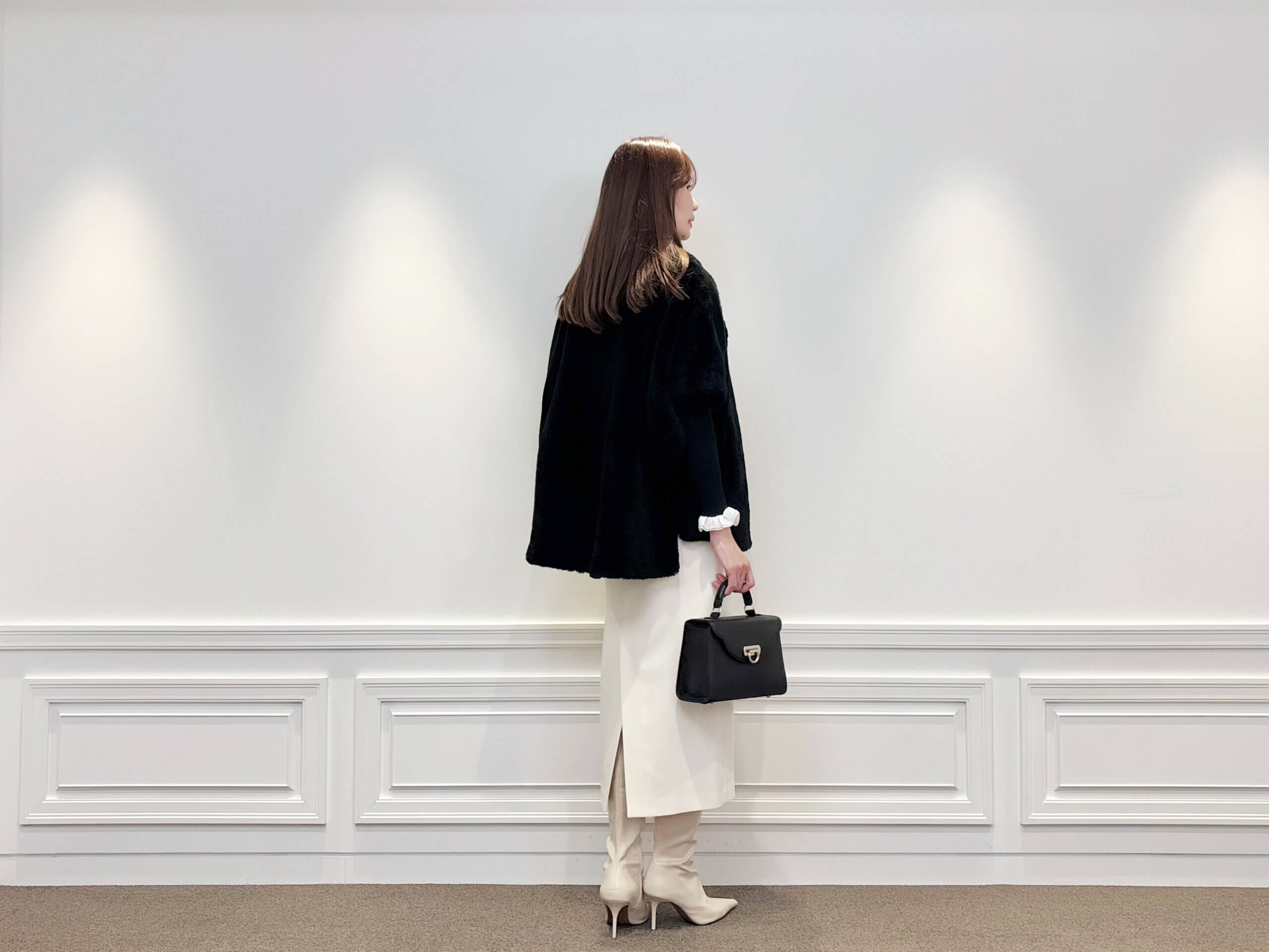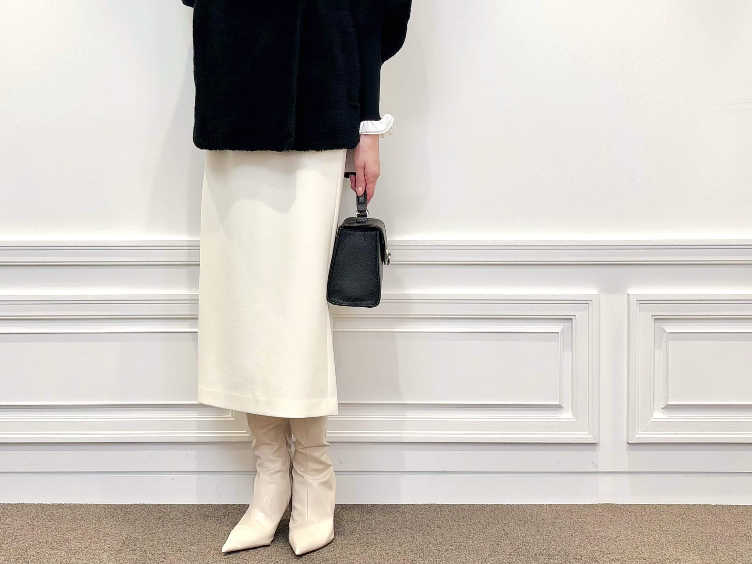 ボトムは、白のタイトスカートとロングブーツでクリーンにまとめ、ブラックとのコントラストが際立つモノトーンコーデに。