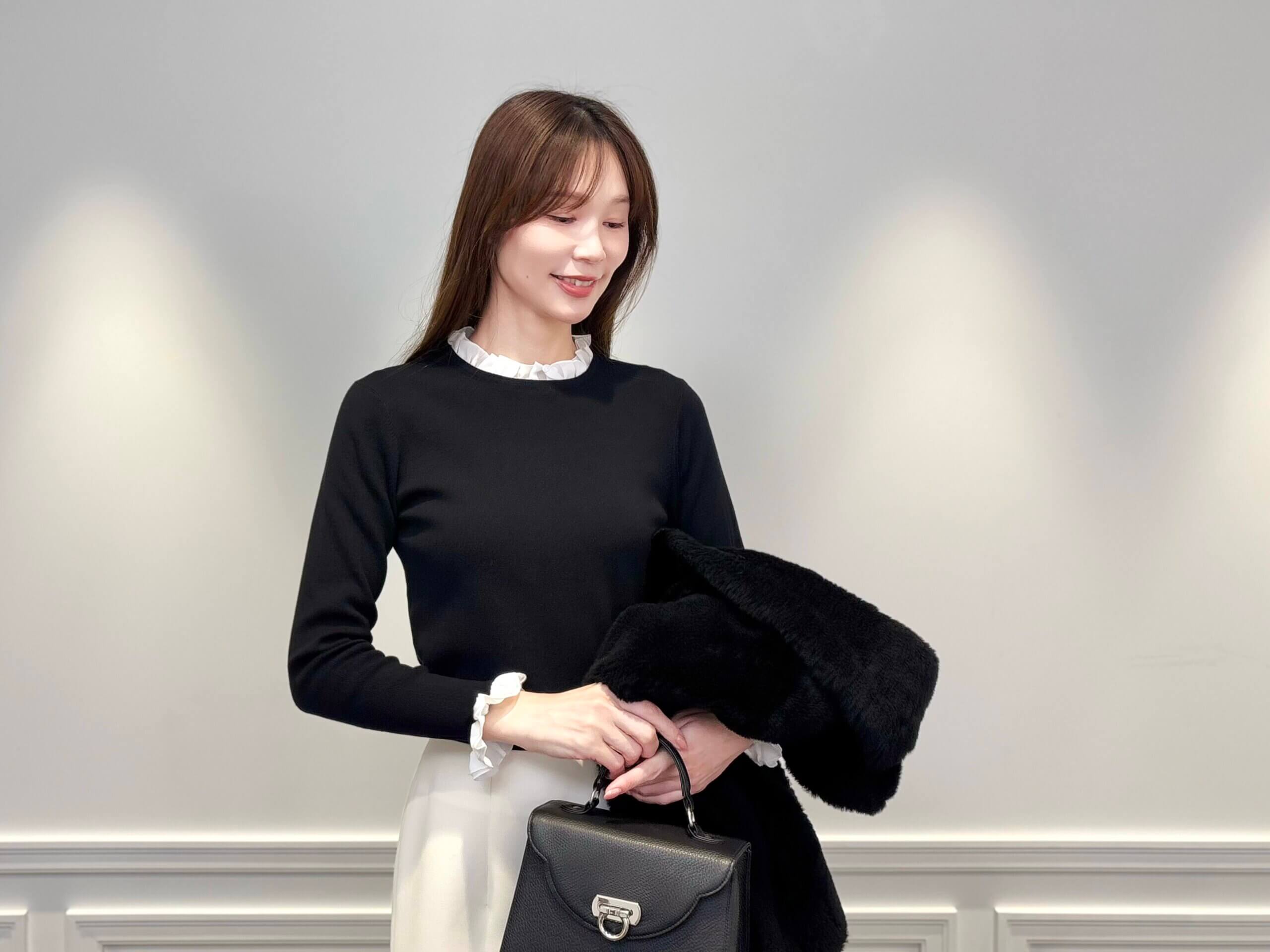インナーには、首元と袖口にフリルがあしらわれた黒のニットを合わせ、フェミニンな要素をさりげなくプラスしました。フリルの白が顔まわりを明るく見せてくれます。