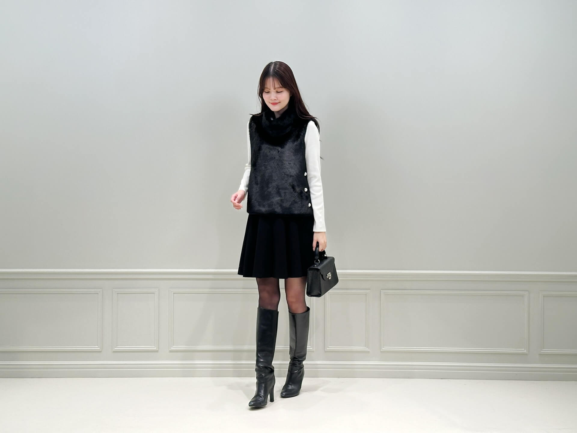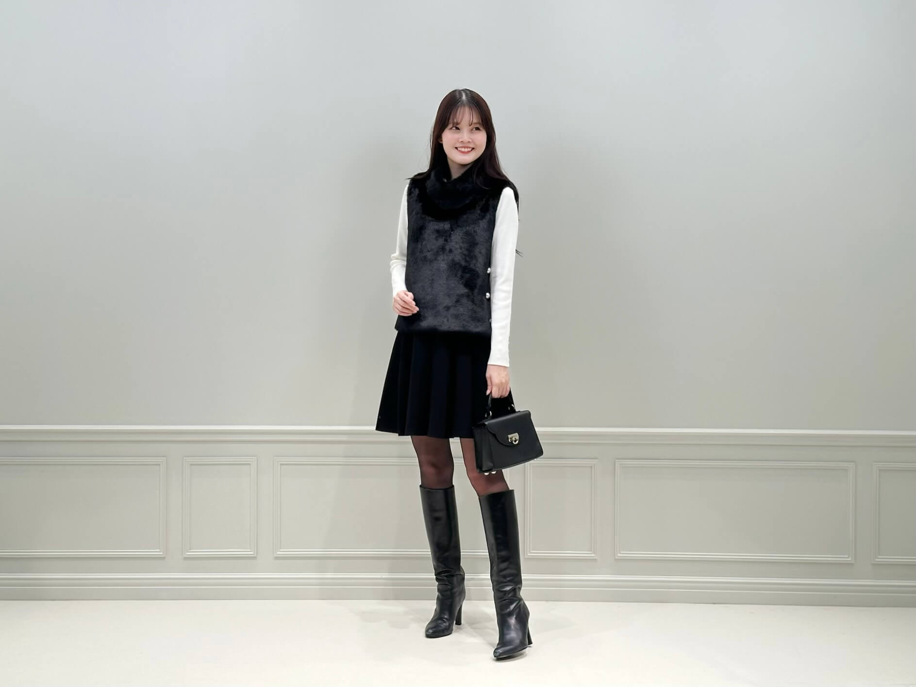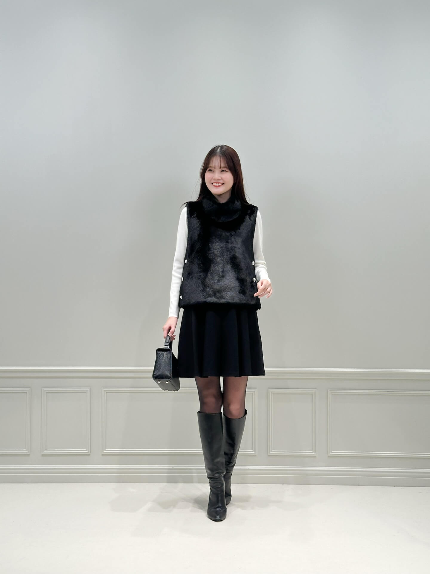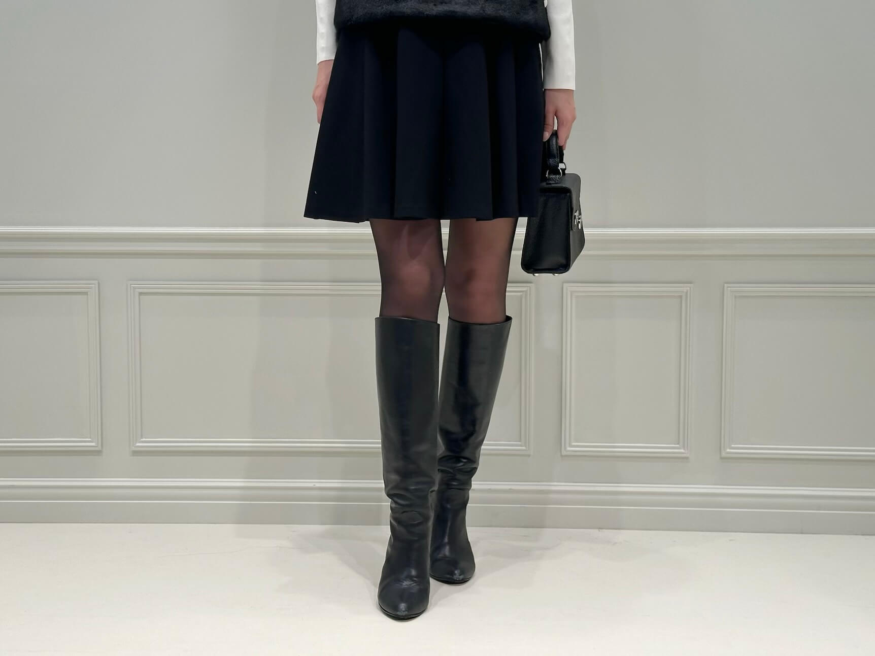 ロングブーツとの相性が良く、脚をすっきりと見せてくれるため、小柄な方にもおすすめのスタイルです。