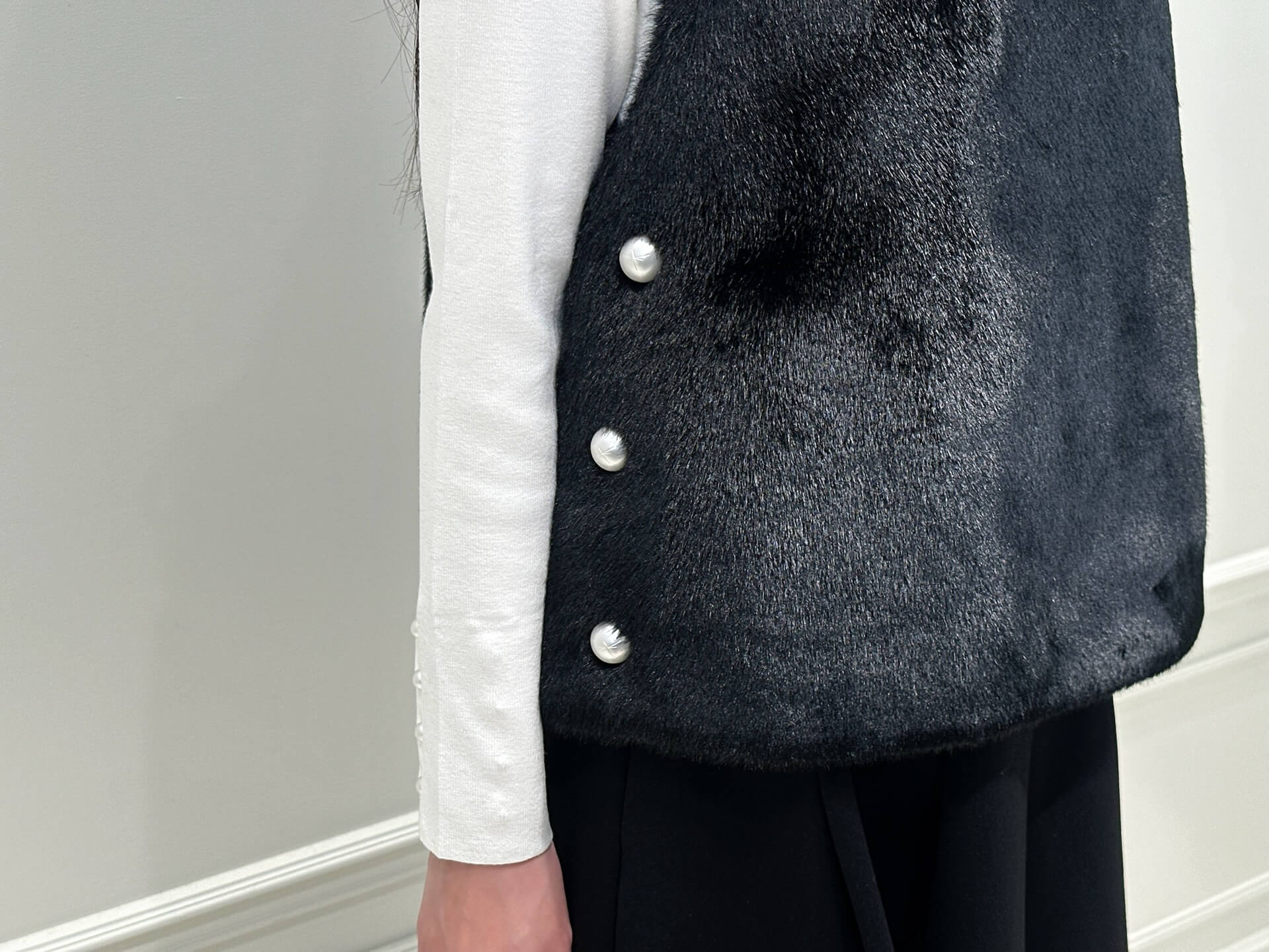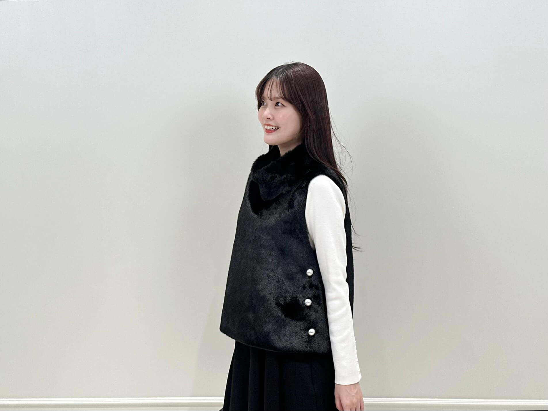 ライブでは伝えきれなかったポイントとして、ジレのサイドにあしらわれた大粒パールボタンが程よいアクセントになり、横から見たときのシルエットにも華やぎを添えます!