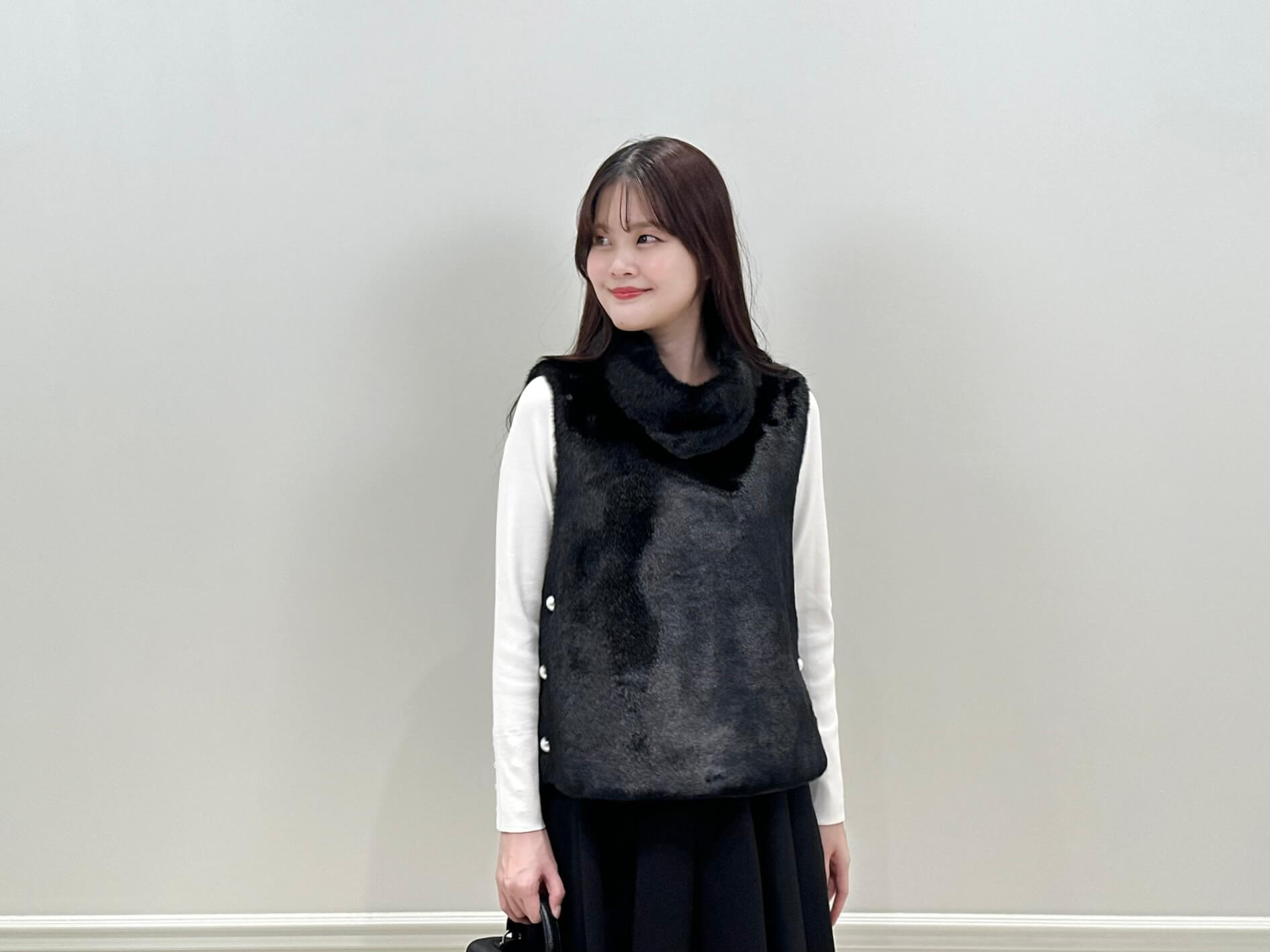 ジレとショートパンツの組み合わせは、コンパクトなシルエットが生まれ、スタイルアップ効果抜群の人気バランス!全体をモノトーンでまとめることで、甘さを抑えた洗練スタイルに。ふわっとしたファー素材のジレが軽やかに映え、動くたび上品な華やかさをプラスしてくれます。