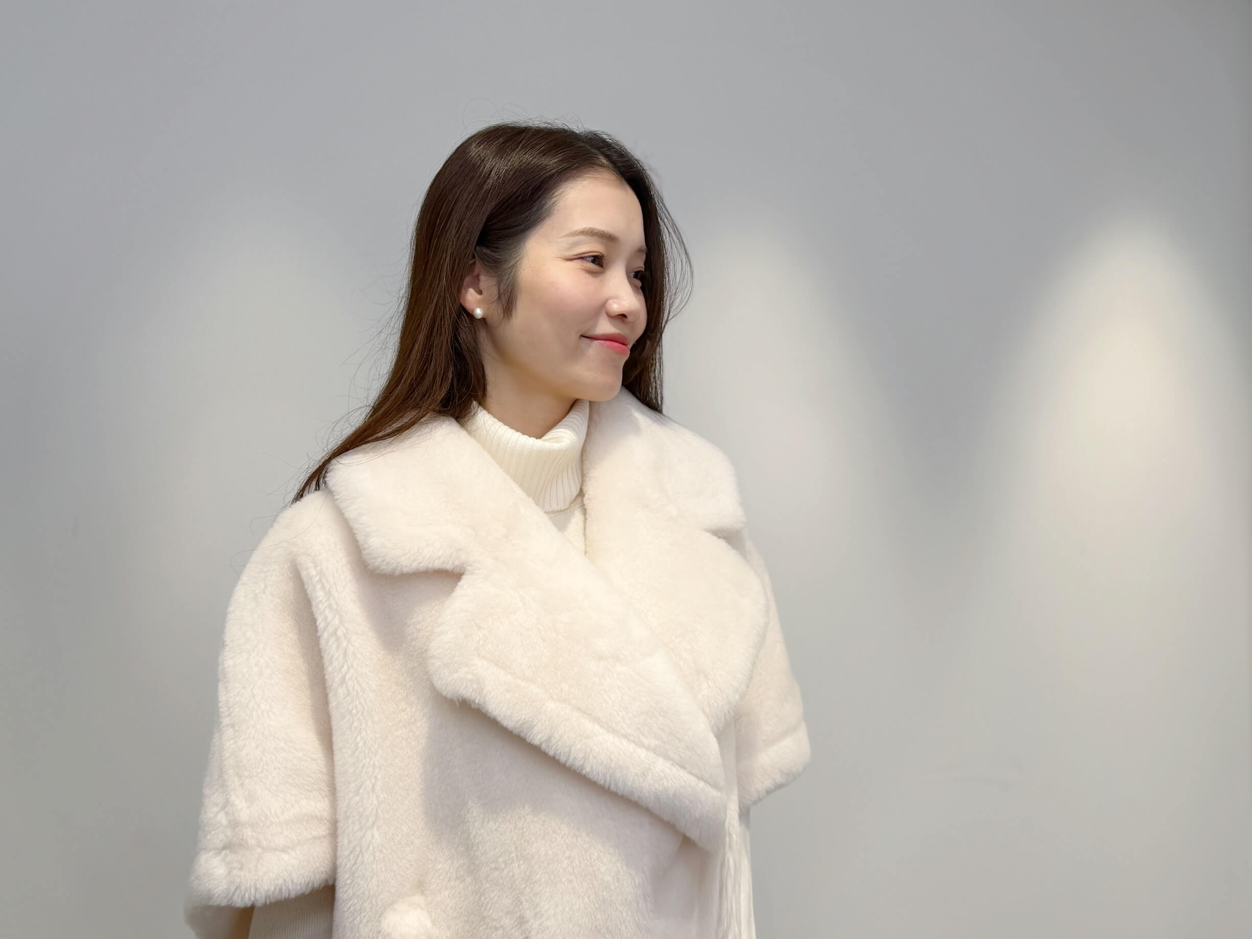 オフホワイトの優しいトーンが、冬の空気にやわらかく映える上品なアウターです。