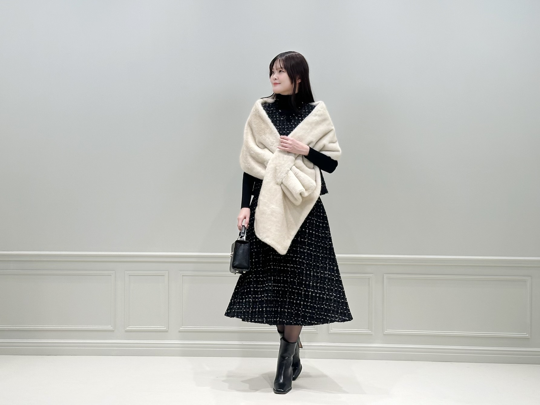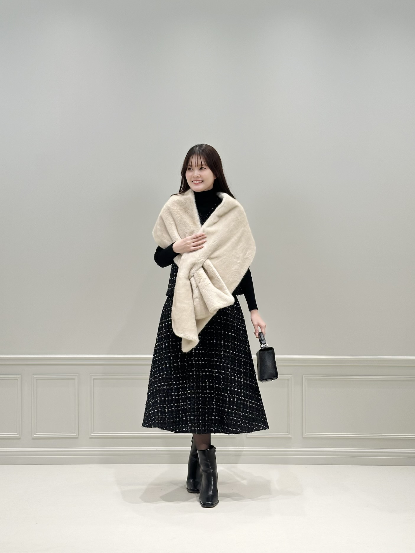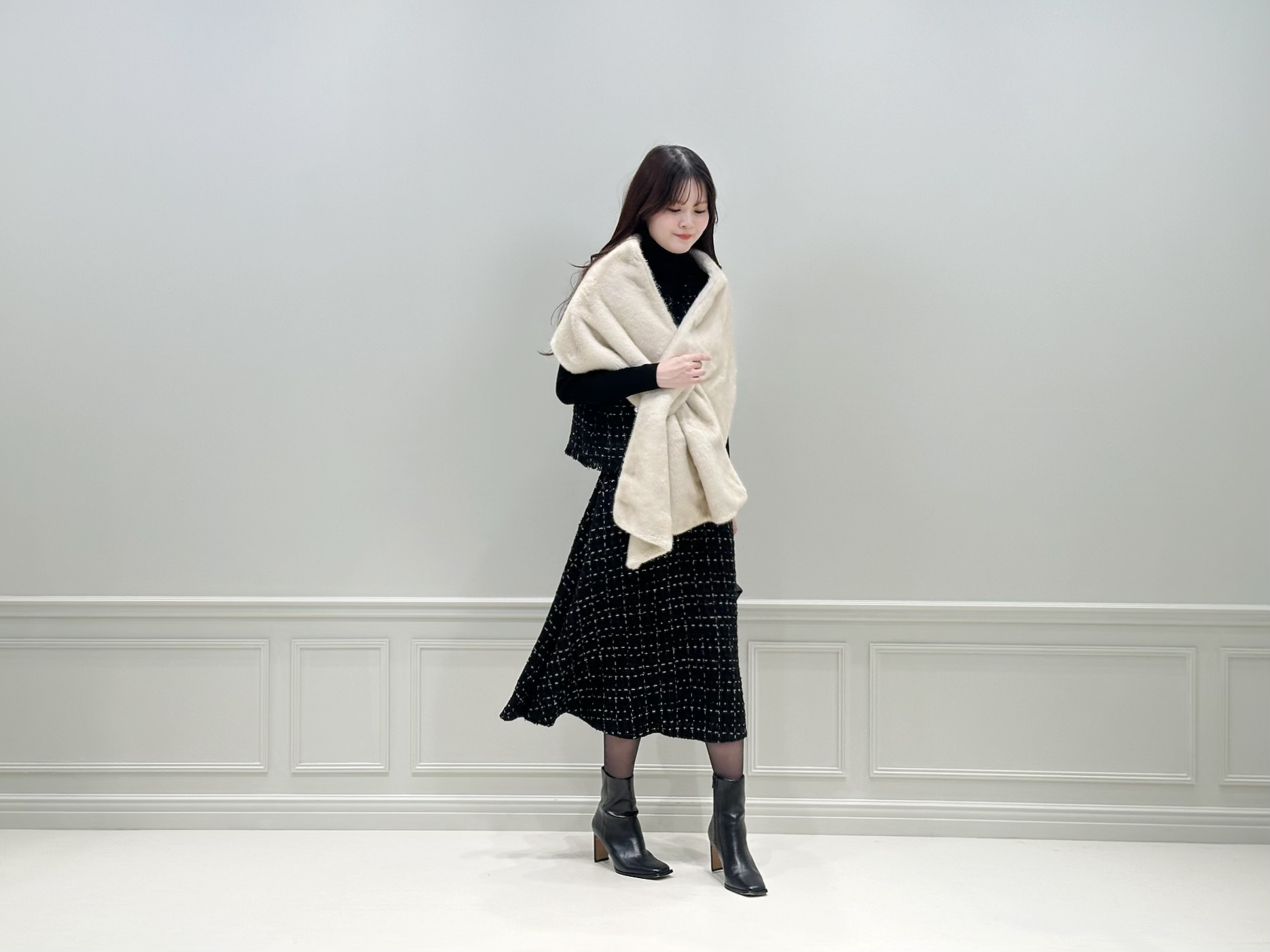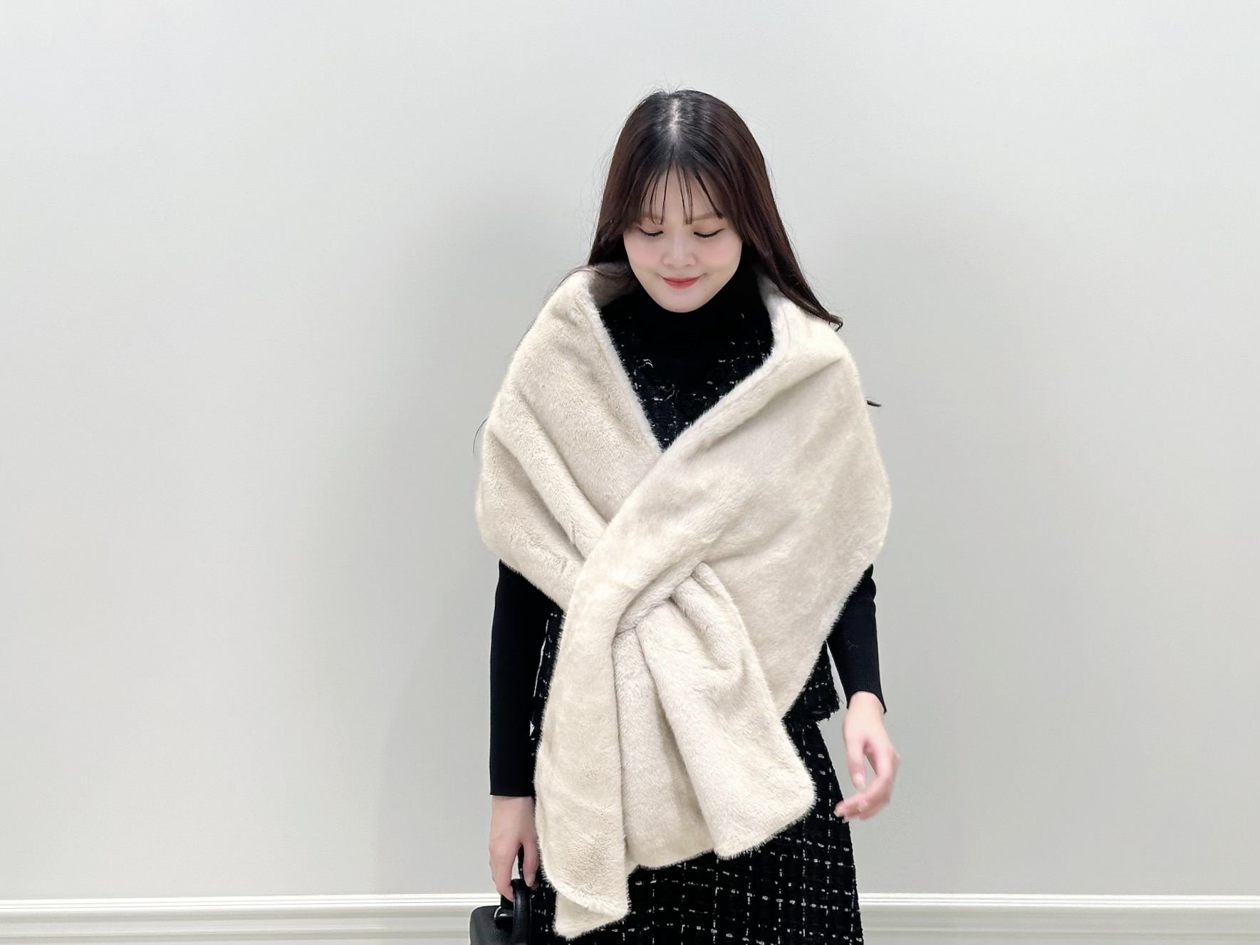 肩にふわっと掛けるだけで優雅なドレープが生まれ、ツイードのクラシカルな質感にやわらかい華やかさを添えてくれます。冬のお出かけやディナーシーンにもぴったりの存在感です!