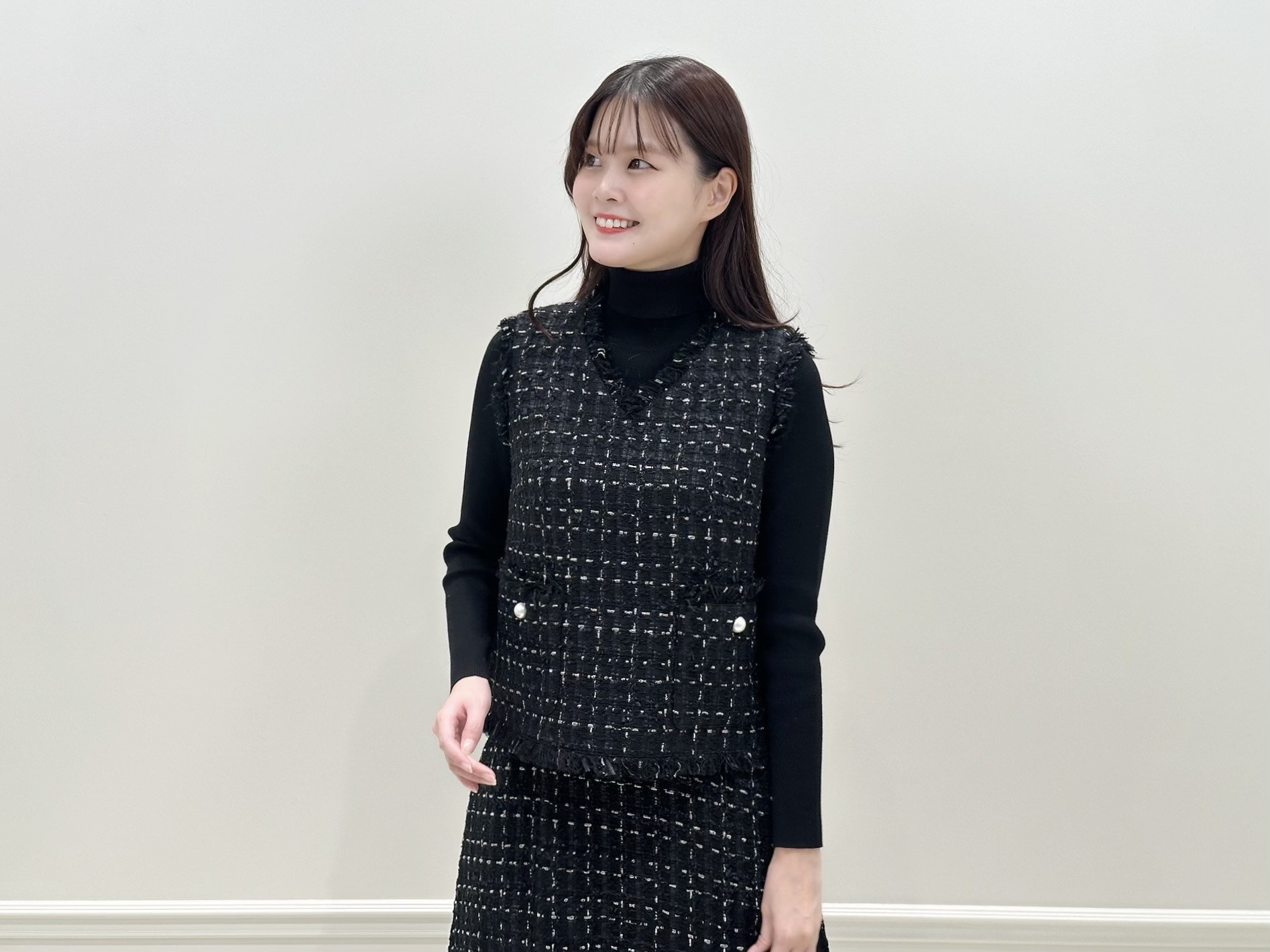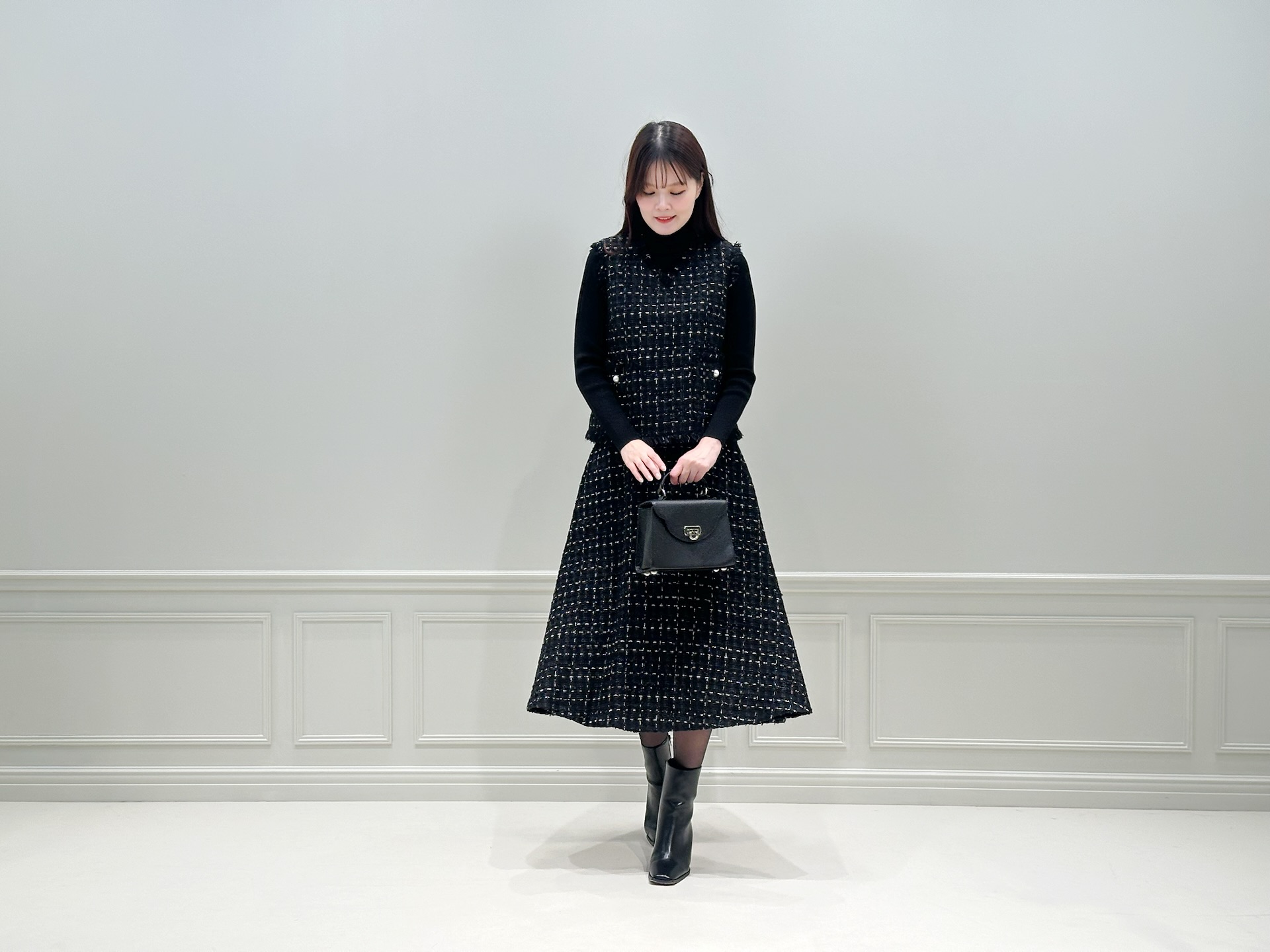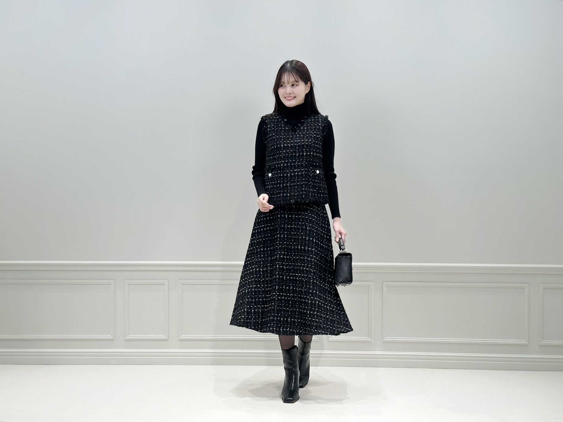 最後はストールを外して、ツイード×タートルのシンプルなクラシックスタイルにチェンジ。一気に端正な印象になり、通勤・お食事・ホリデーイベントなど幅広いシーンで活躍します。