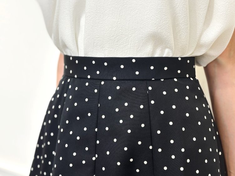 スカートは、程よいハリ感のあるグログラン素材で、きれいなフレアラインをキープ。モノトーンのドット柄が、大人可愛い印象をプラスしてくれます。