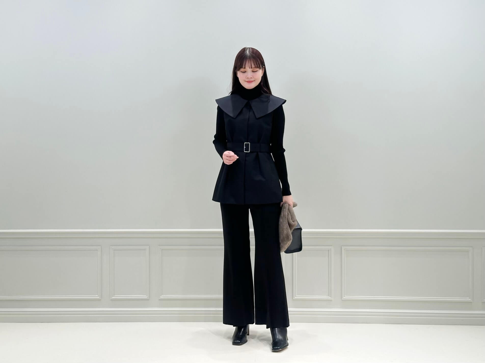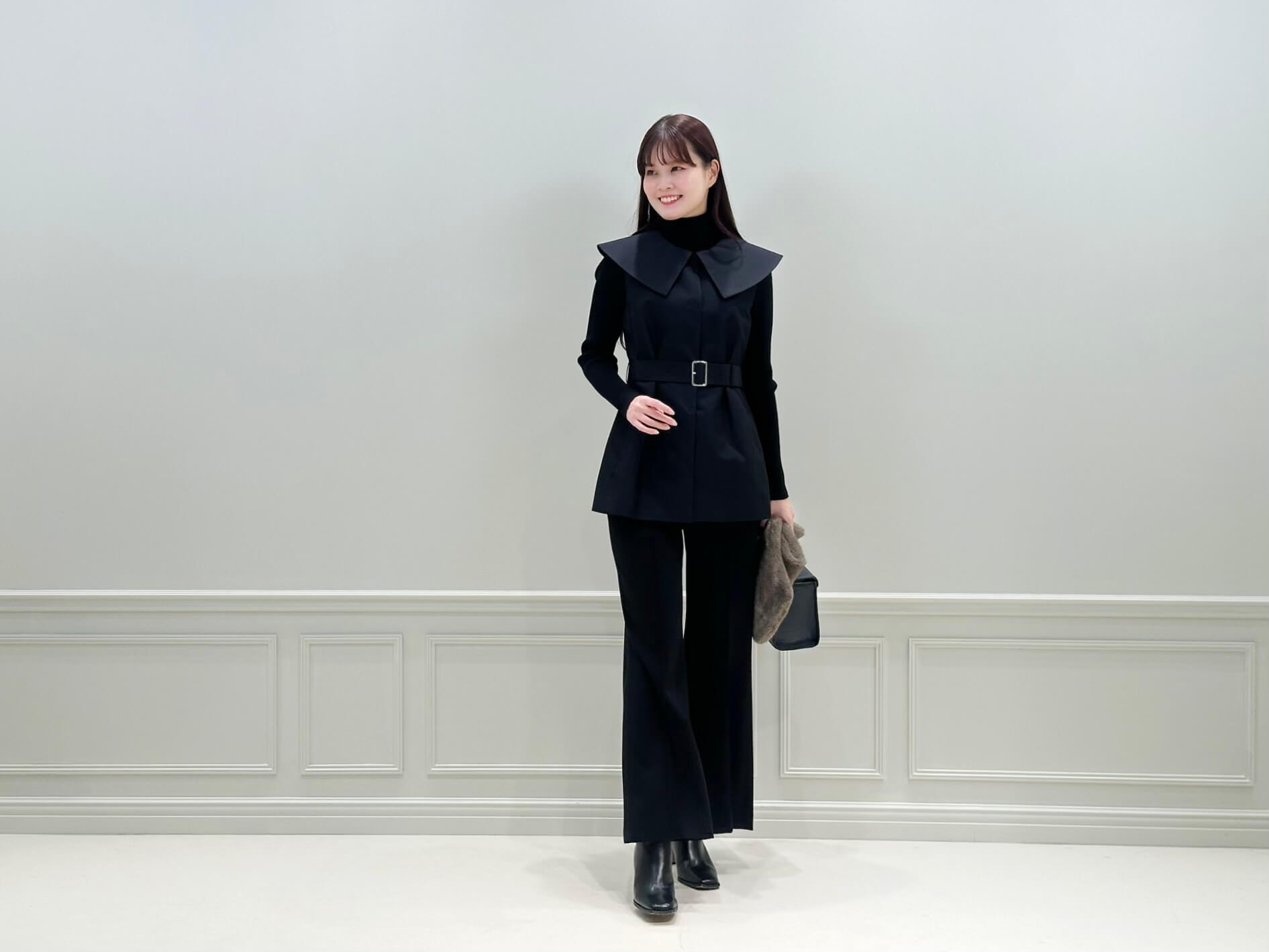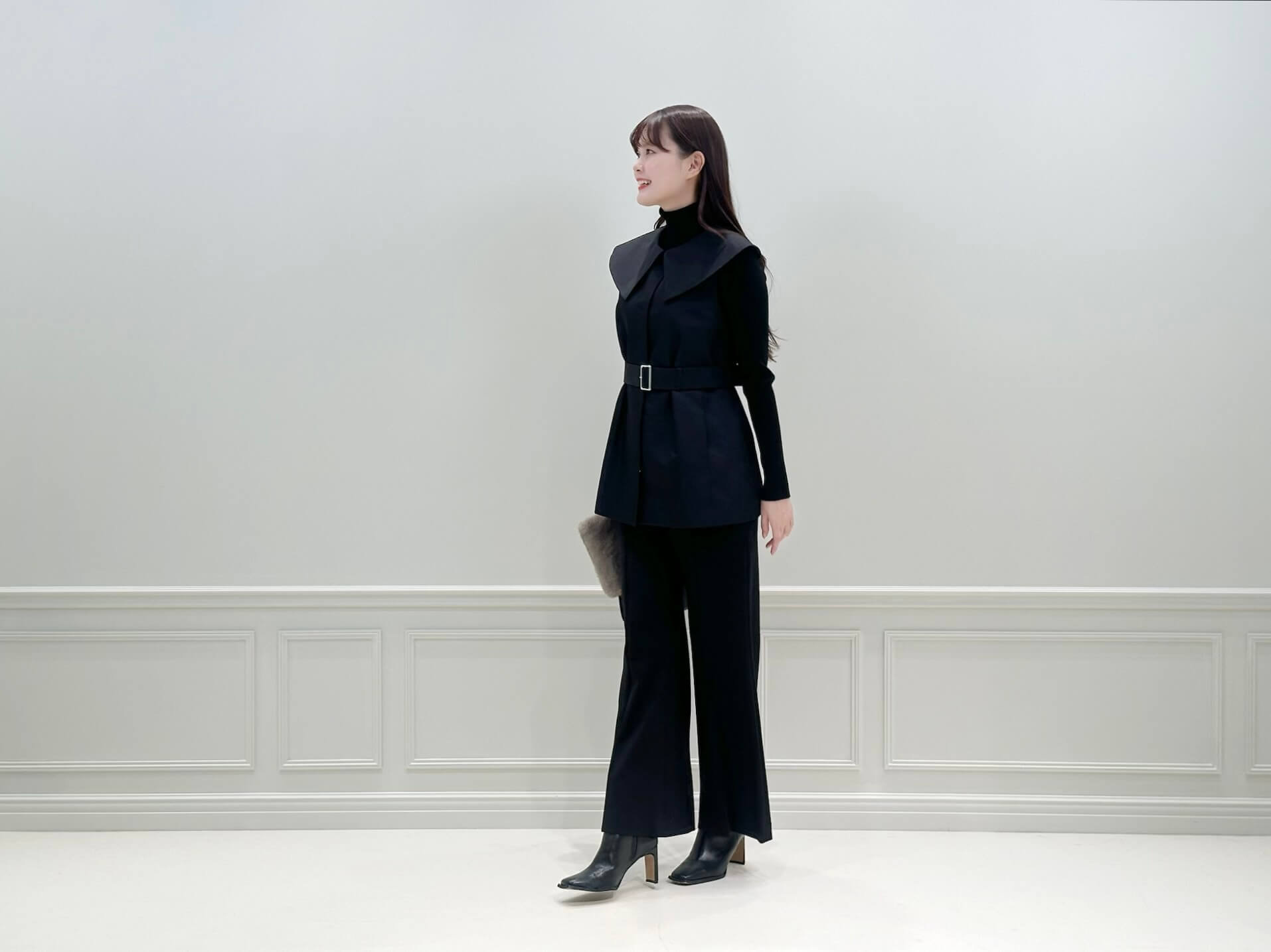 コーディネートのポイントは、全体をネイビー×ブラックでまとめたシックな配色に、ベルトマークでメリハリをつけたこと。ジレのウエスト位置を強調することで、自然と視線が上に集まり、縦のラインがきれいに際立ちます。