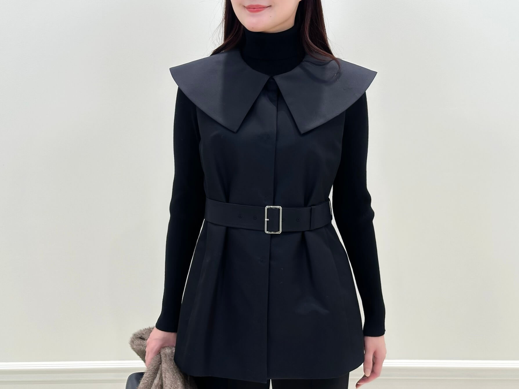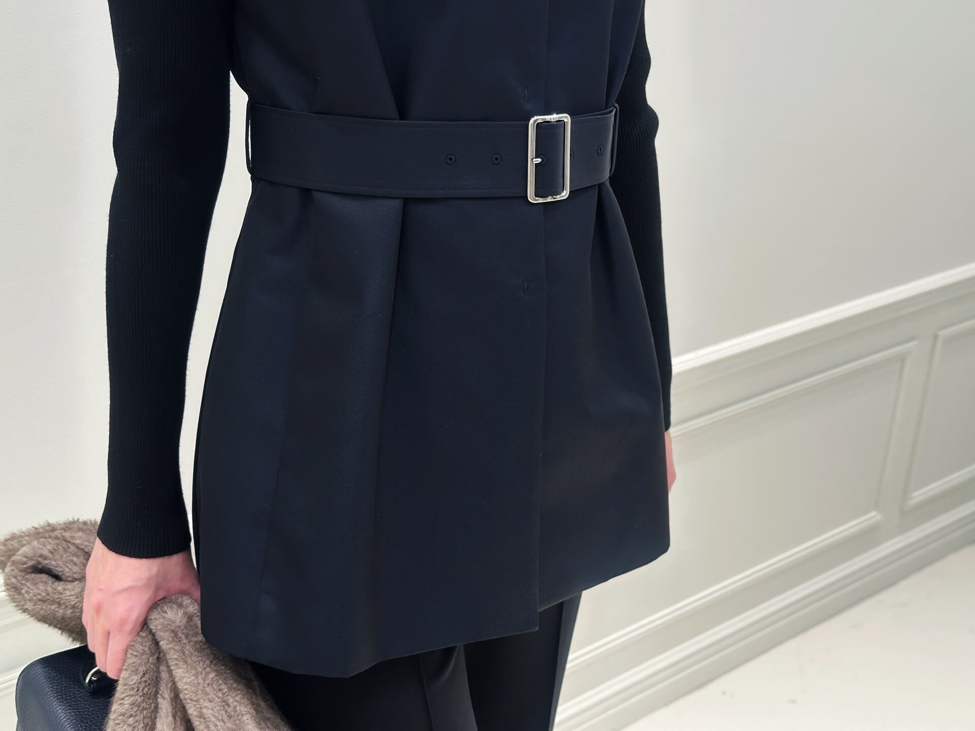 主役のベルト付きジレは、ネイビーカラーが上品で、きちんと感とモード感を併せ持った一枚。襟のデザインやフロントのラインが美しく、着るだけでコーディネート全体を引き締めてくれます。
