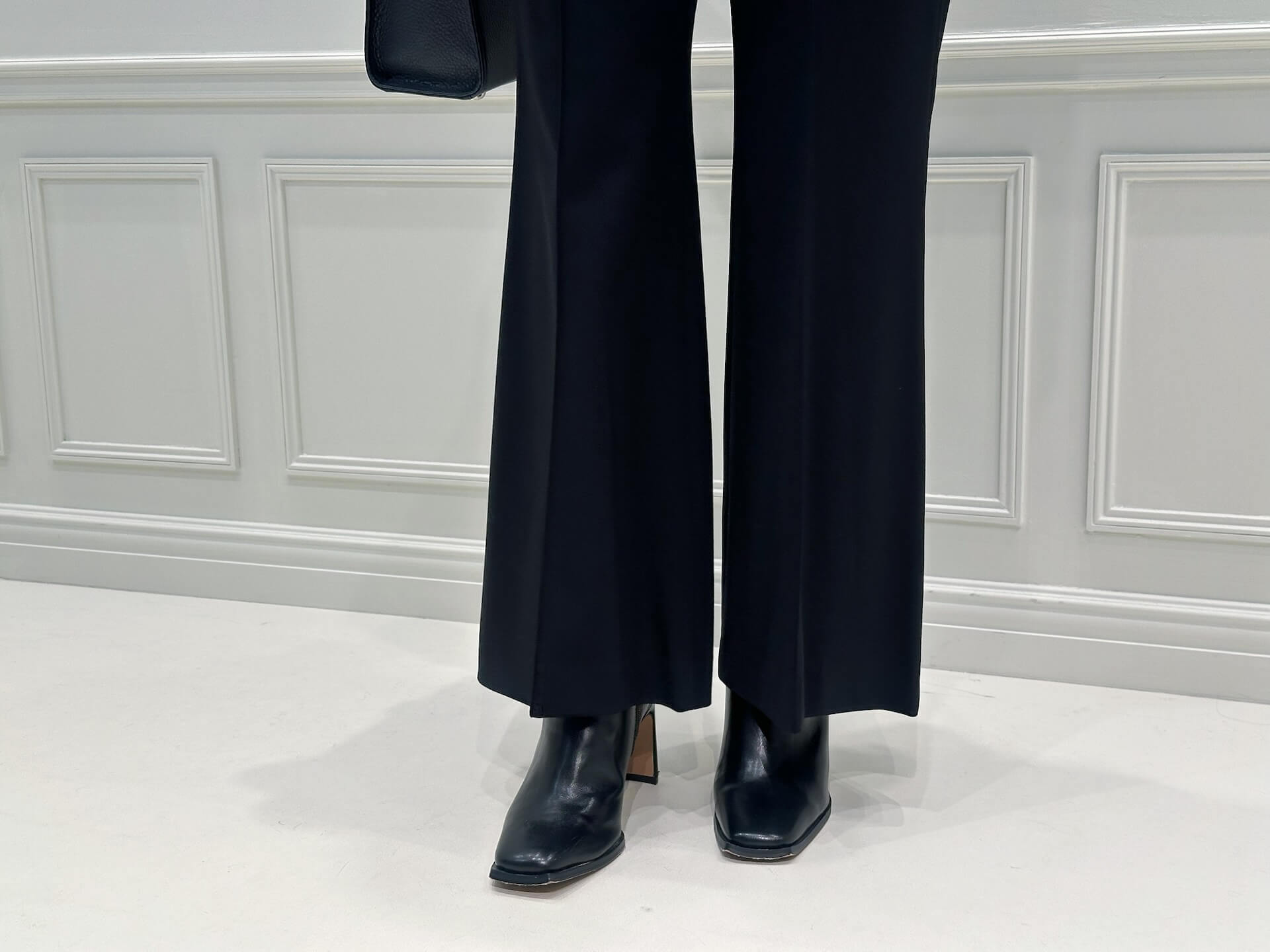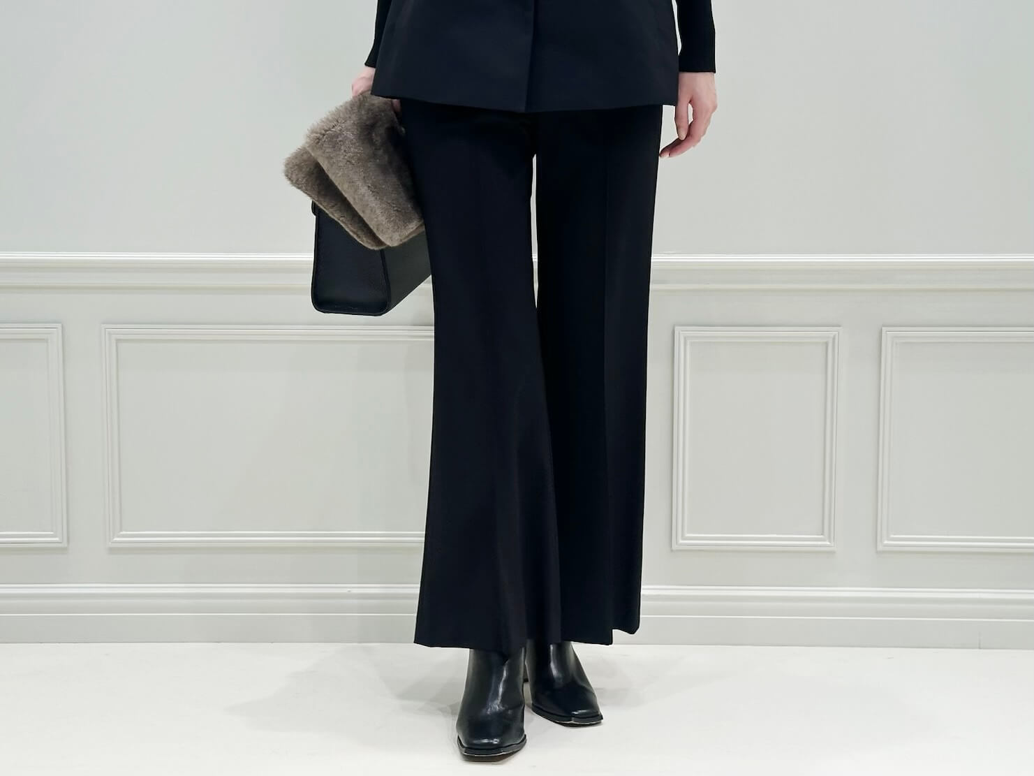 そこにフレア感のあるパンツとヒールブーツを合わせることで、脚長効果とスタイルアップをしっかり意識しました。
