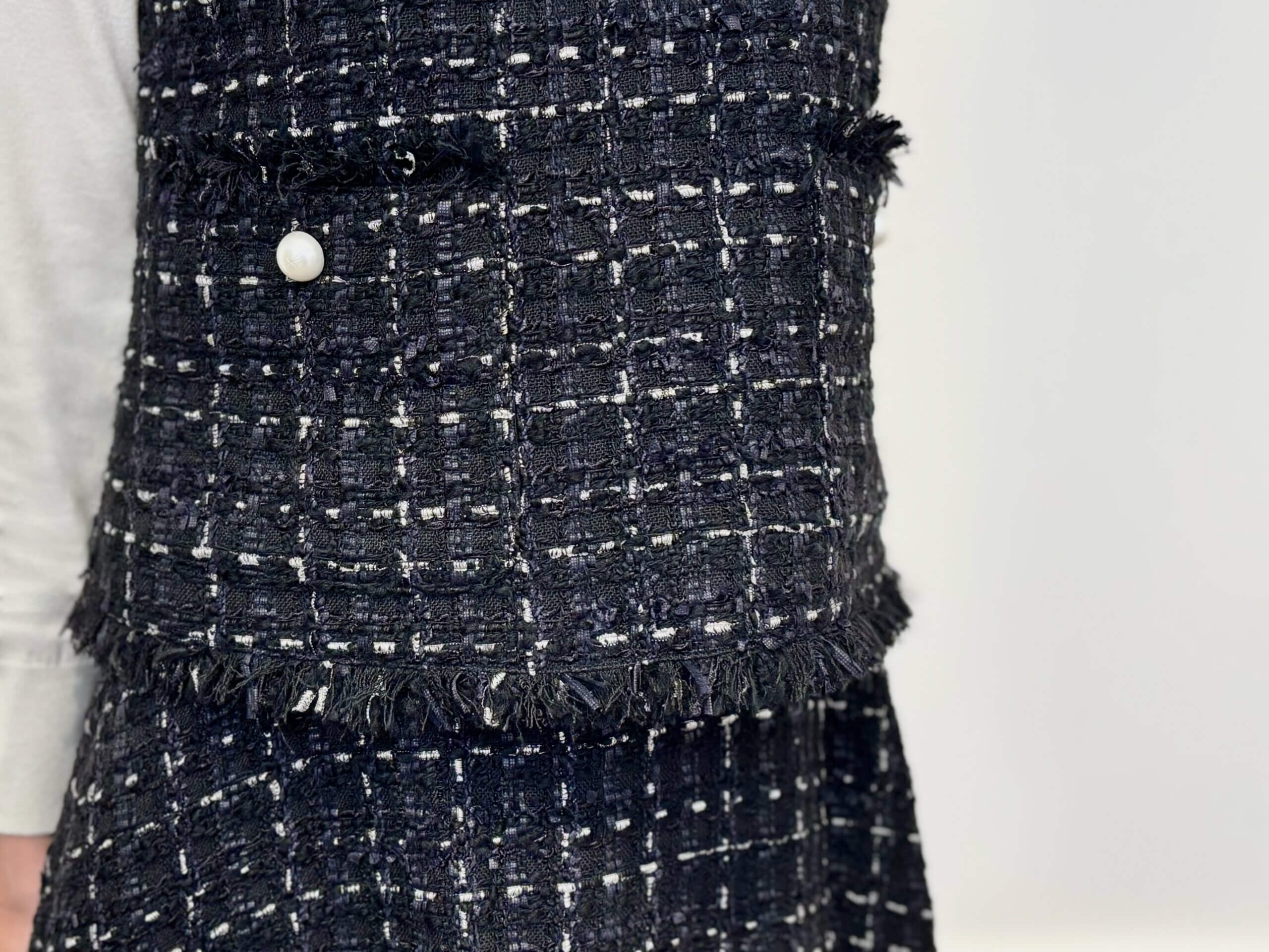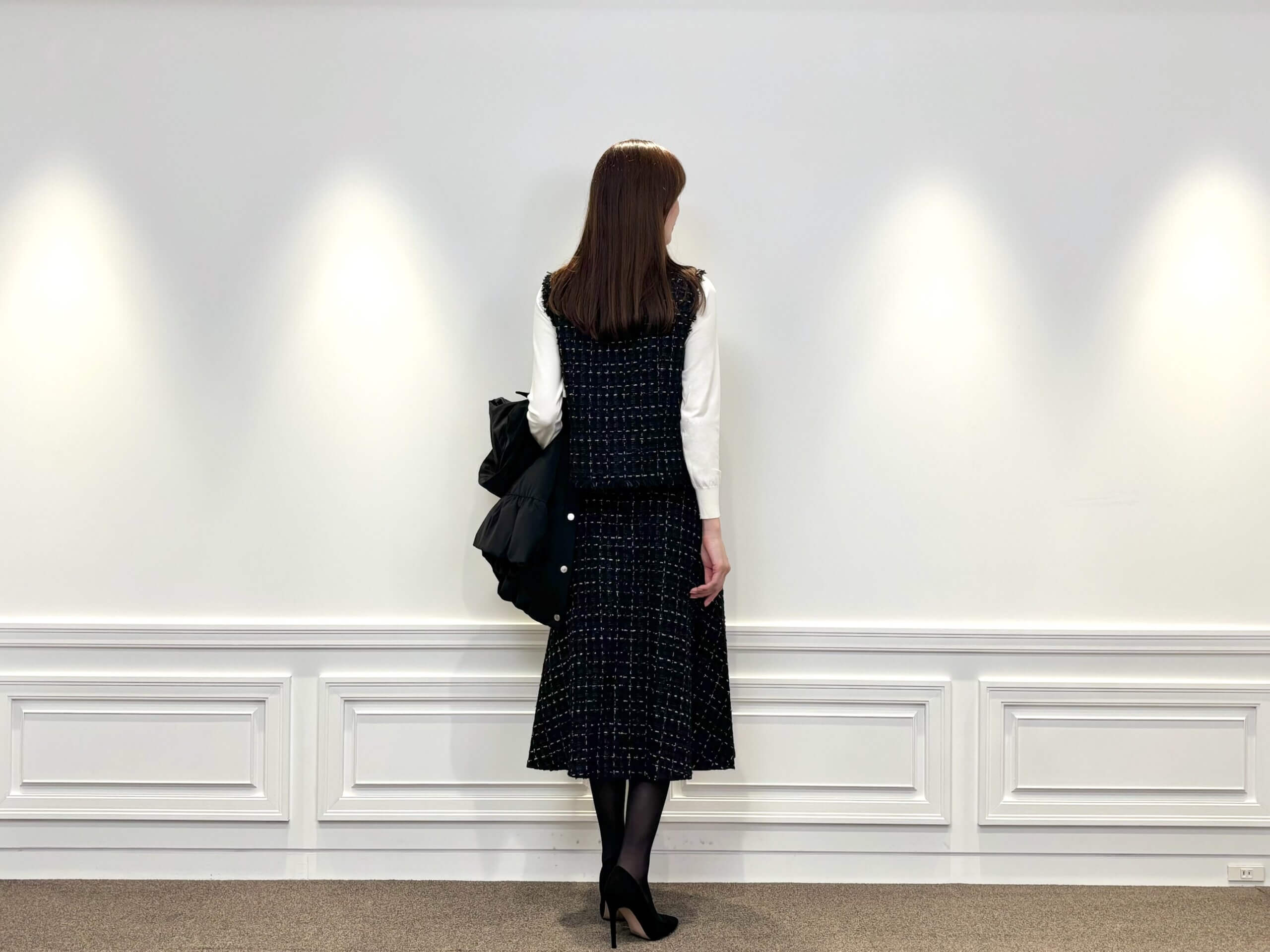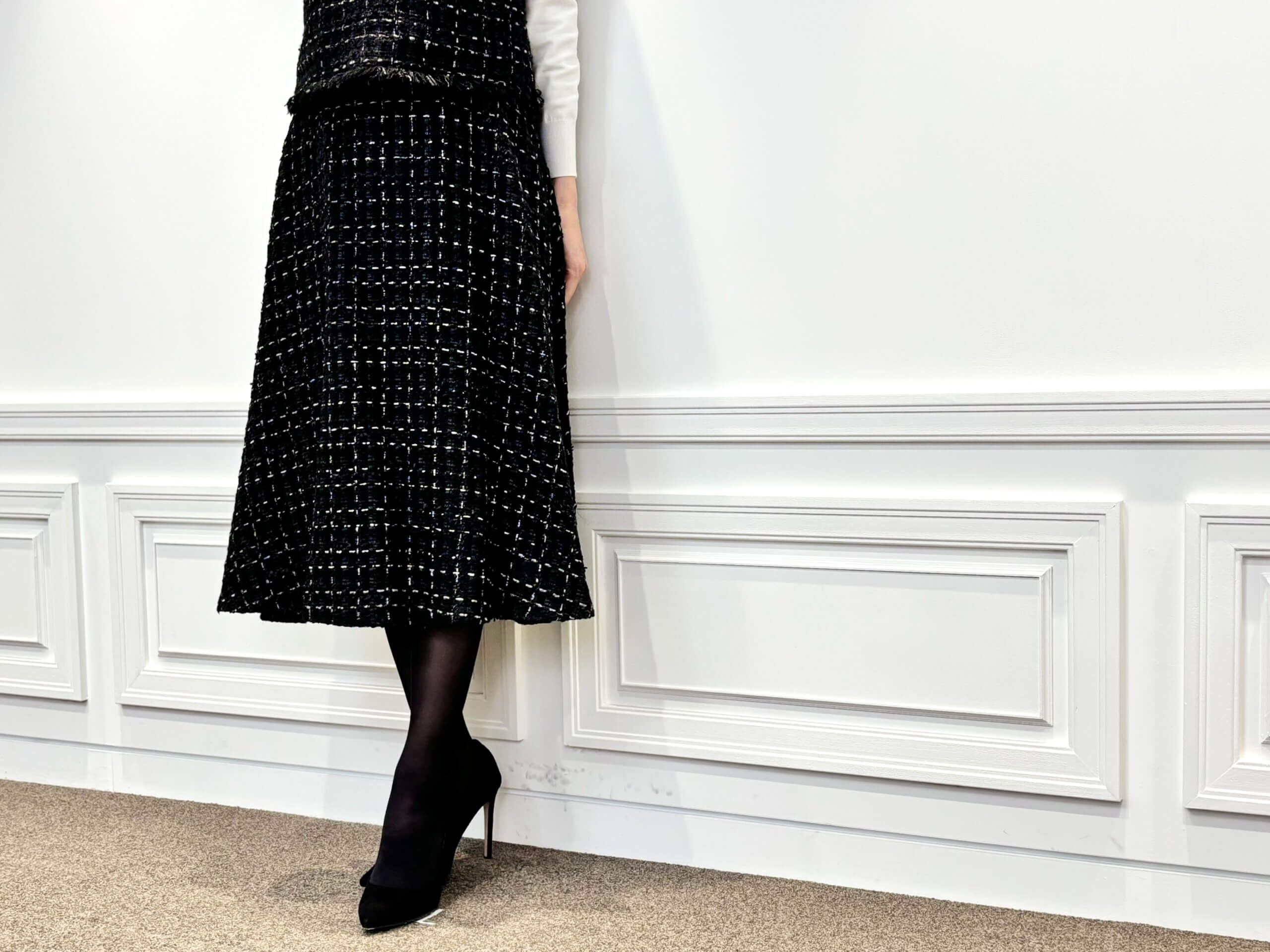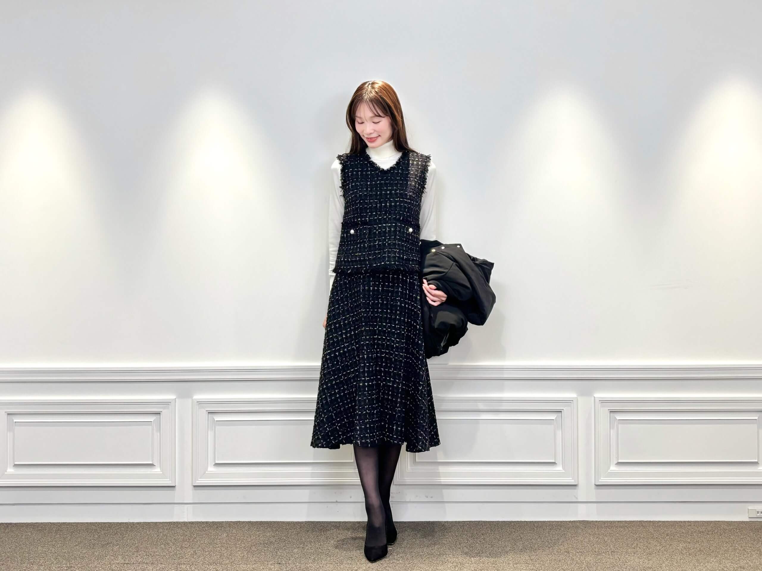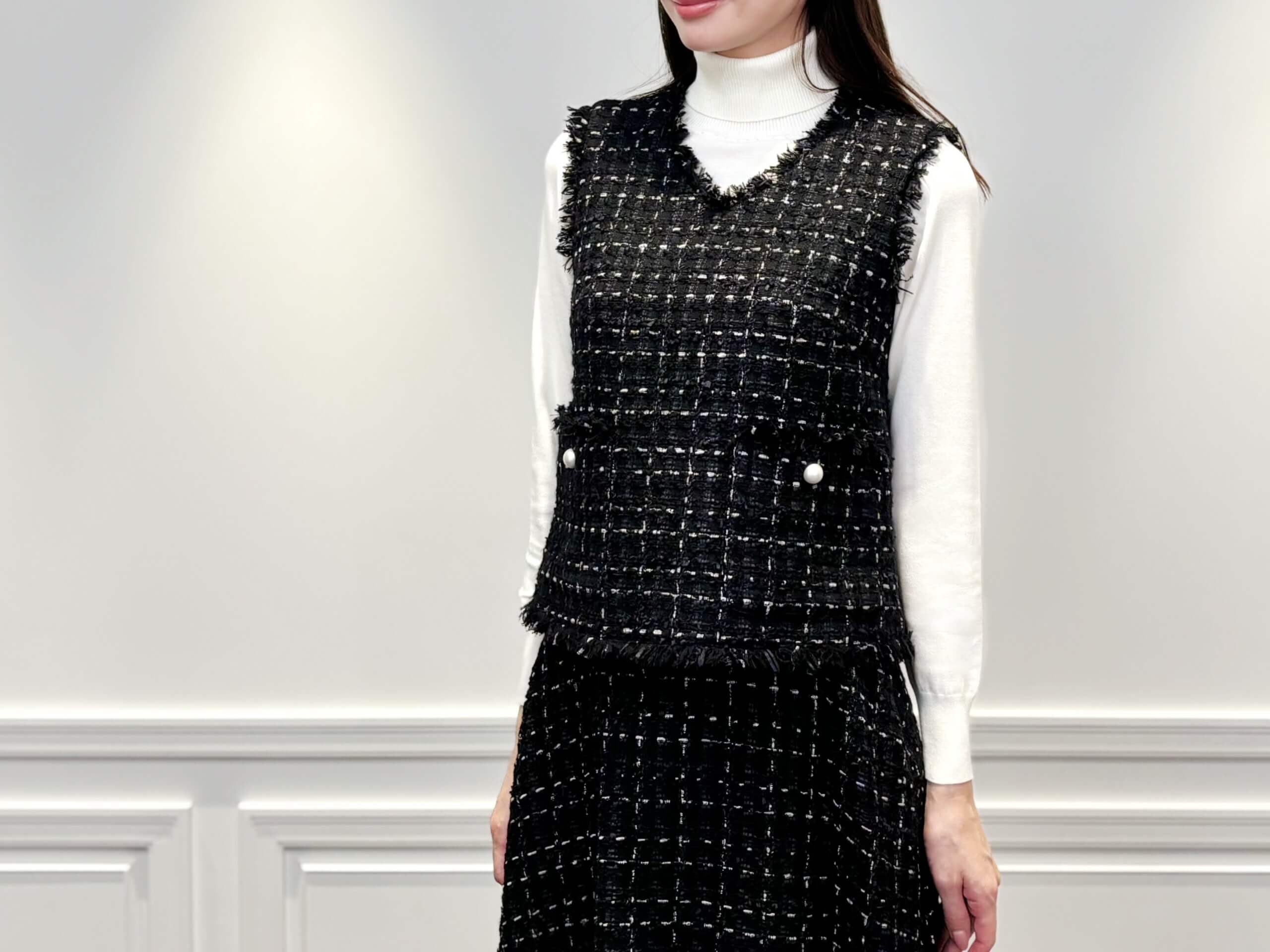 黒をベースにしたシックなツイードは、上品な華やかさを纏いながらも落ち着きをキープ。大人女性にこそ似合う気品ある装いへと導いてくれます。