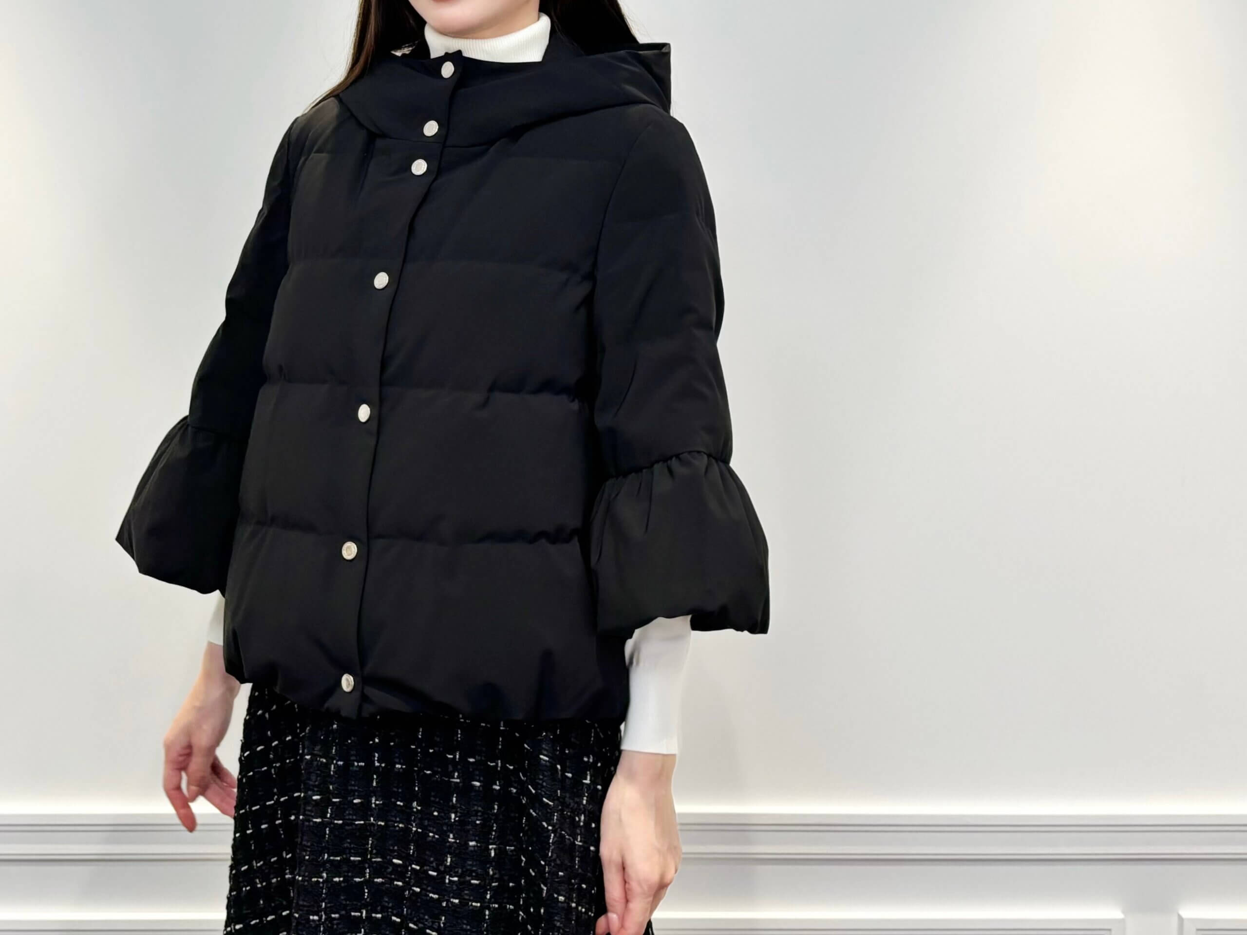 アウターは、スリーブデザインが華やかなアクセントとなる<フレアスリーブショートダウンコート>をチョイス。ダウンコートでありながら、着ぶくれすることなく女性らしいシルエットであたたかなエレガンススタイルを叶えてくれます。