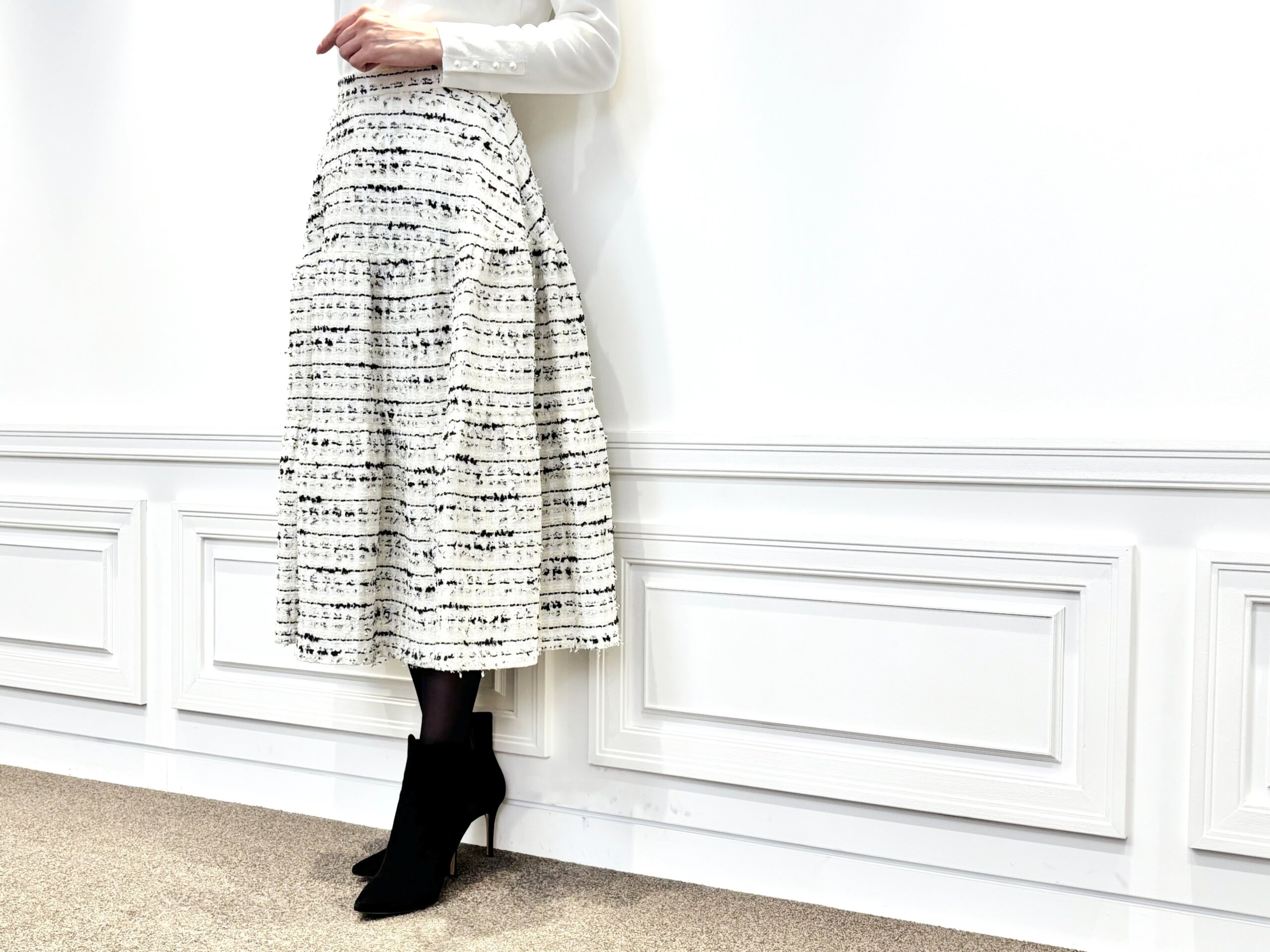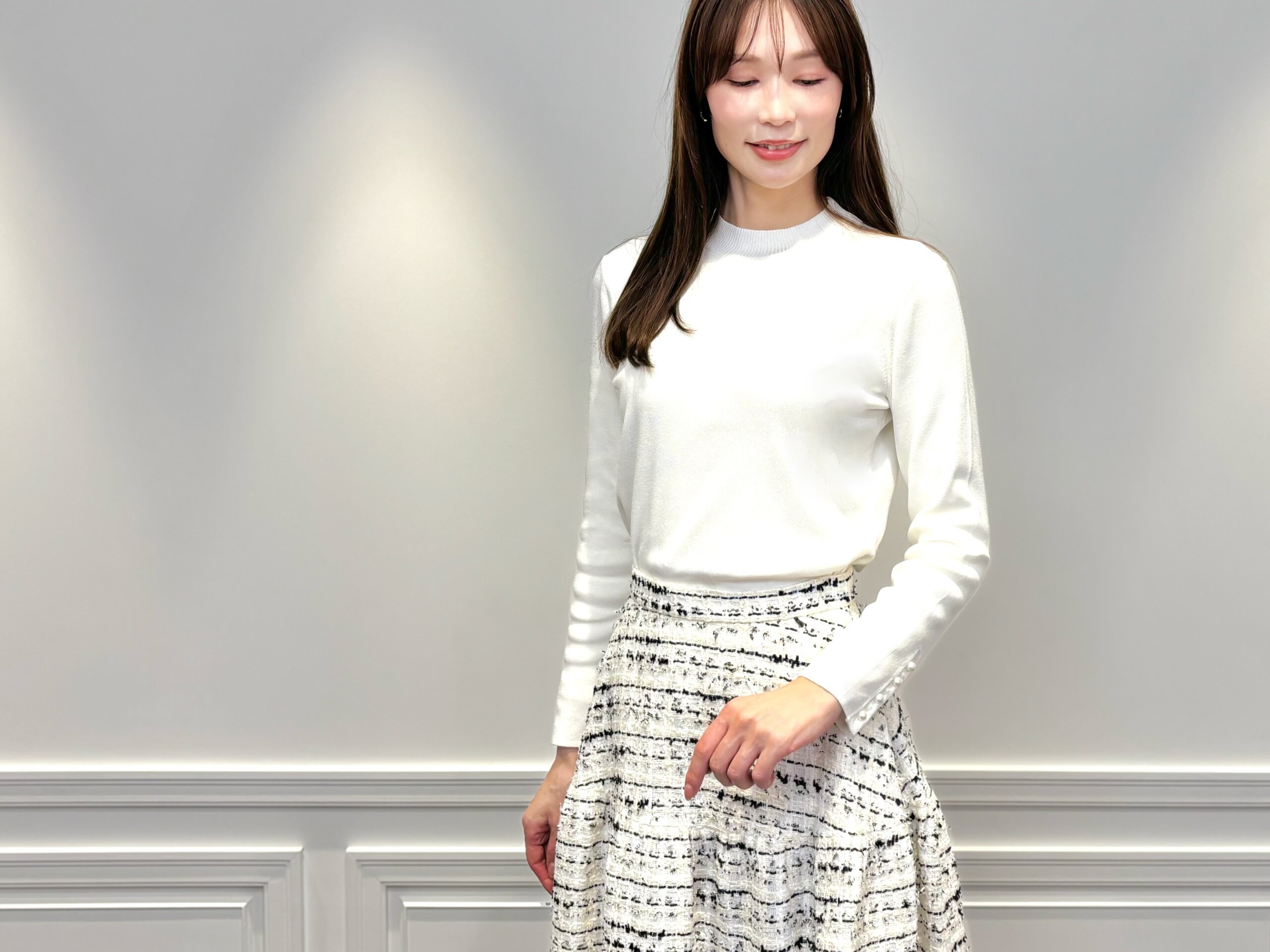 <オリジナルツイードギャザー切替フレアスカート>は、繊細な織りが生み出す表情豊かな素材感が魅力。ギャザー切替による立体的なフレアラインが、動くたびに優雅な揺れ感を演出します。ホワイトトーンでまとめることで、ツイード特有の存在感をより洗練された印象へと導いてくれます。