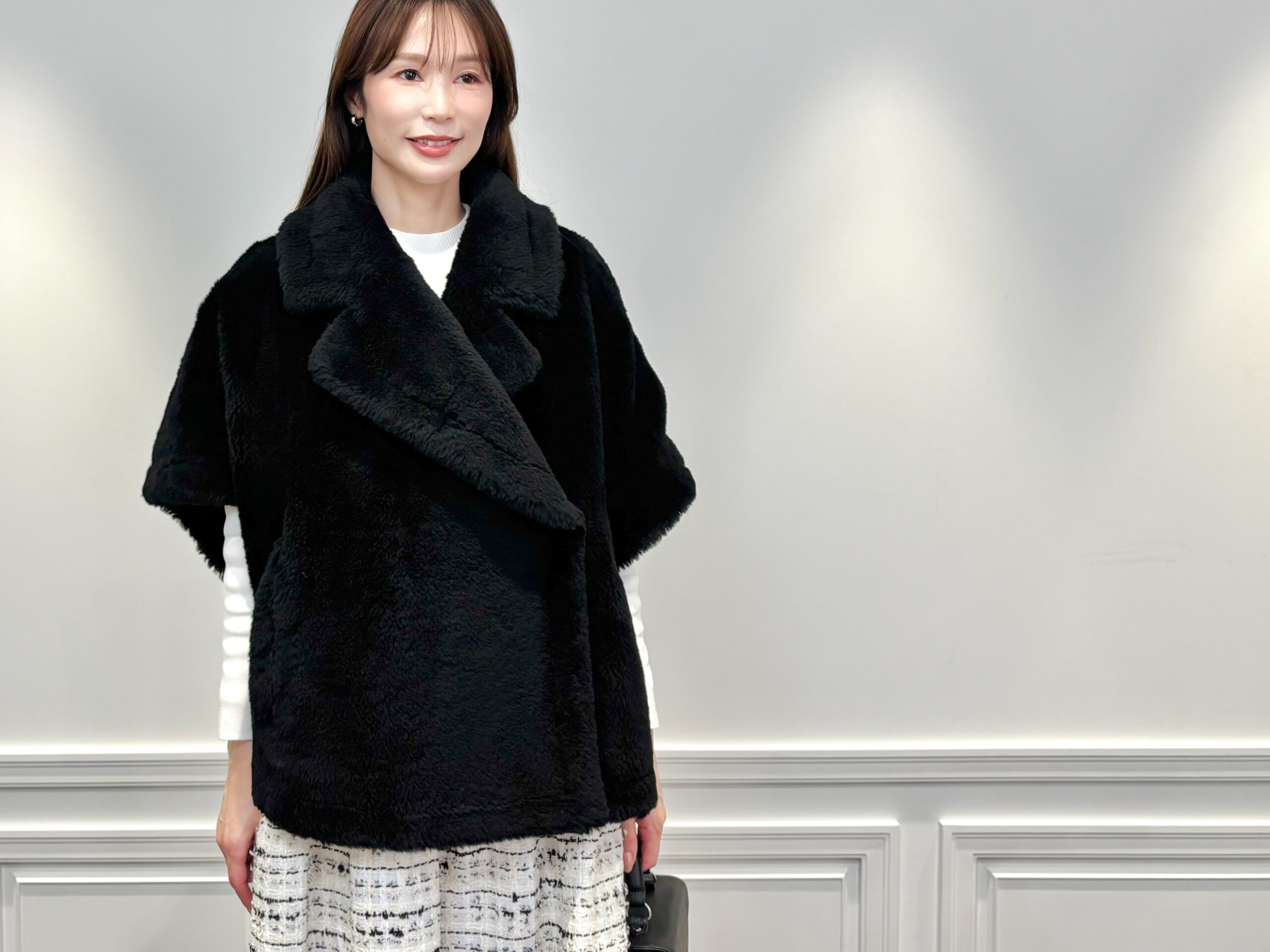 ボリューム感のある衿が顔まわりを華やかに見せながらも、ブラックカラーで全体を引き締める役割を担ってくれる<ビッグカラーダブルボアコート>。ふんわりとしたボア素材が冬らしい温もりを感じさせつつ、直線的なシルエットが大人らしい端正さを演出。ホワイトコーデに羽織ることで、メリハリのあるバランスが完成します。