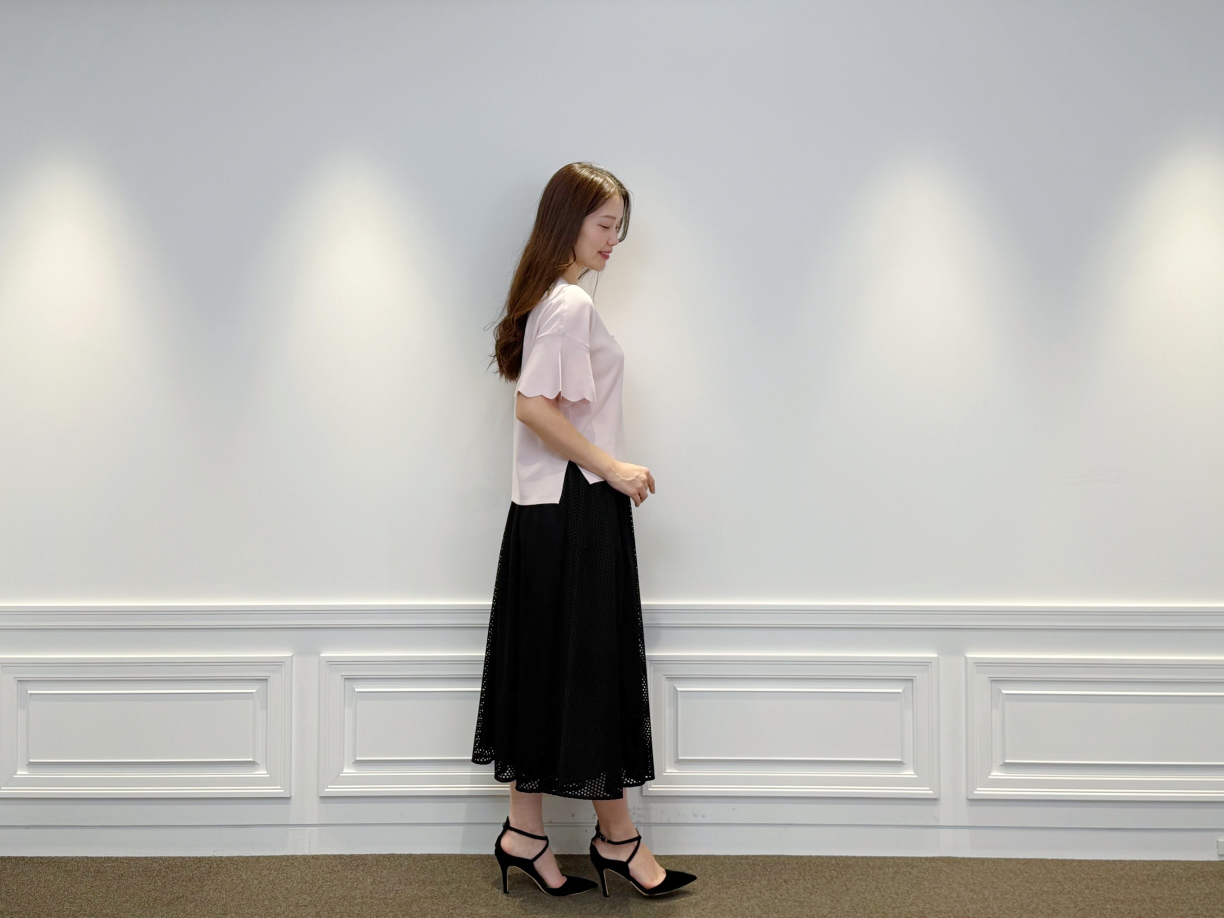 足元は黒のパンプスで引き締め、全体をすっきりと整えたバランスの良い装いに。
