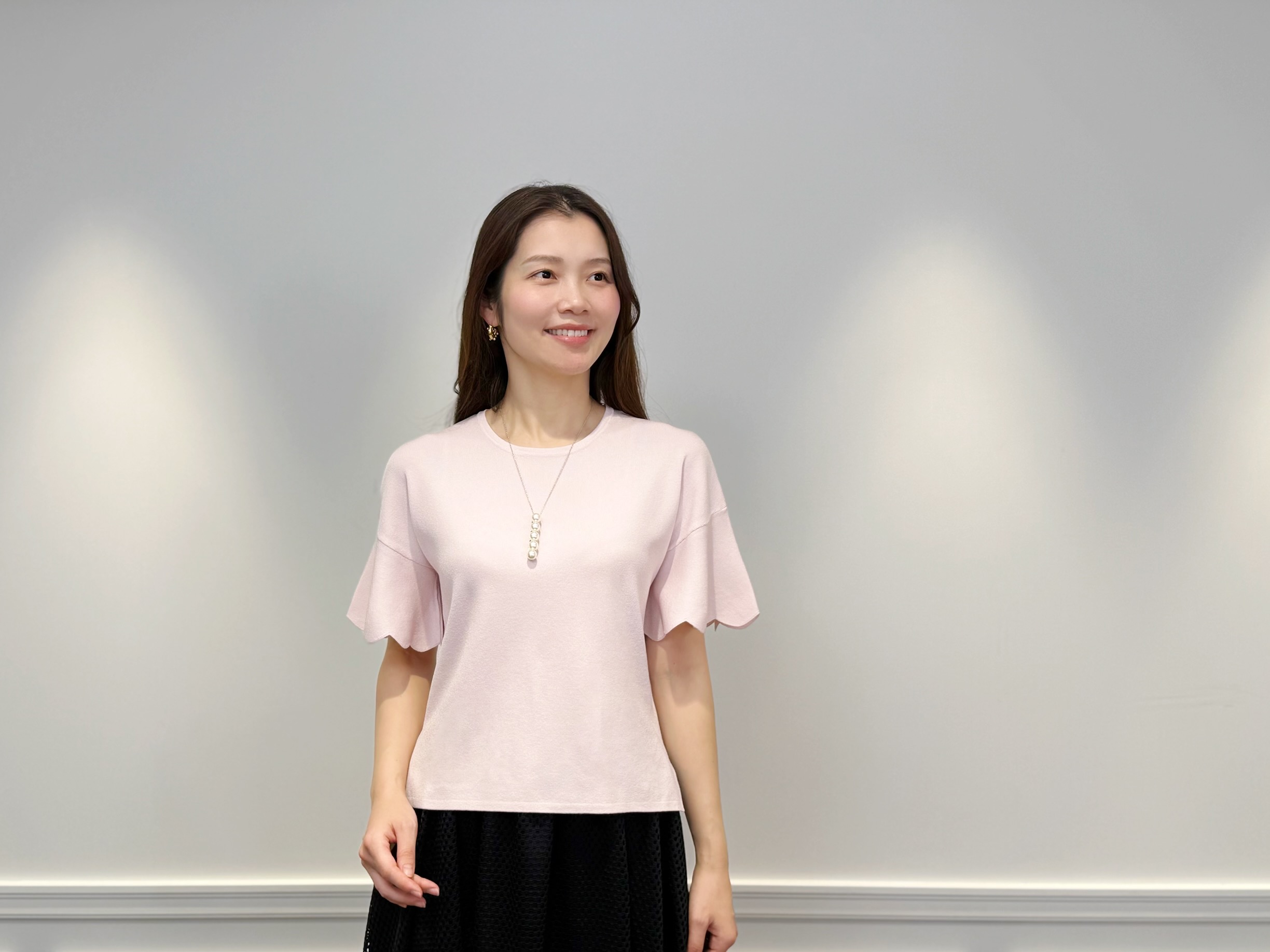<スカラップスリーブニットプルオーバー>は、袖口に施されたスカラップデザインがさりげない華やぎを添える一着です。優しいピンクカラーが肌を明るく見せ、顔まわりを柔らかな印象に導きます。コンパクトなシルエットがボトムとのバランスを取りやすく、女性らしさを引き立てながらも上品に着こなせるニットです。