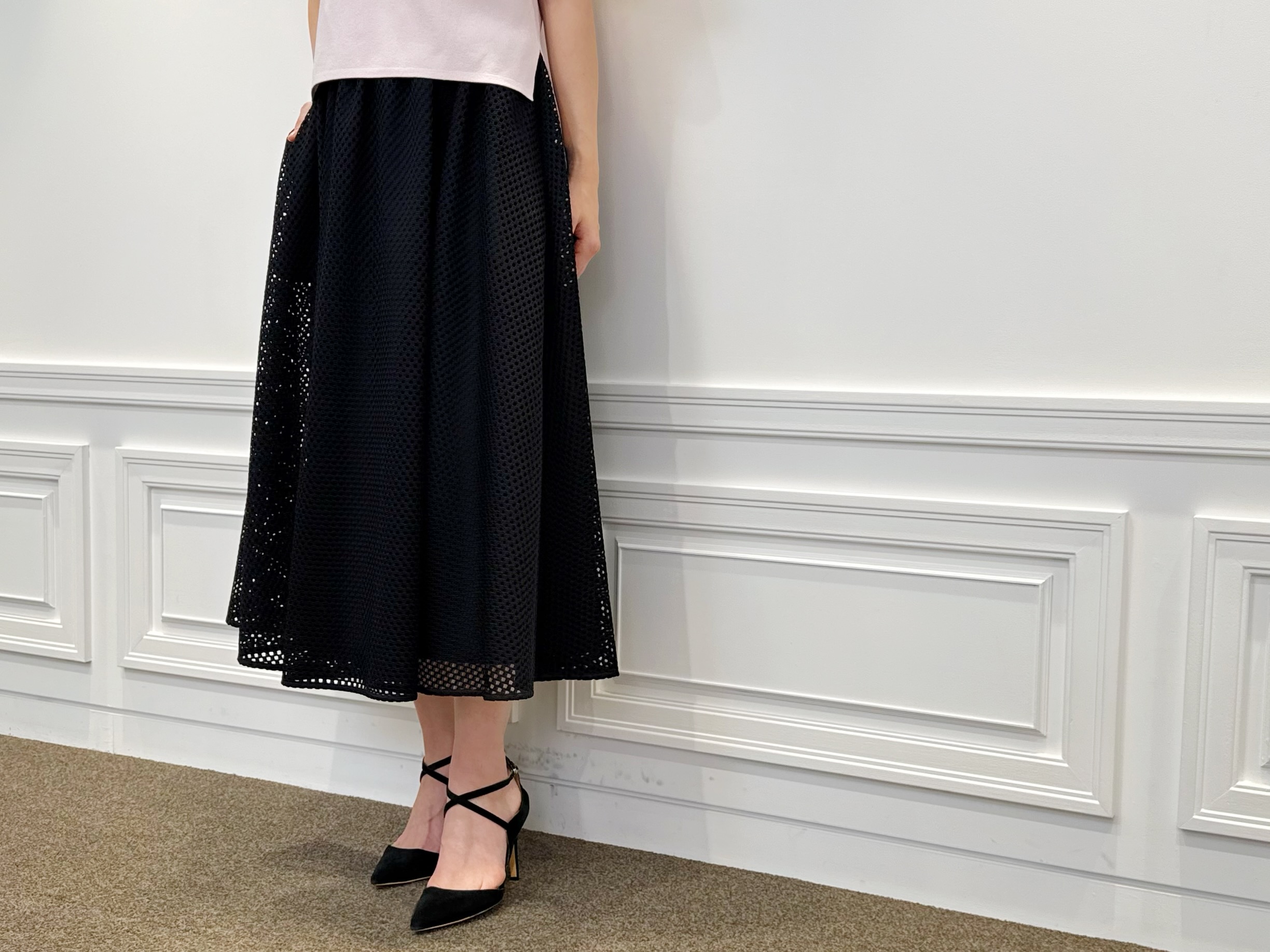 <メッシュレースフレアスカート>は、繊細なレース素材が軽やかさと奥行きを生み出すエレガントなアイテム。黒を選ぶことで甘さを程よく抑え、全体に落ち着きをもたらします。歩くたびに優雅に揺れるフレアシルエットが、女性らしい存在感を引き立て、装いに品格を添えてくれます。