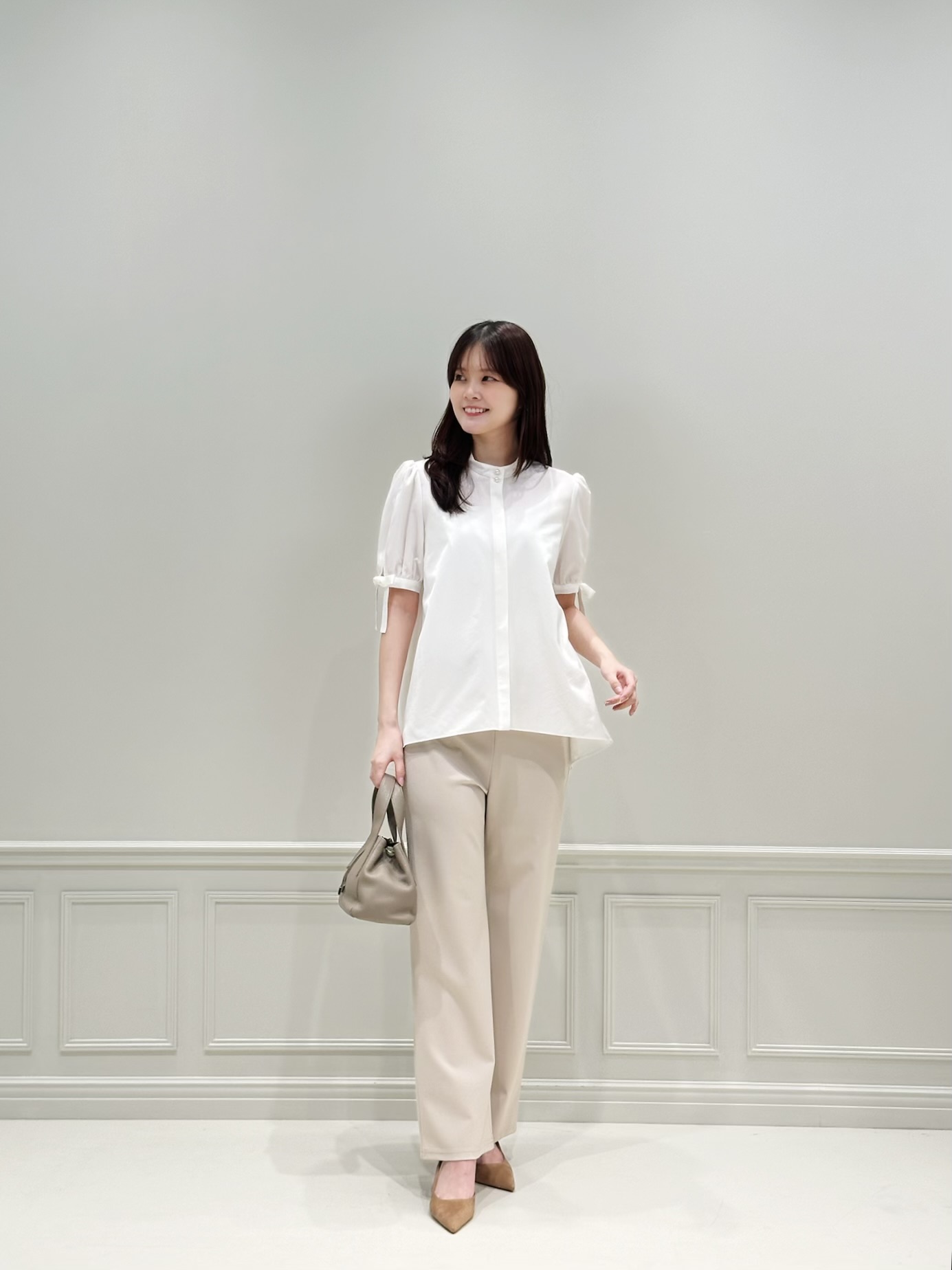 きちんと感がありながらも、程よく抜け感のあるバランスでまとめた大人のデイリーコーデ。シンプルなスタイリングでも女性らしさを感じられる、白ブラウスにベージュパンツを合わせた柔らかなトーン。