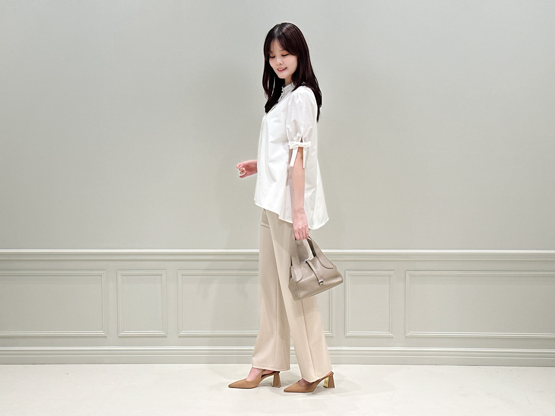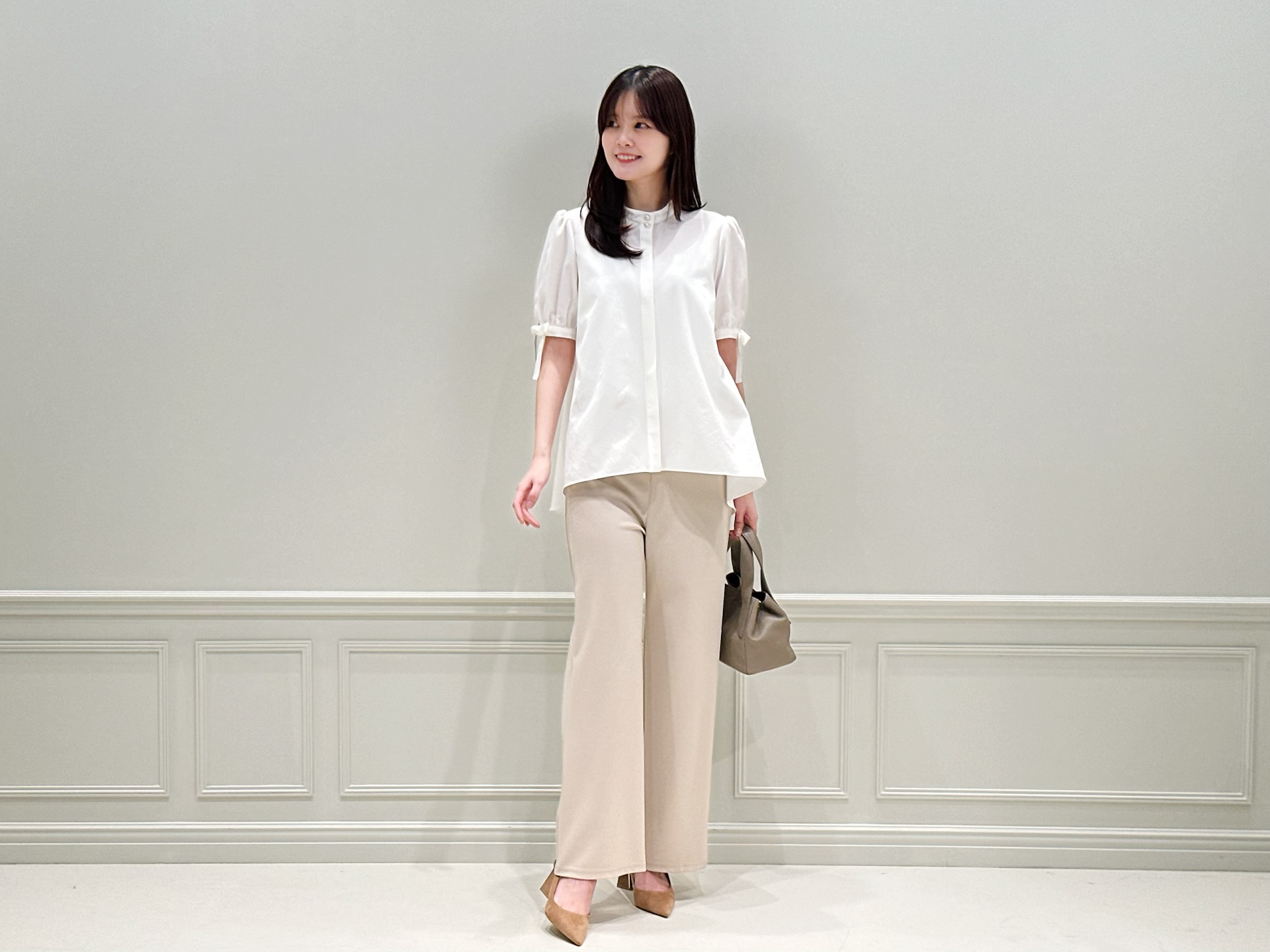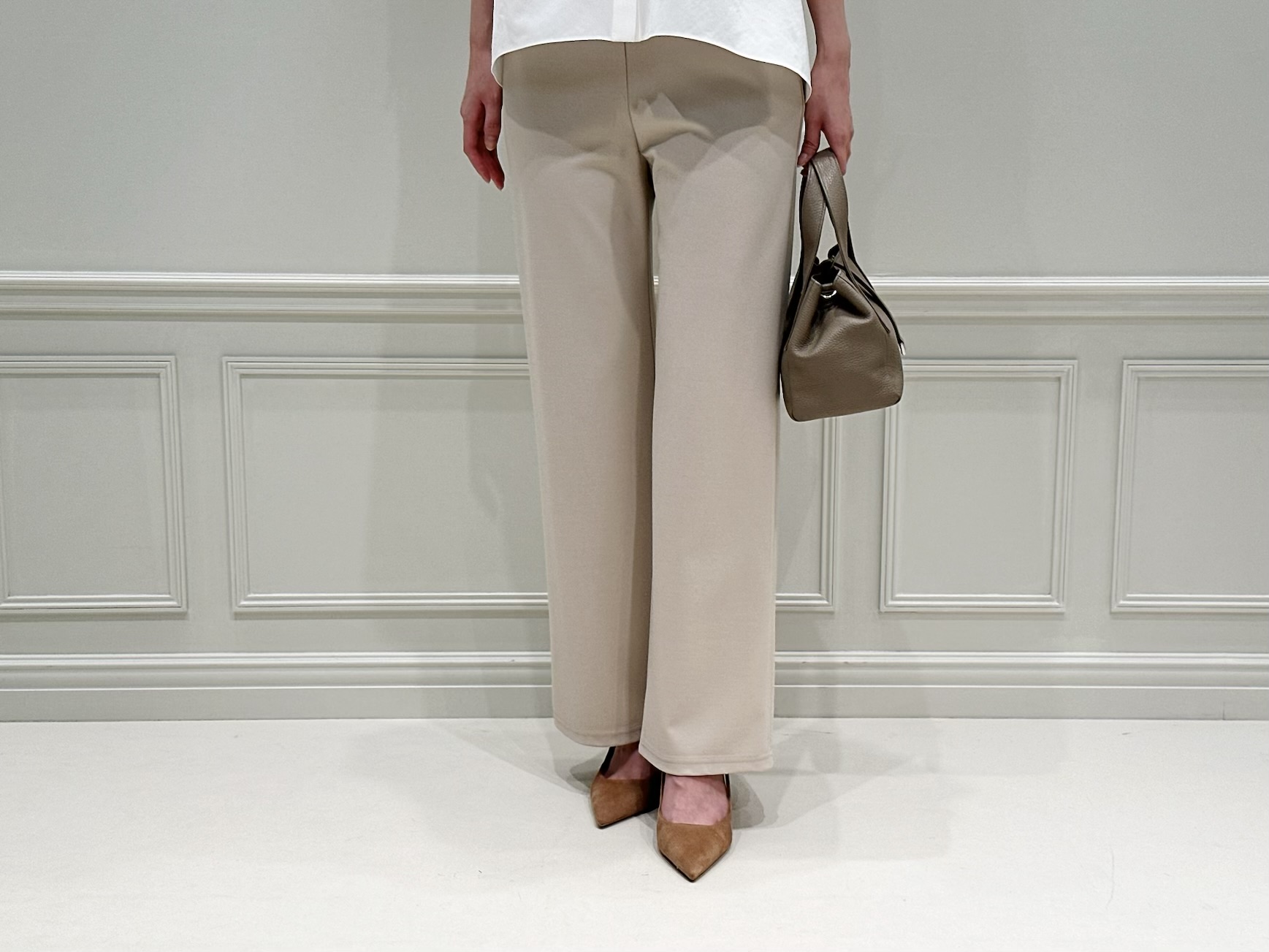 リラックス感がありながらも上品にまとまる、大人のバランスを意識しました。さらにベージュカラーを選ぶことで、白ブラウスとの相性もよく、柔らかく女性らしい印象に仕上がるのもポイントです!