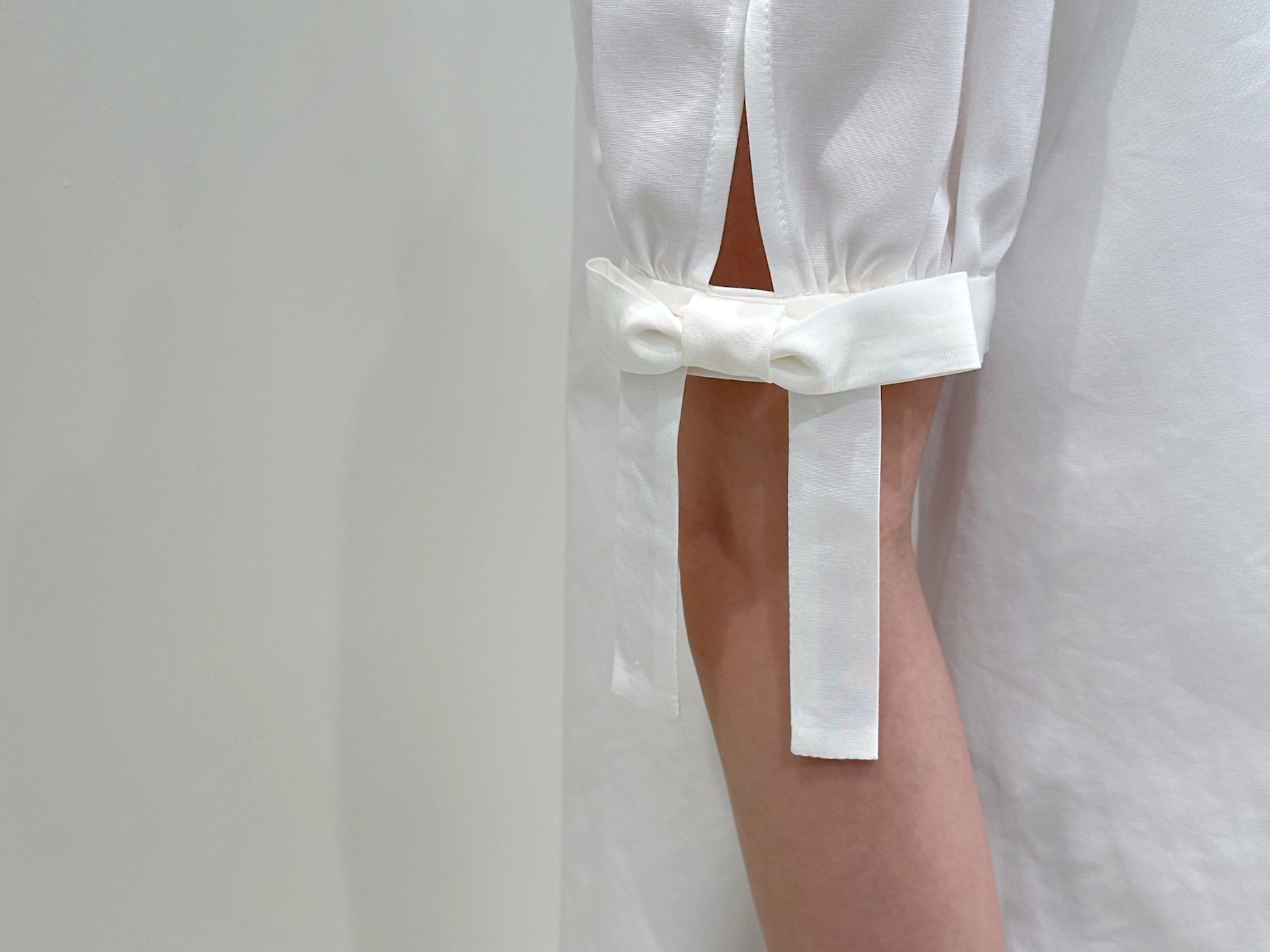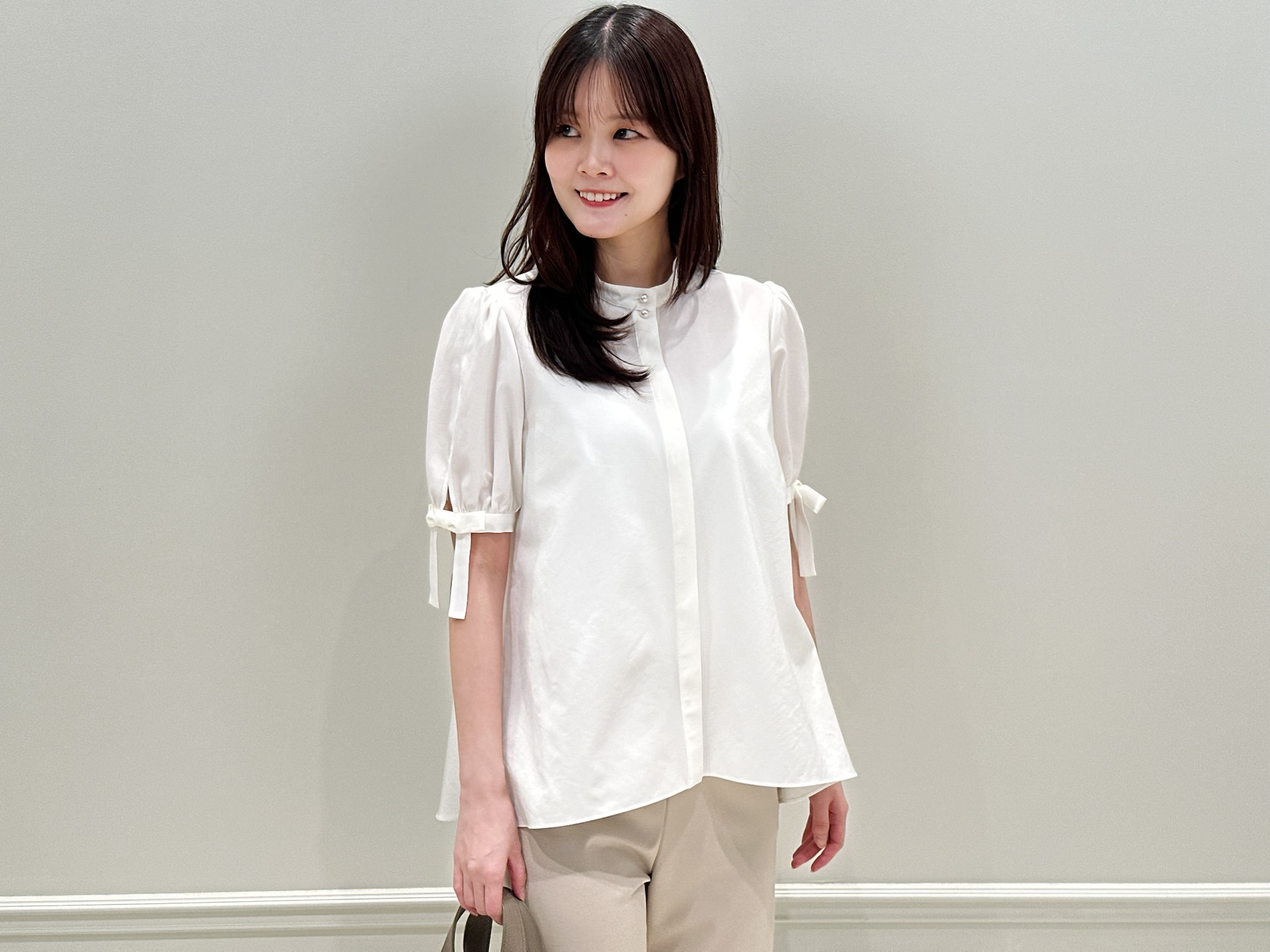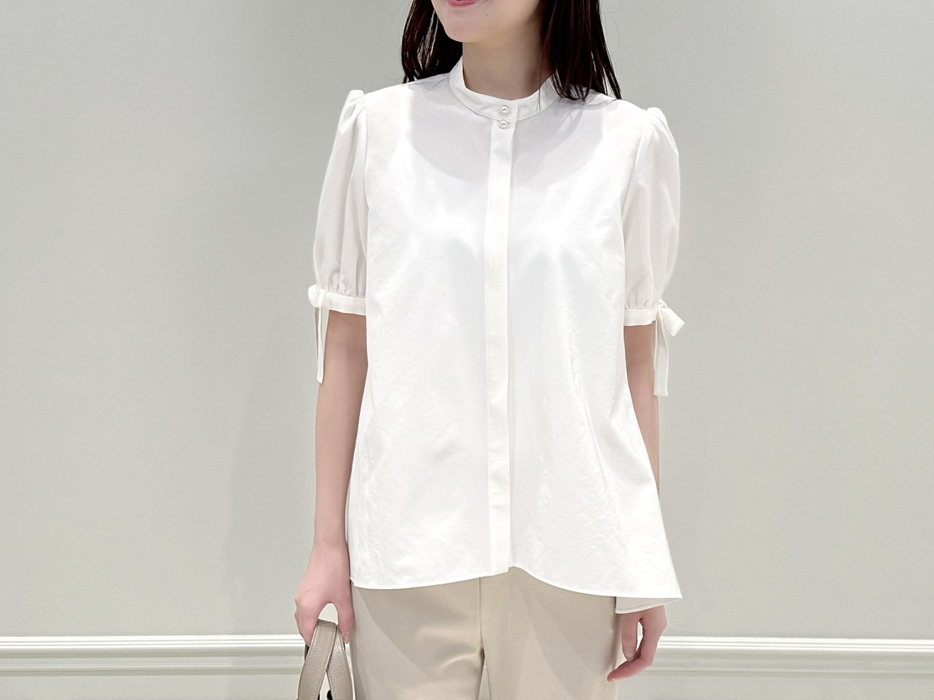 袖にはさりげなくリボンをあしらったパフスリーブデザインを取り入れ、程よい華やかさをプラス。また、首元はすっきりとしたバンドカラーなので甘くなりすぎず、洗練された雰囲気で着ていただけます。