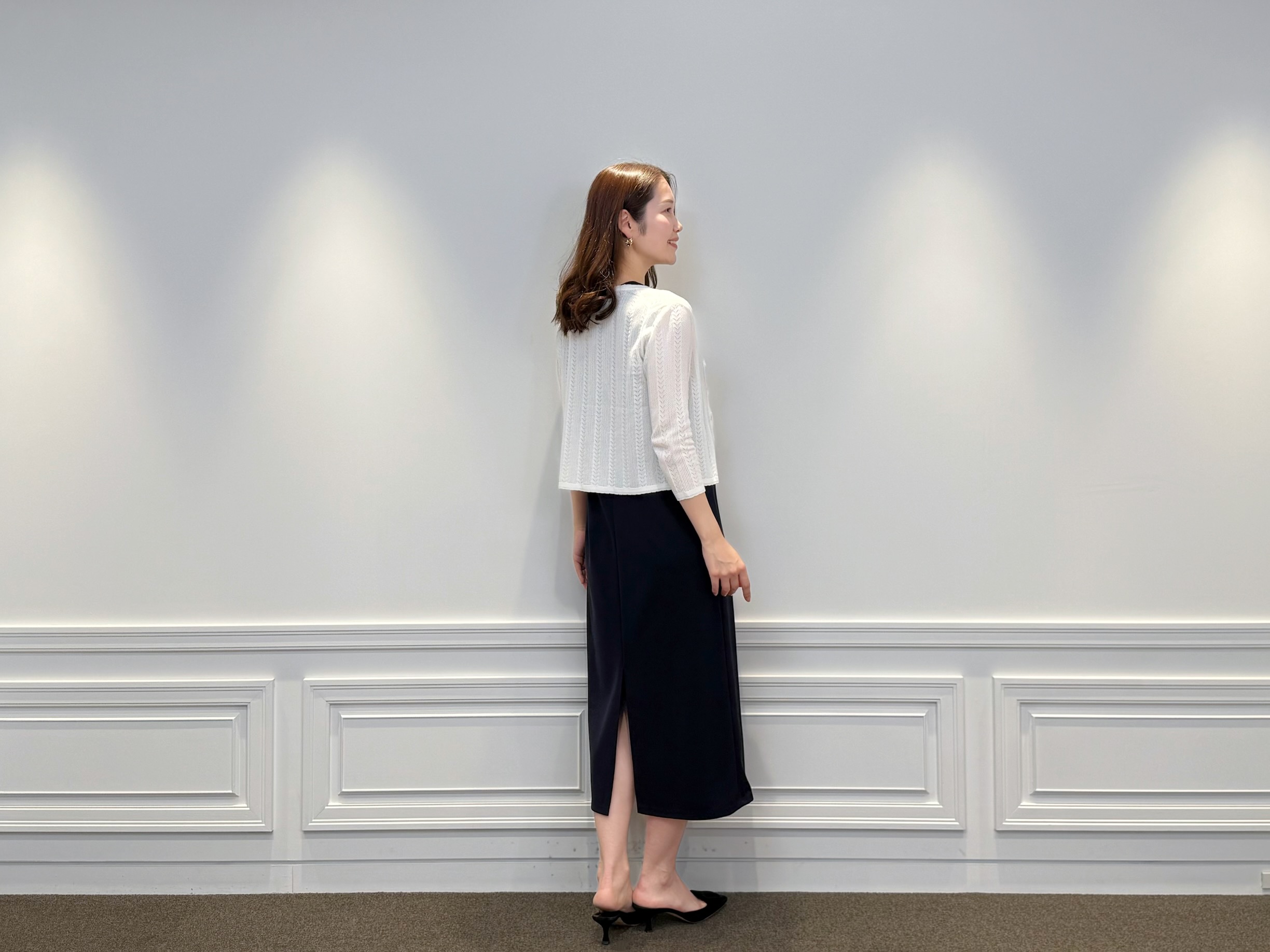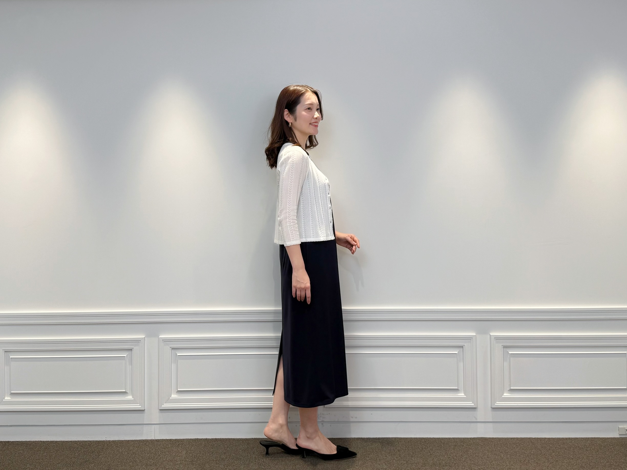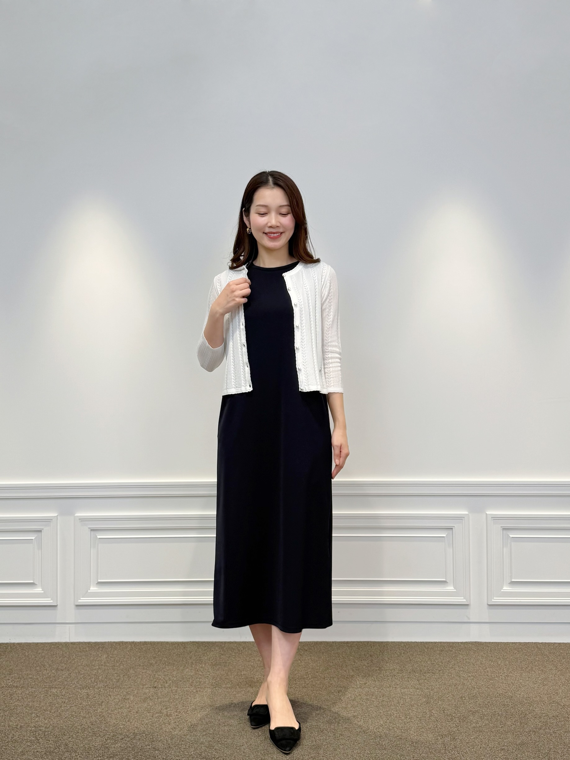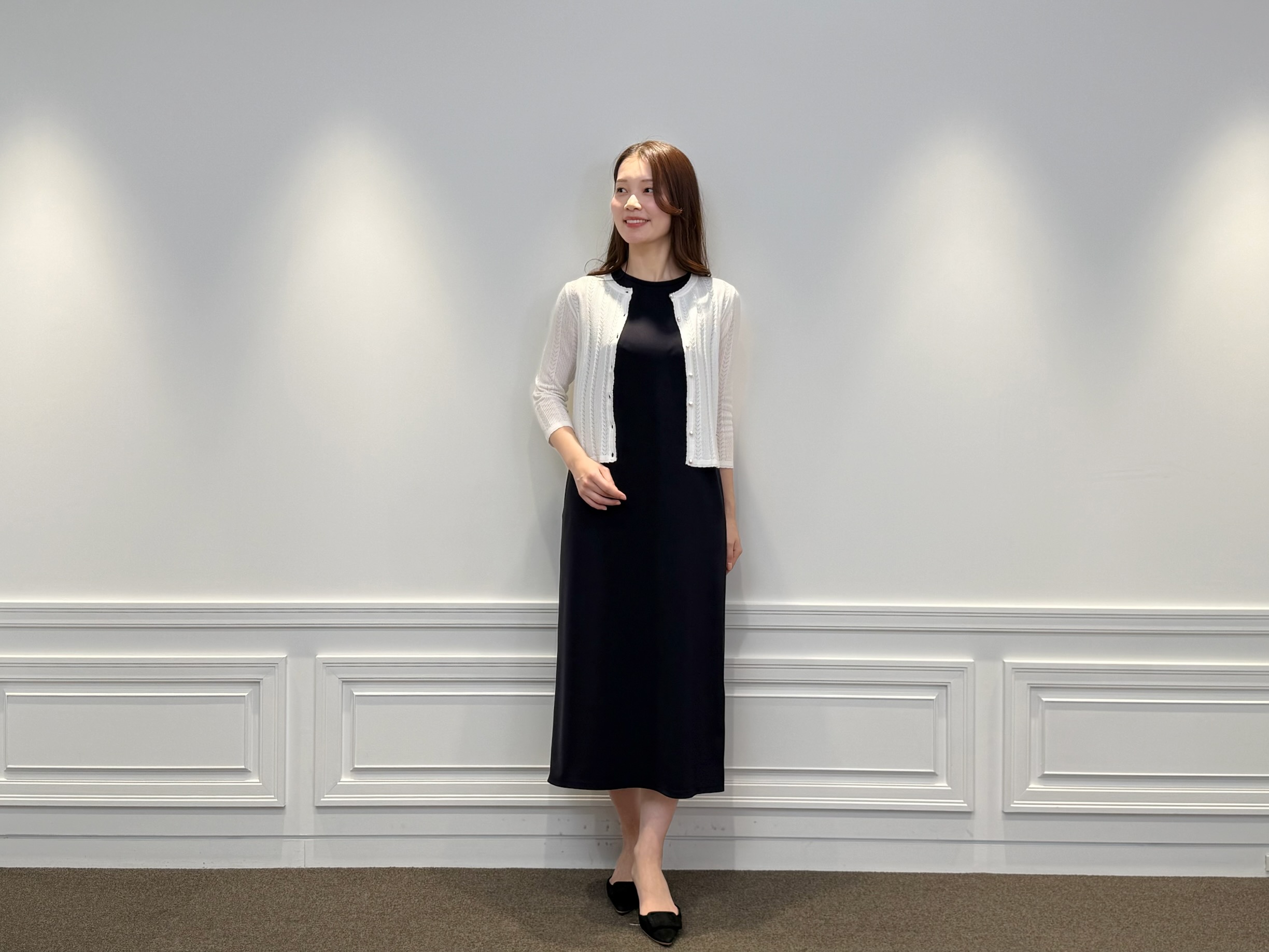 落ち着きのあるネイビーのIラインワンピースに、軽やかなホワイトのカーディガンを重ねた、清潔感と気品を感じさせるスタイリング。縦のラインを意識したシルエットがすっきりとした印象を生み、洗練された佇まいへと導きます。足元には黒のミュールを合わせ、抜け感を添えながらも大人らしい落ち着きをキープ。シンプルながら素材の表情が引き立つ、端正で美しいバランスの装いです。