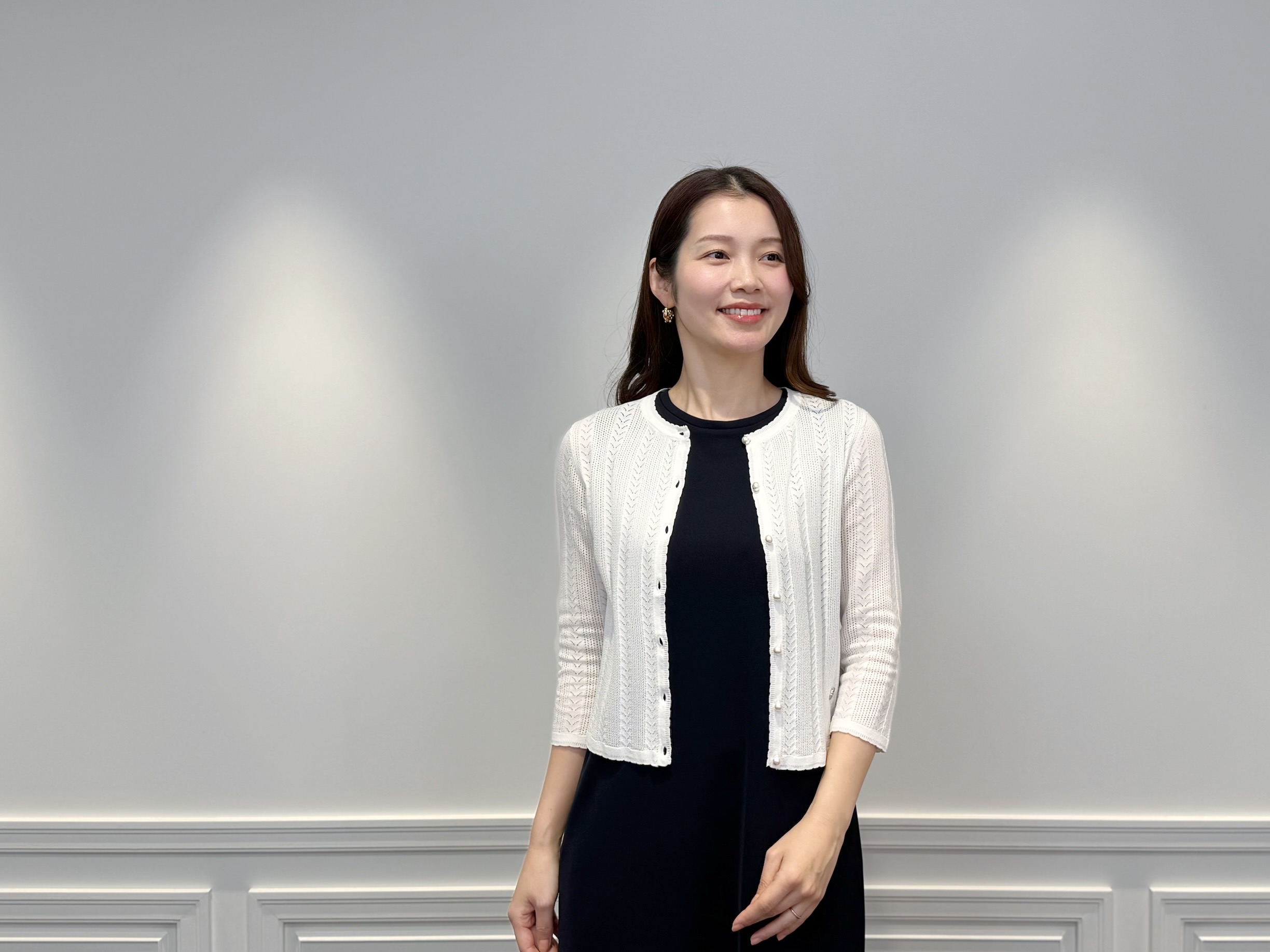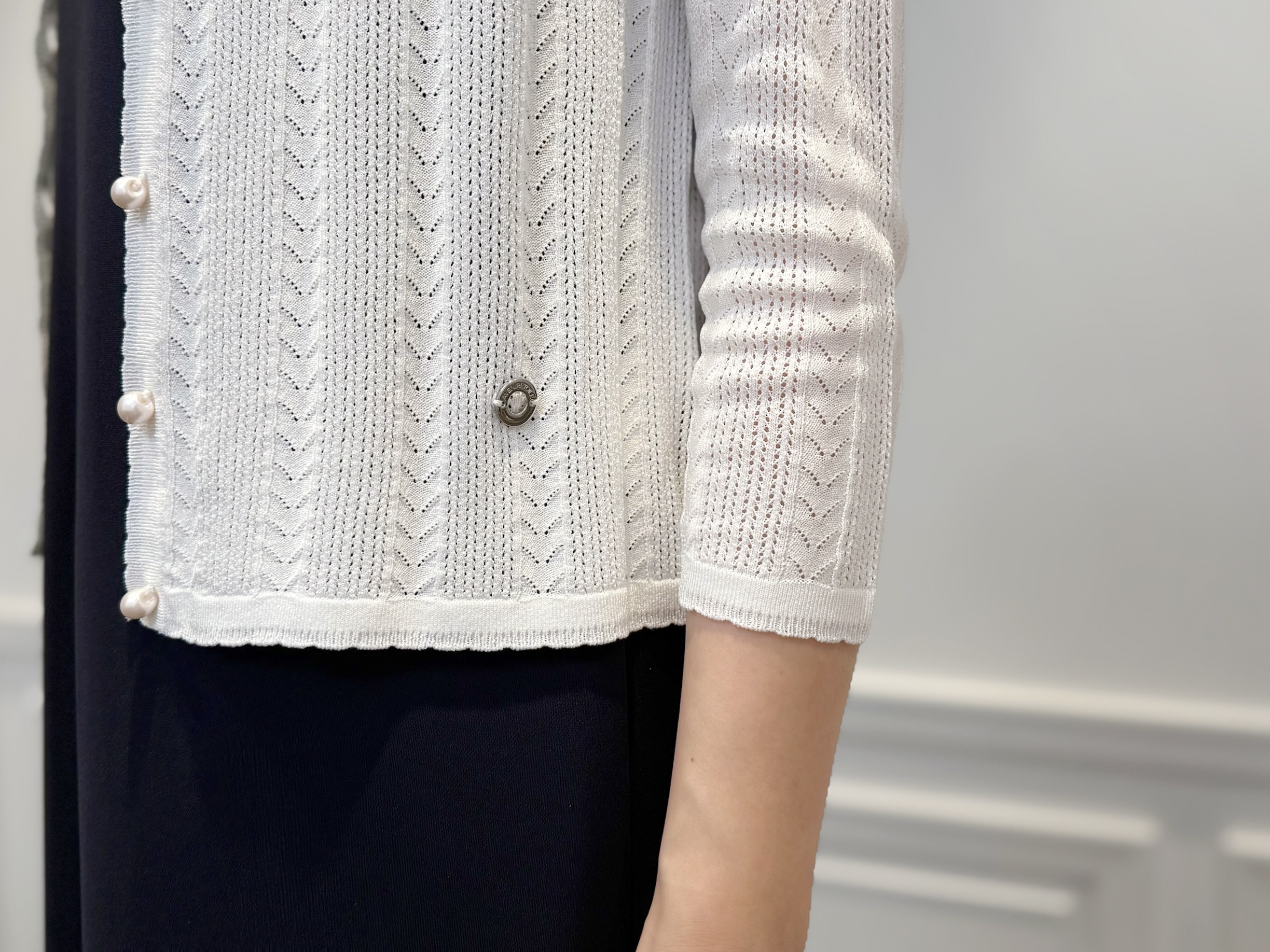 <透かし編みニットカーディガン>は、繊細な透かし編みで軽やかな表情が魅力の一枚。羽織るだけで装いに柔らかなニュアンスを添えてくれます。また七分袖のデザインが手首をすっきりと見せ、軽やかな女性らしさを演出。フロントにはパール調ボタンがあしらわれ、控えめながらも華やかなアクセントとなっています。ご家庭で手洗い可能でスチームにも対応しており、日常の装いに取り入れやすい実用性も魅力です。