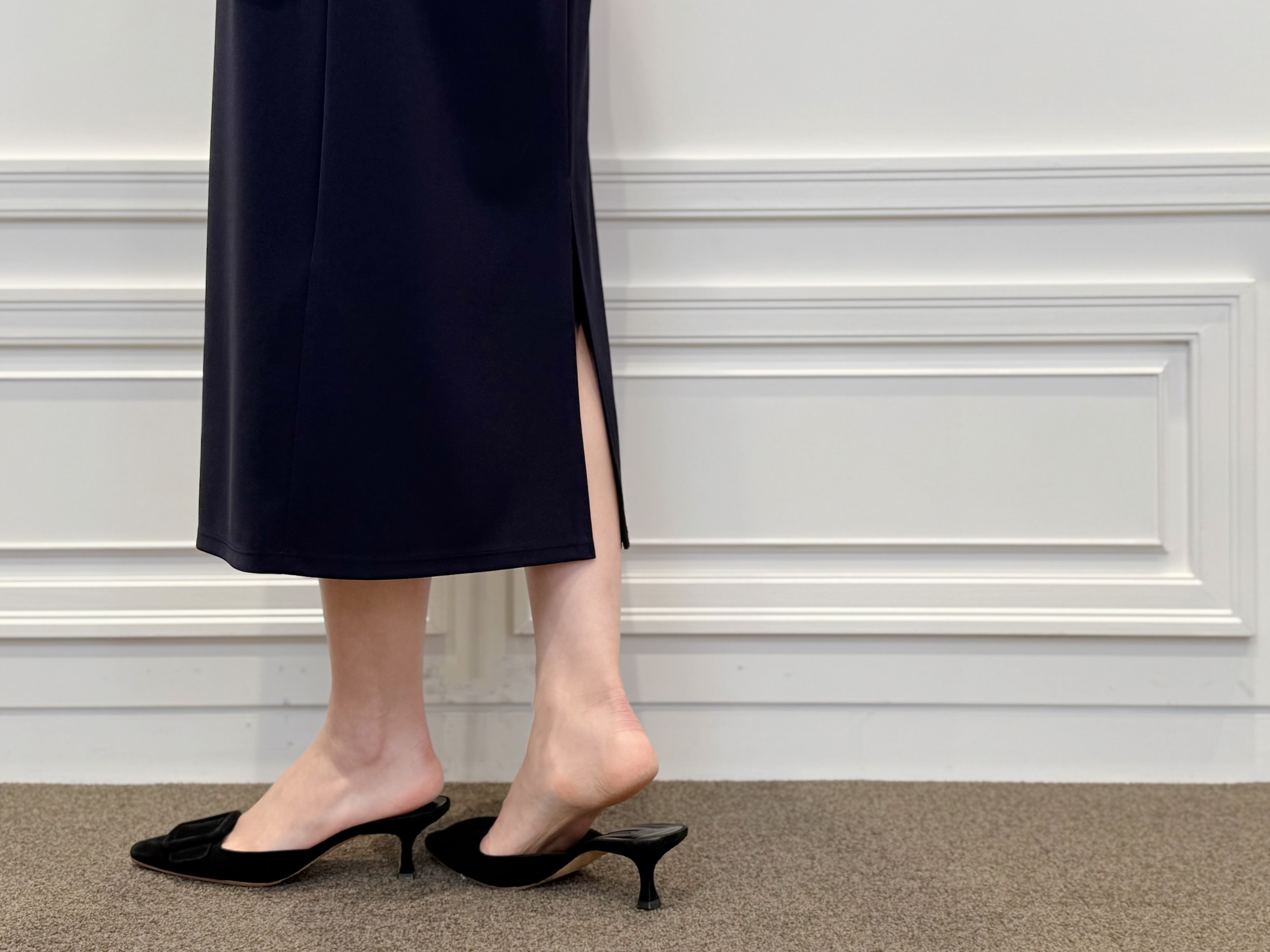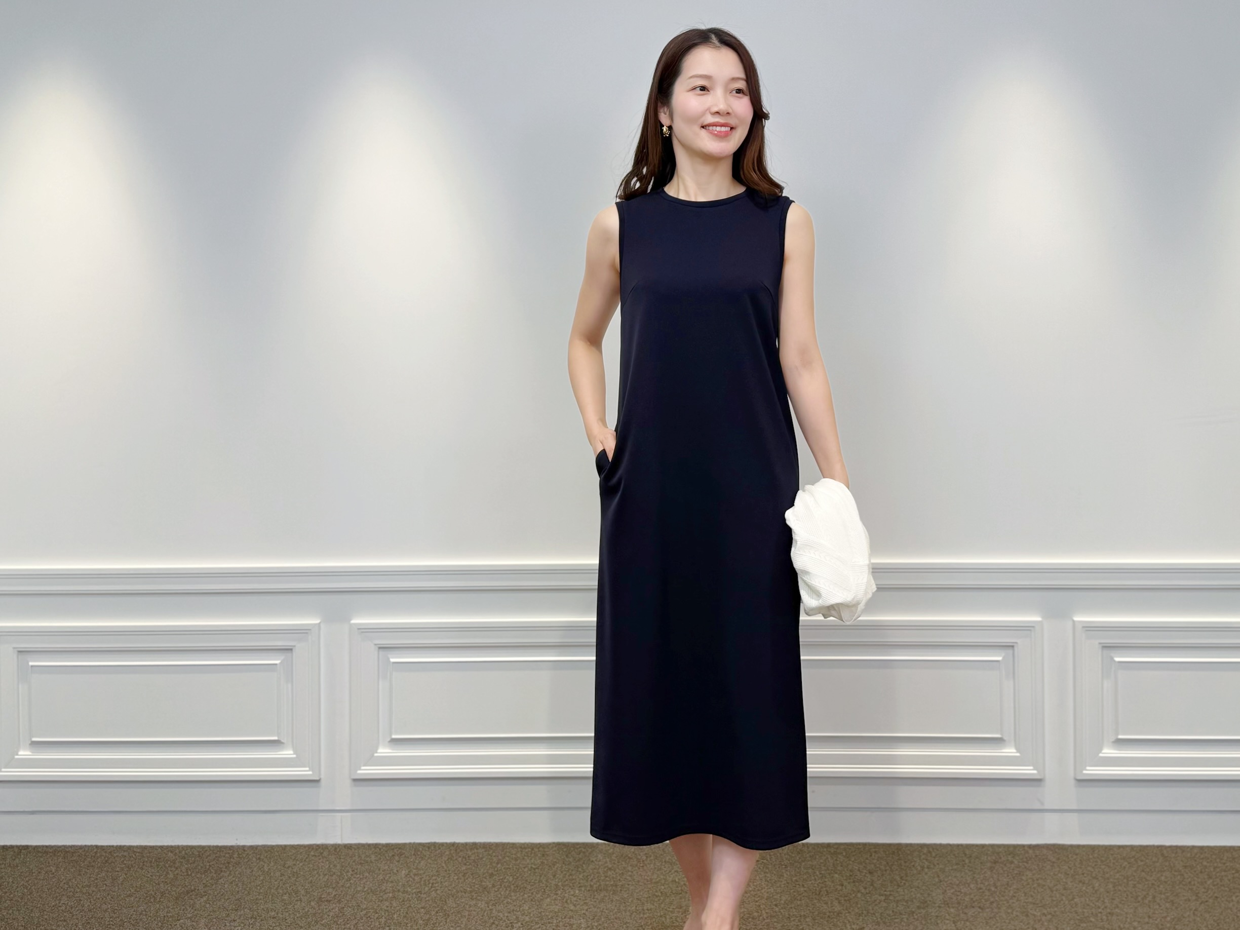 <ノースリーブIラインワンピース>は、シンプルでありながら美しい縦のラインを強調するシルエットが魅力。すっきりとしたフォルムが体のラインを美しく見せ、洗練された印象を与えてくれます。上品なネイビーカラーはホワイトのカーディガンと好相性で、落ち着きの中に華やぎを添える絶妙な配色に。シンプルなミュールを合わせることで足元に軽やかな抜け感が生まれ、全体をバランスよくまとめてくれます。