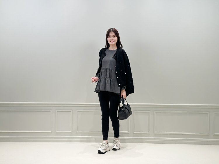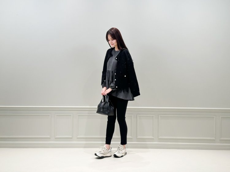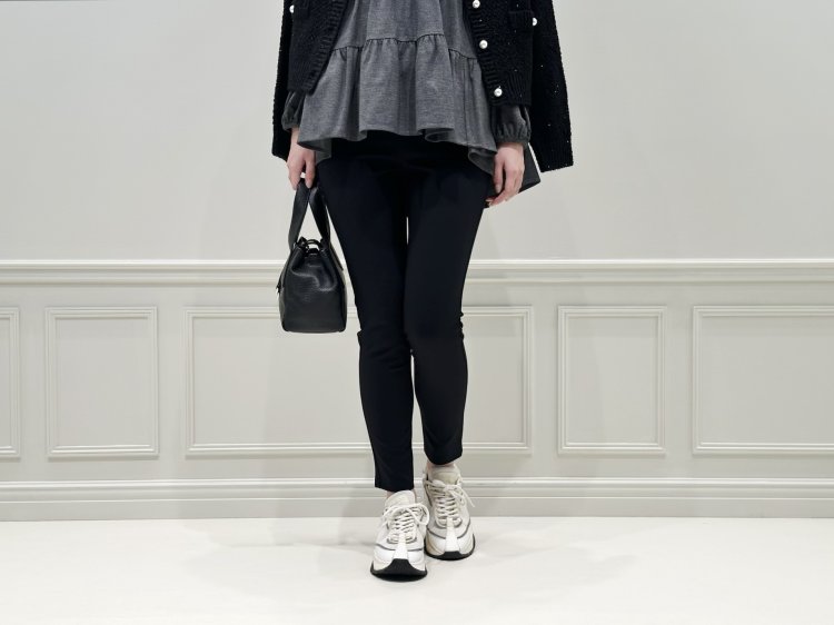 そんな大人の余裕を感じさせる“きれいめカジュアル”がこのコーデの魅力です。レギンスパンツ×スニーカーのラフさに、スパンコールの輝きをひとさじ。