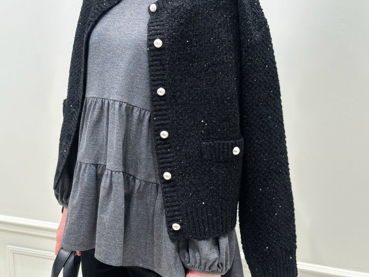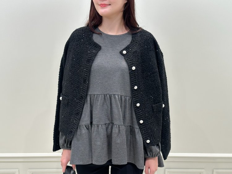 パールボタンがアクセントになり、よりモードで都会的な印象に仕上がります。繊細なスパンコールが散りばめられ、動くたびにさりげなく輝く華やぎニット。柔らかな肌触りと軽やかな着心地で、秋冬の羽織りとしても重宝します!