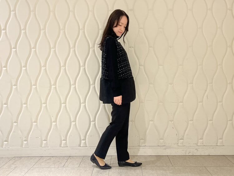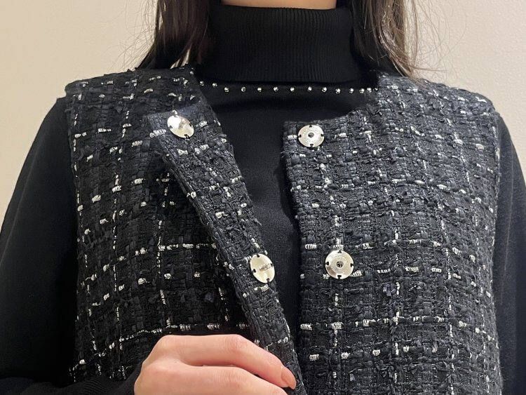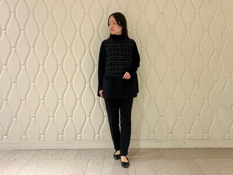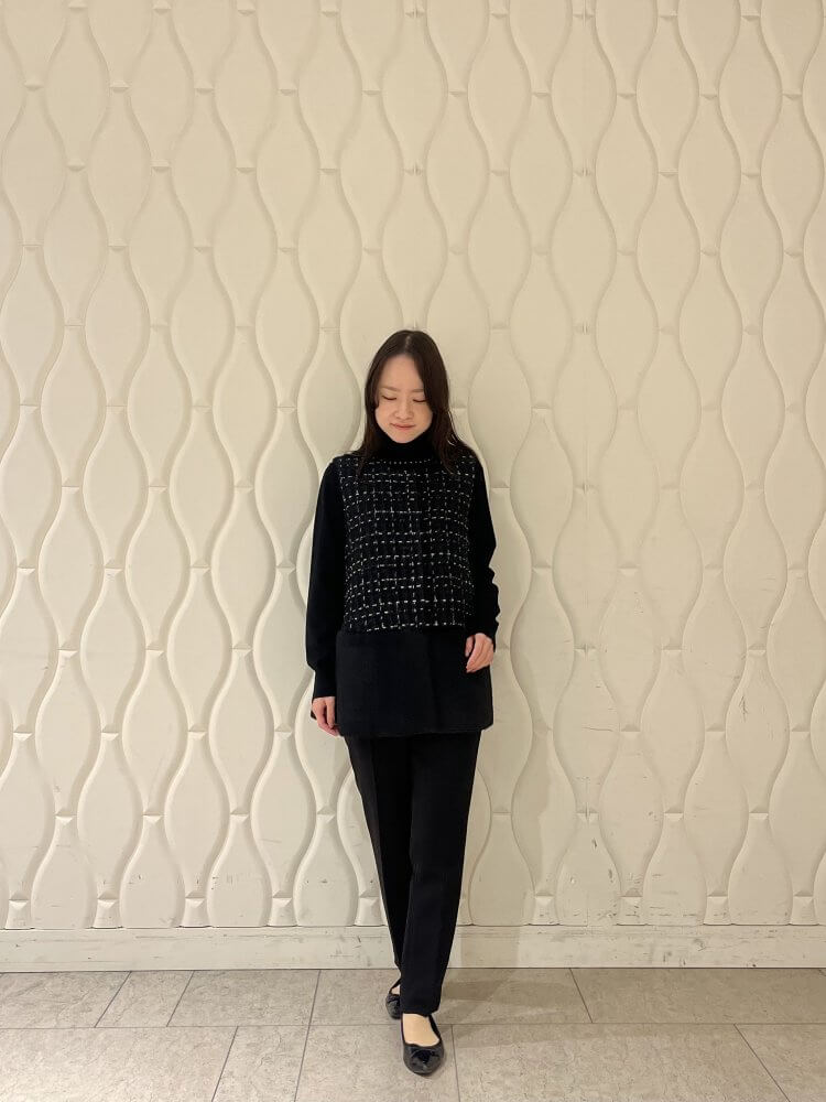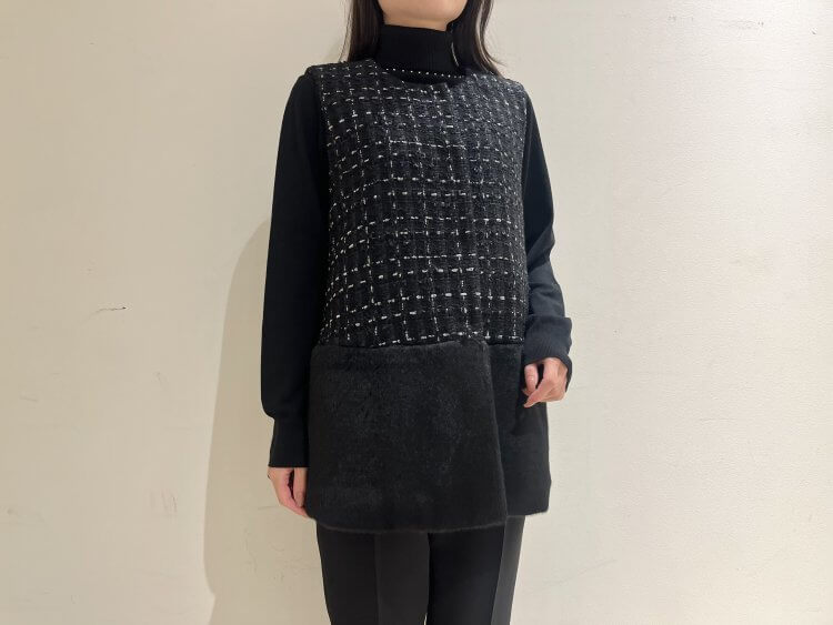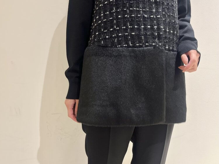 本日のコーディネートでは、ブラックのニットとパンツに重ねてシックにまとめました。ツイードのクラシカルな雰囲気と、裾のファーがもたらすリッチな質感が組み合わさり、シンプルなスタイリングに奥行きをプラス。ワントーンコーデに取り入れるだけで、洗練されたモード感漂うスタイルが完成します。