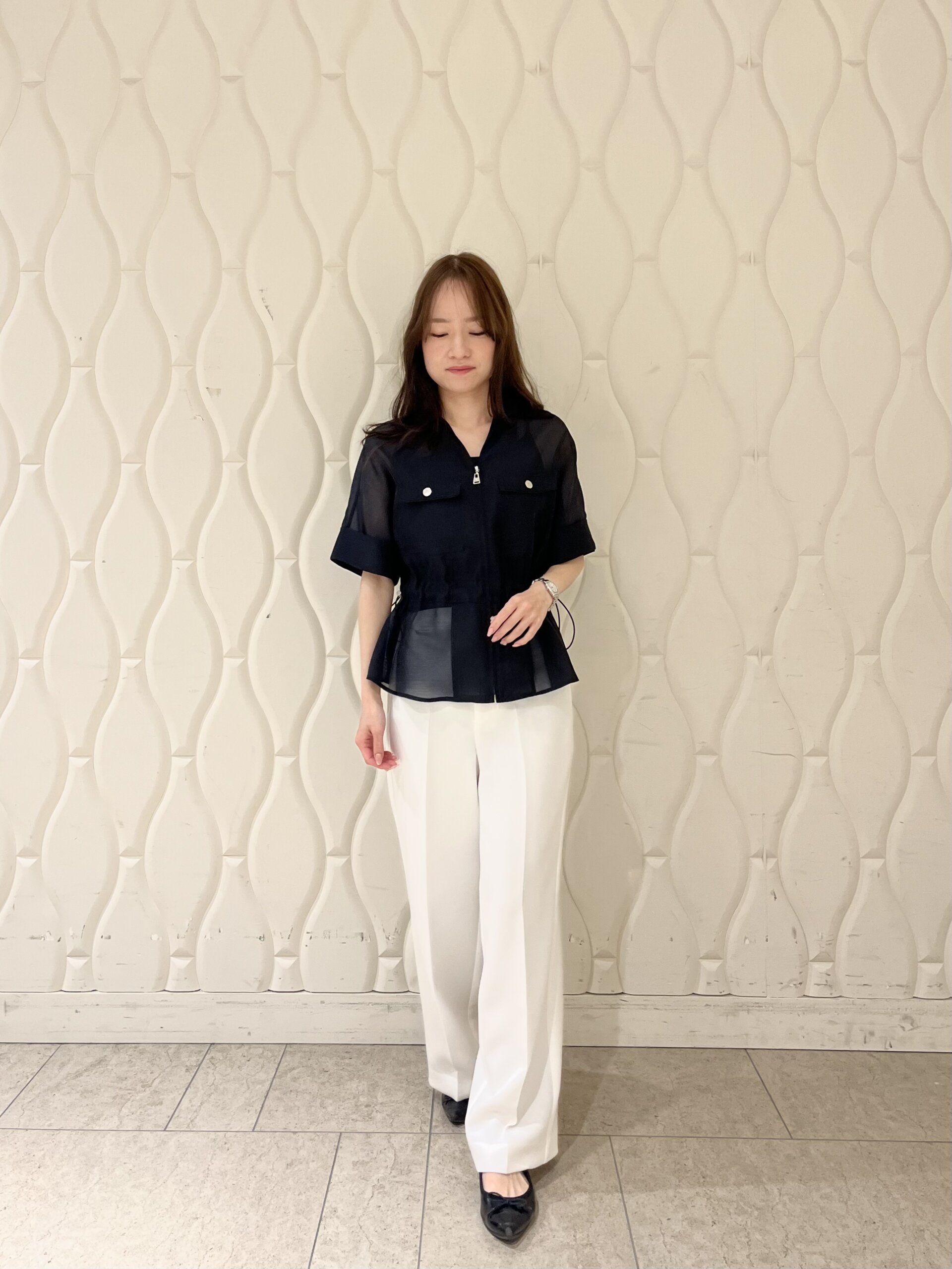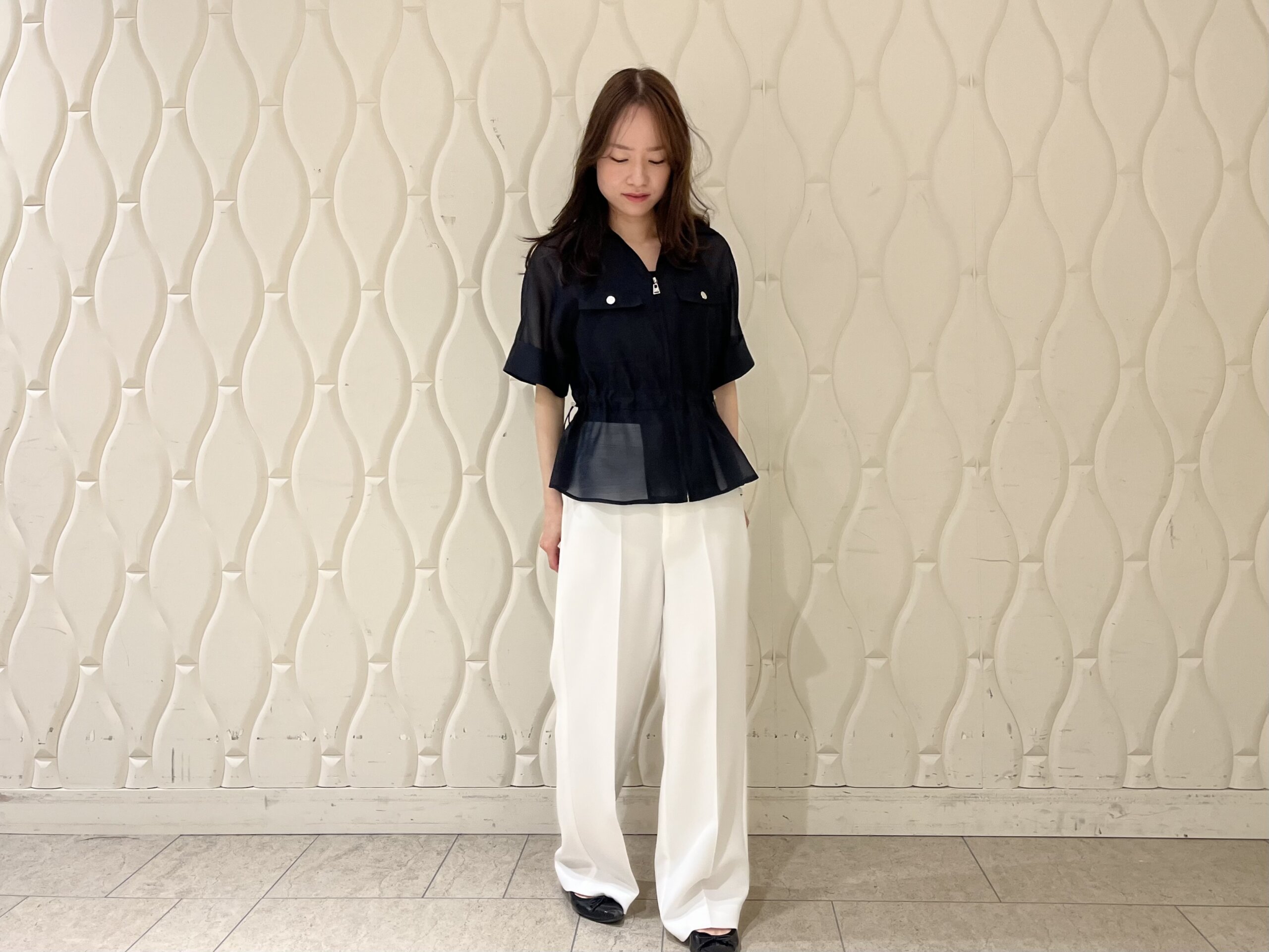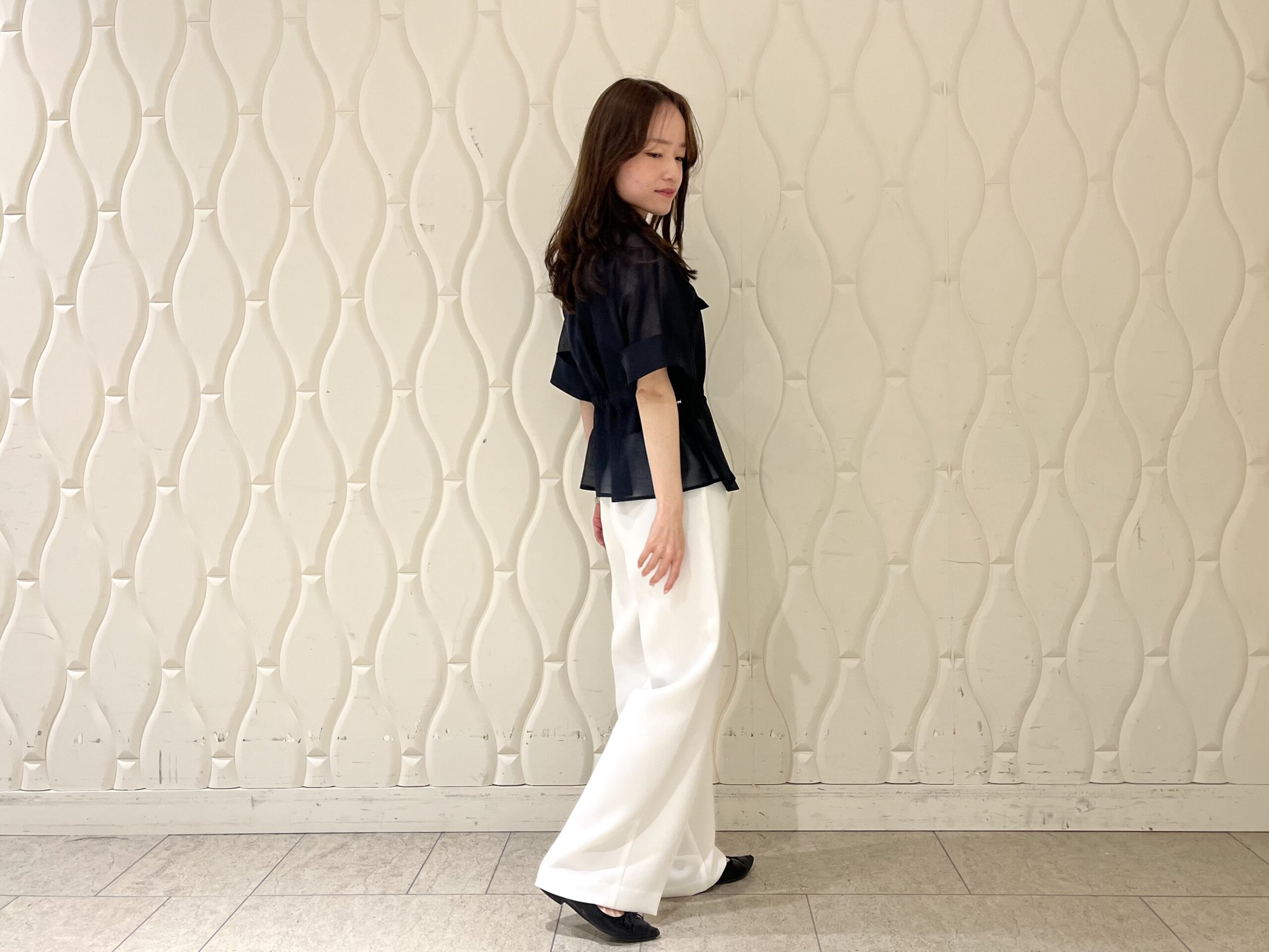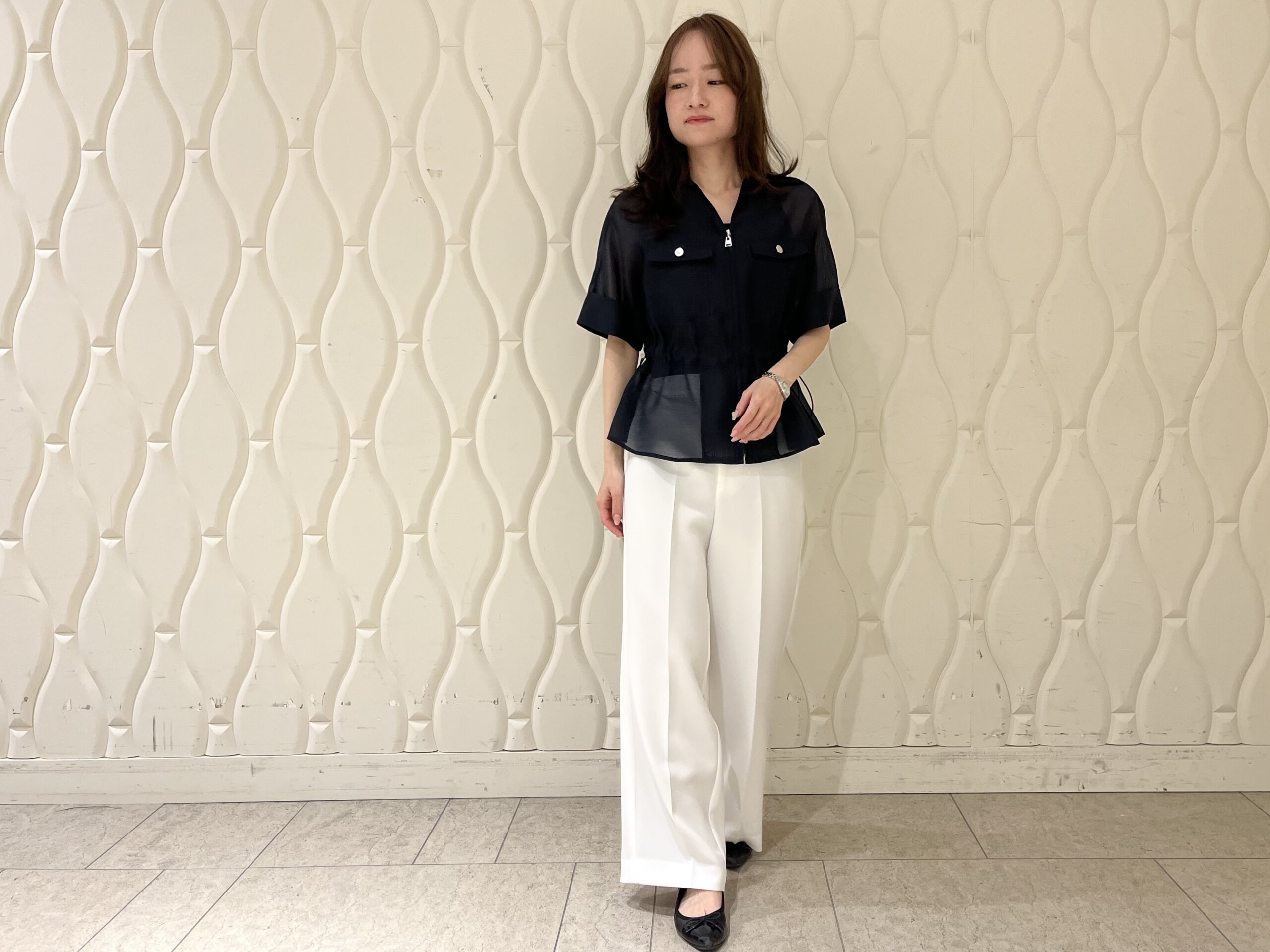 今回はホワイトのワイドパンツと合わせ、モノトーンでまとめたきれいめスタイルに。