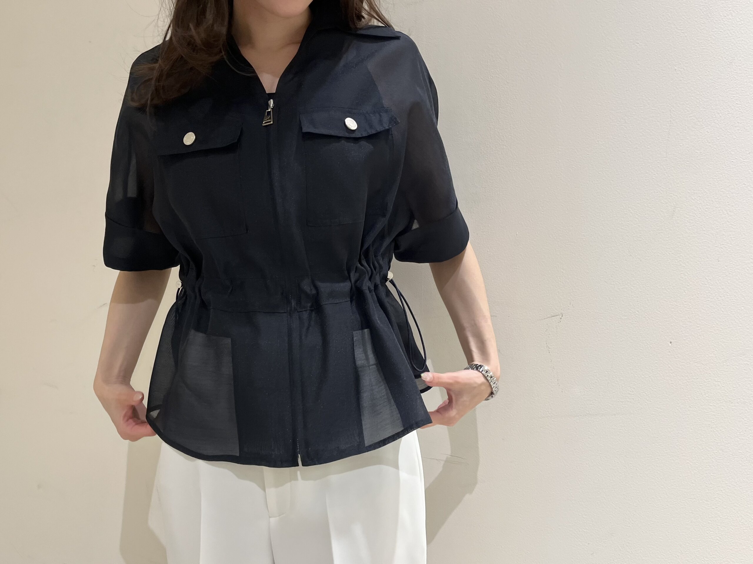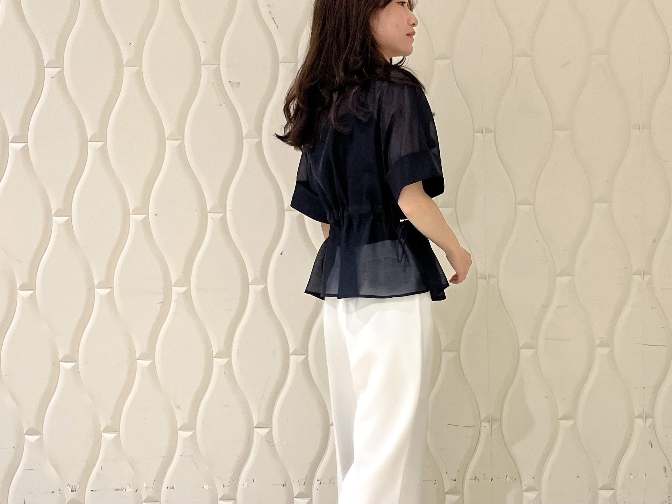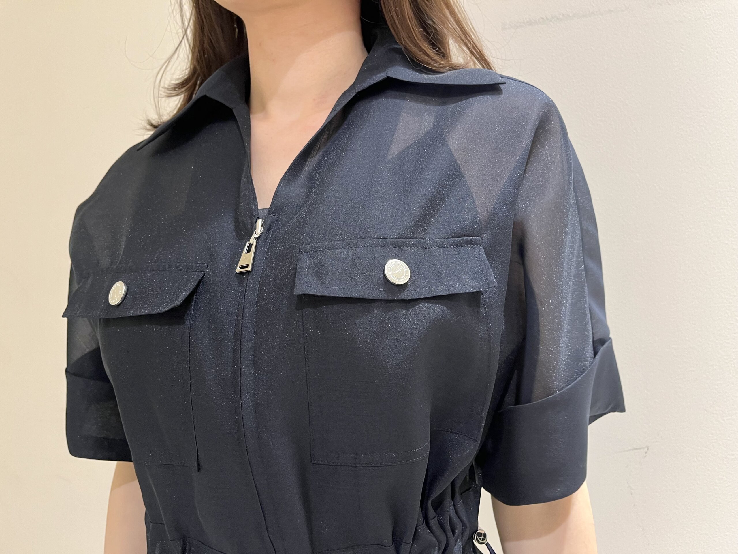 ネイビーカラーでも重たく見えず、涼しげで軽やかな印象に仕上がるのがシアー素材ならではの魅力です。