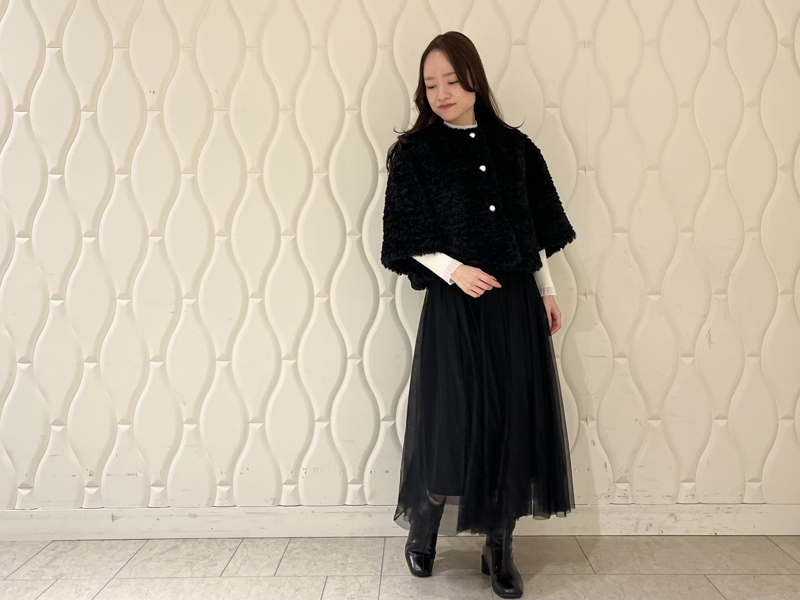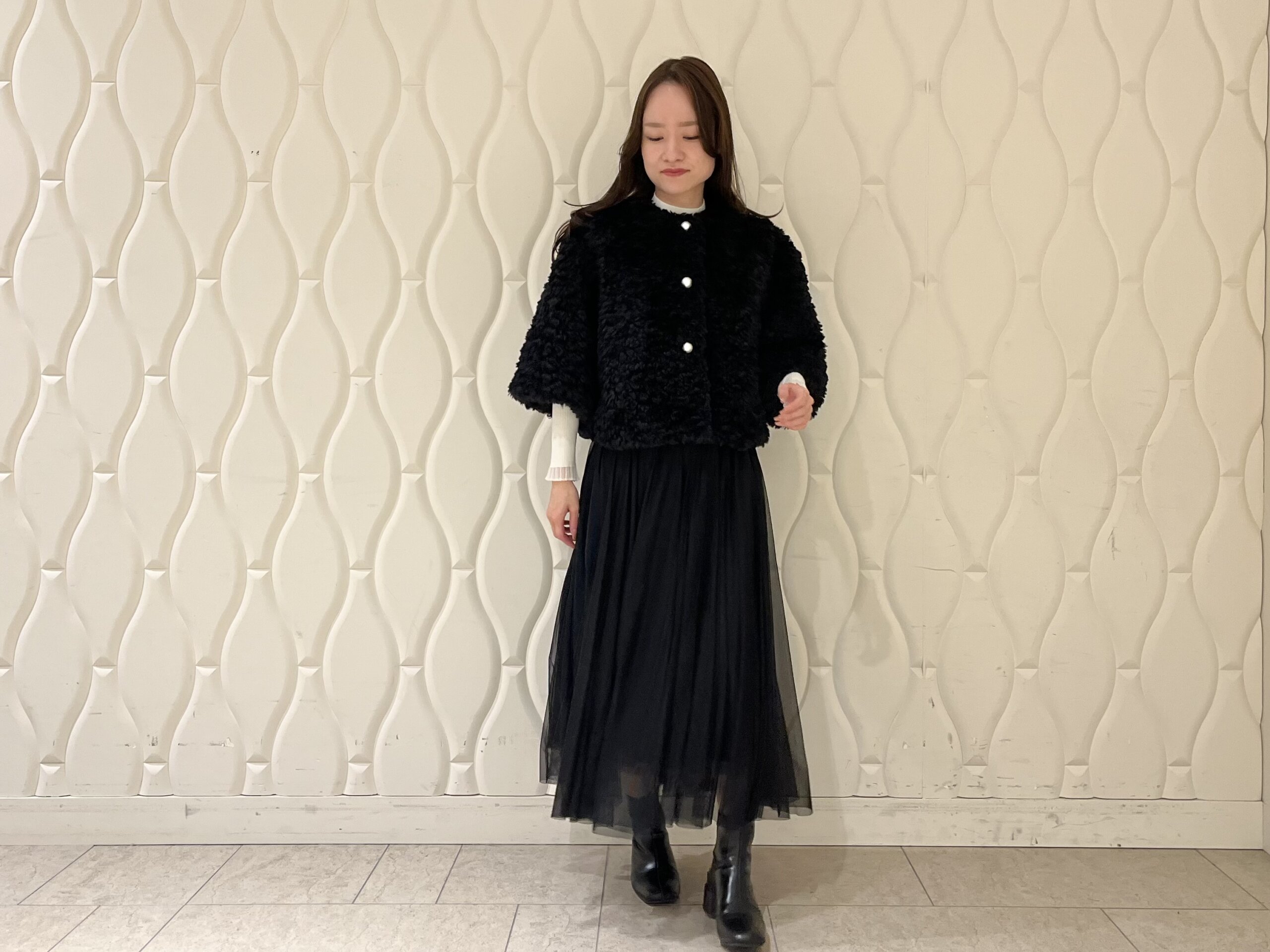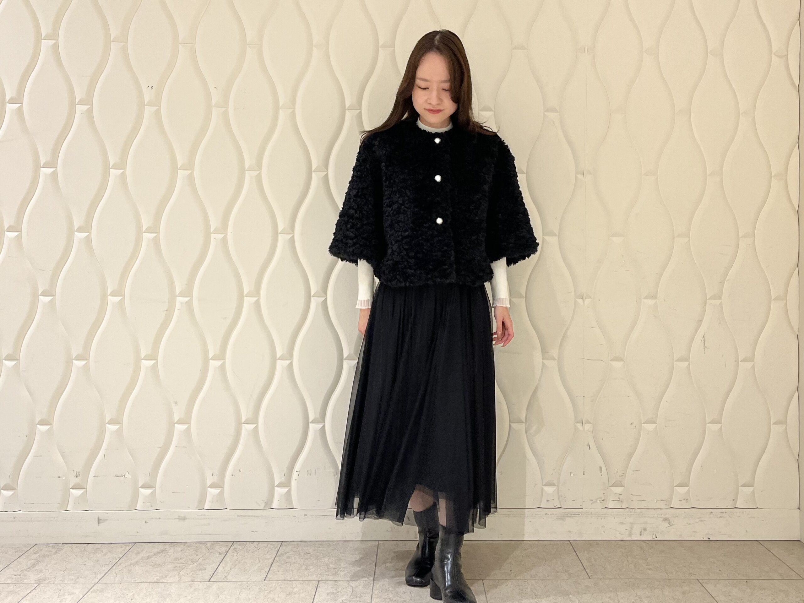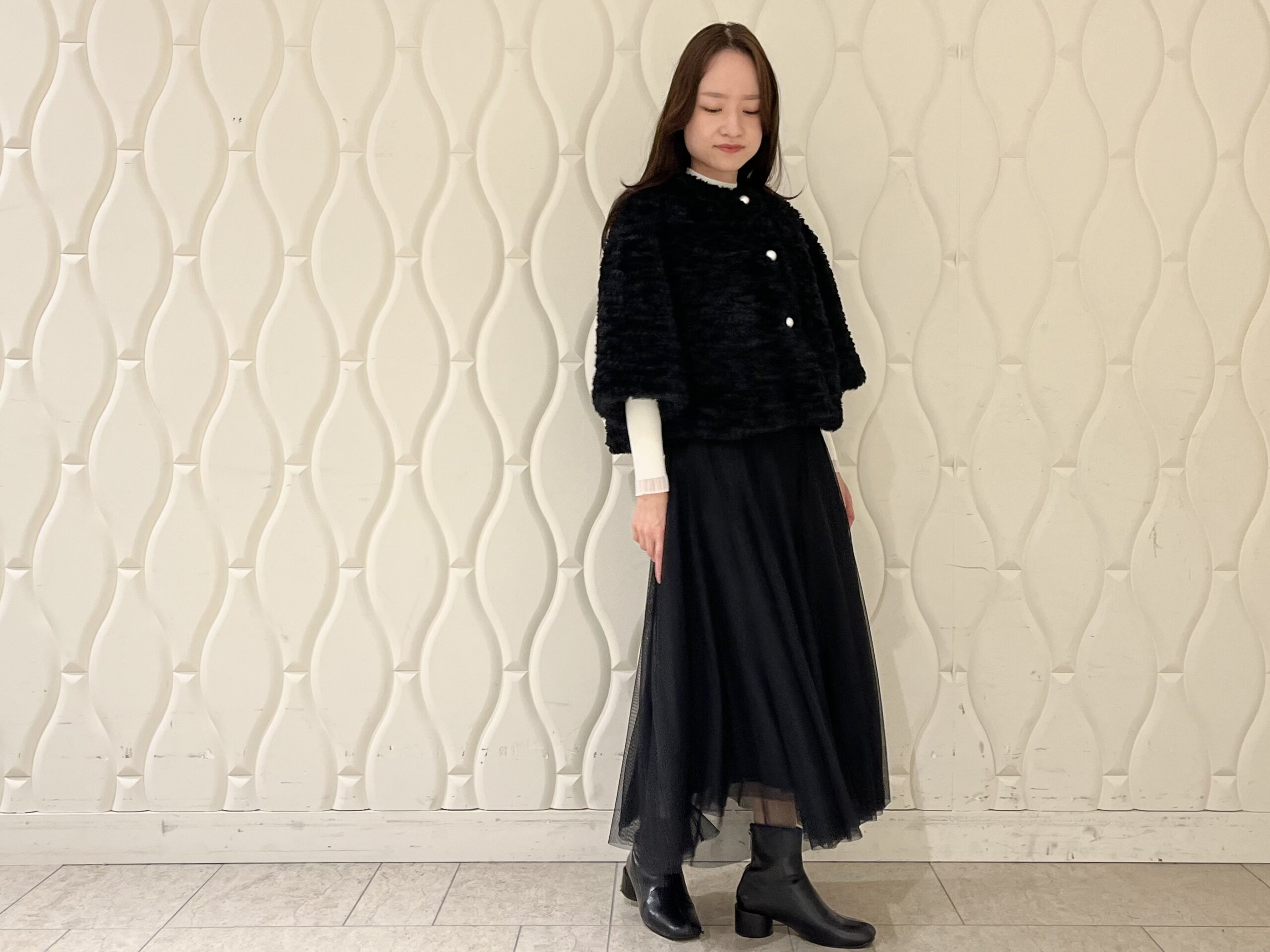 合わせたのは、動くたびに軽やかに揺れるチュールスカート。透け感のある素材がファーのボリュームを引き立て、重たくなりがちな冬のスタイリングに抜け感を演出します。