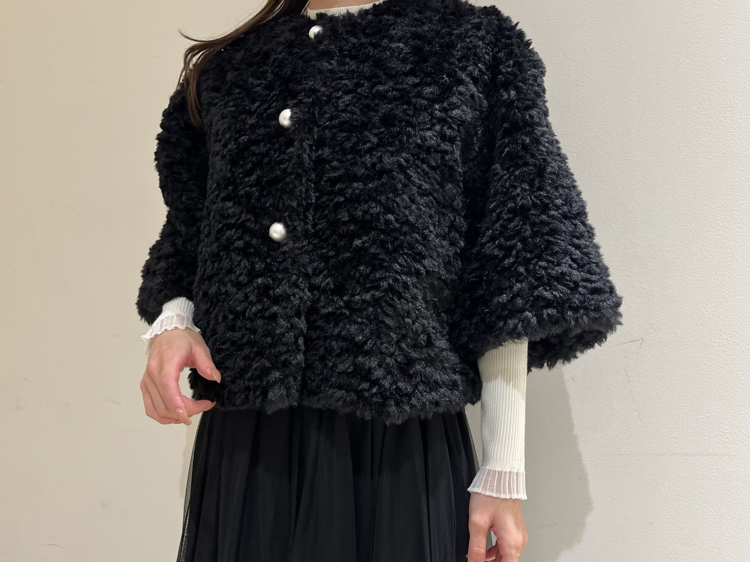 ふんわりとした質感とパールの輝きで、冬のスタイルを優雅に彩る一枚。上品なブラックコーデで、洗練された冬のお出かけをお楽しみください。
