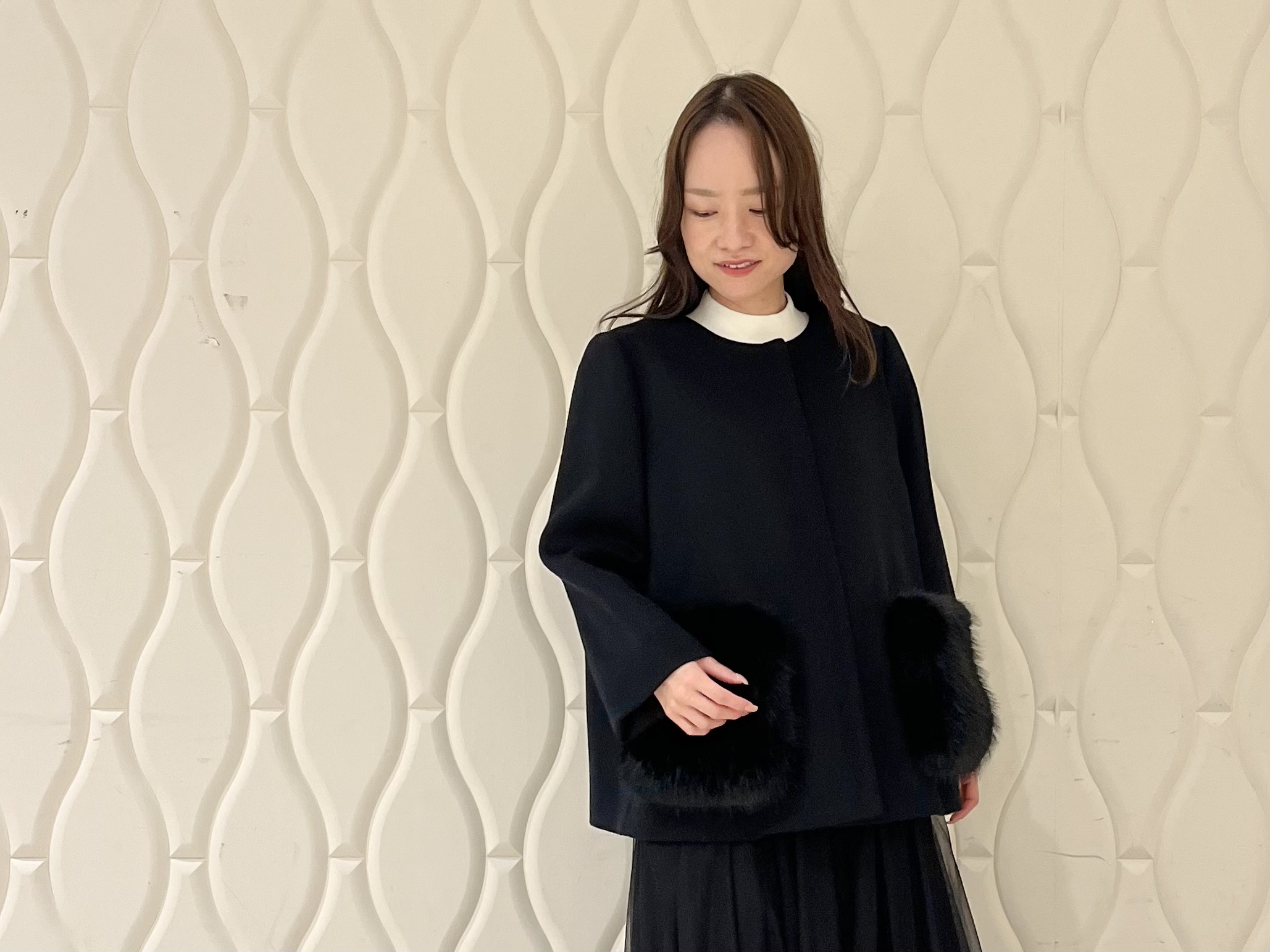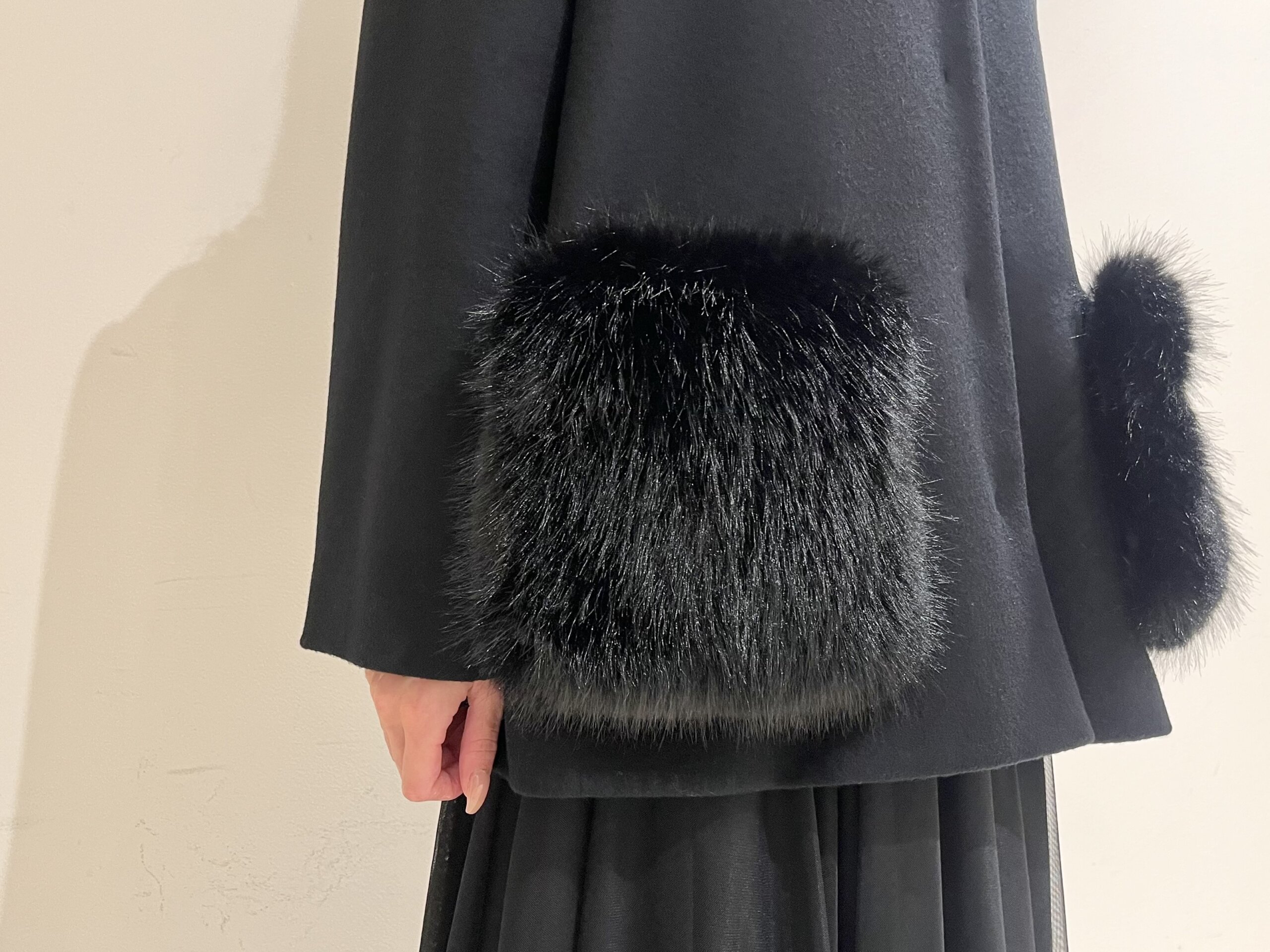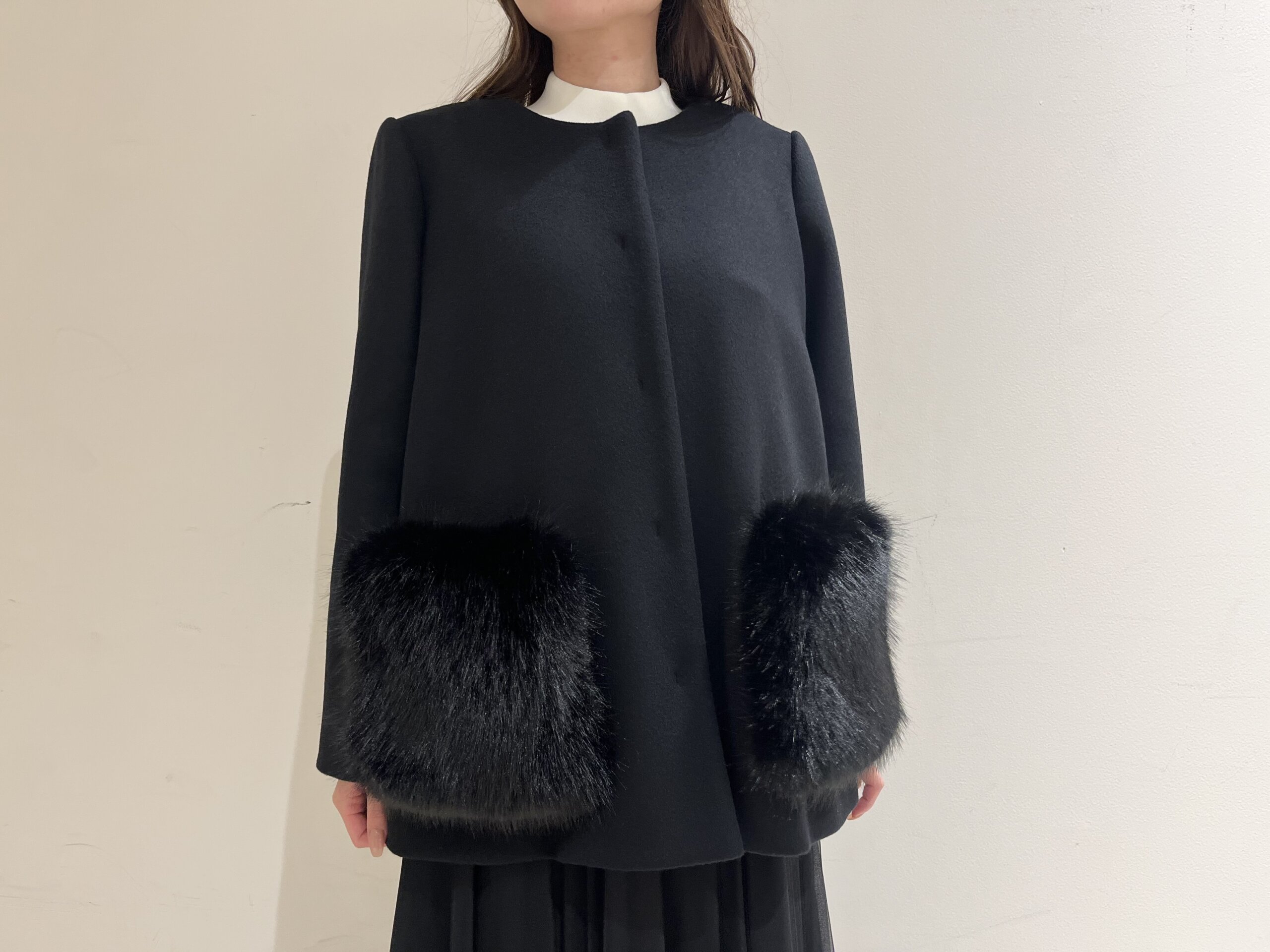 大きめのフェイクファーポケットがほどよい華やぎを添え、シンプルな黒のコートに立体感をプラス。