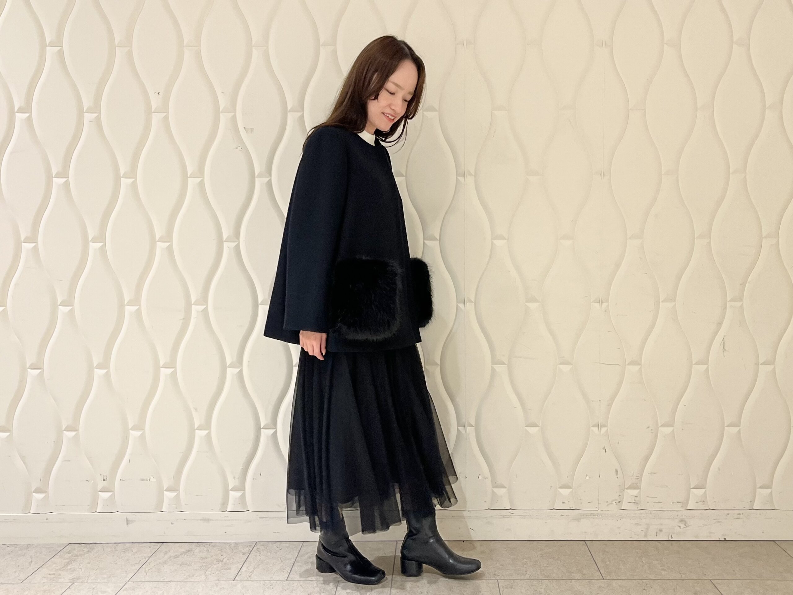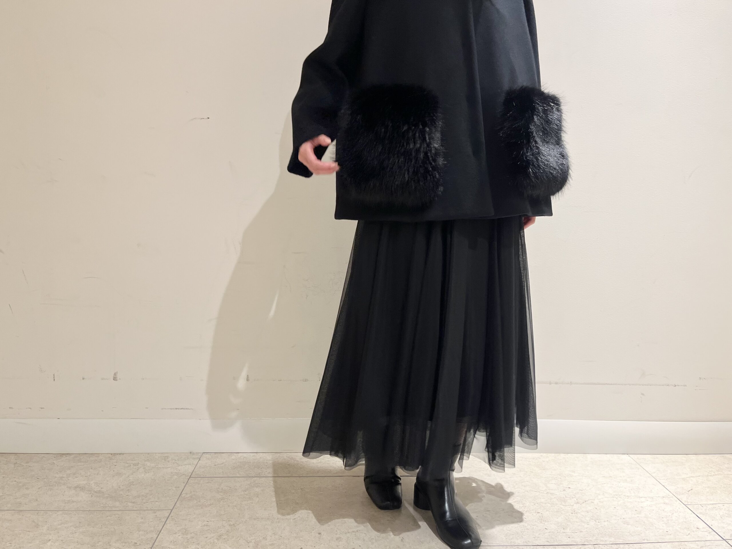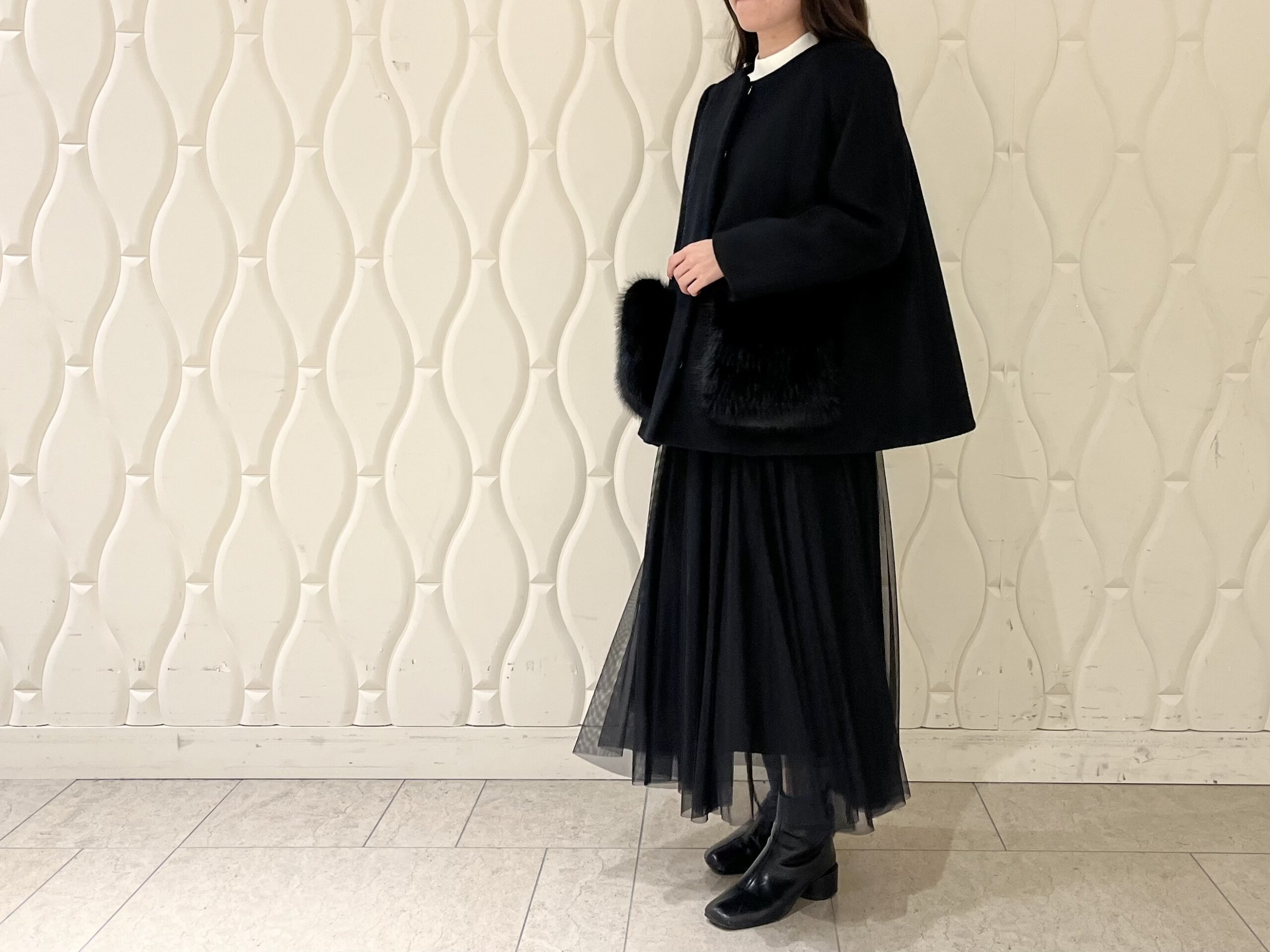 動くたびに揺れるチュールスカートと合わせれば、同じブラックでも異素材のレイヤードによって軽さと深みが生まれ、冬のオールブラックスタイルがぐっと洗練された印象に。