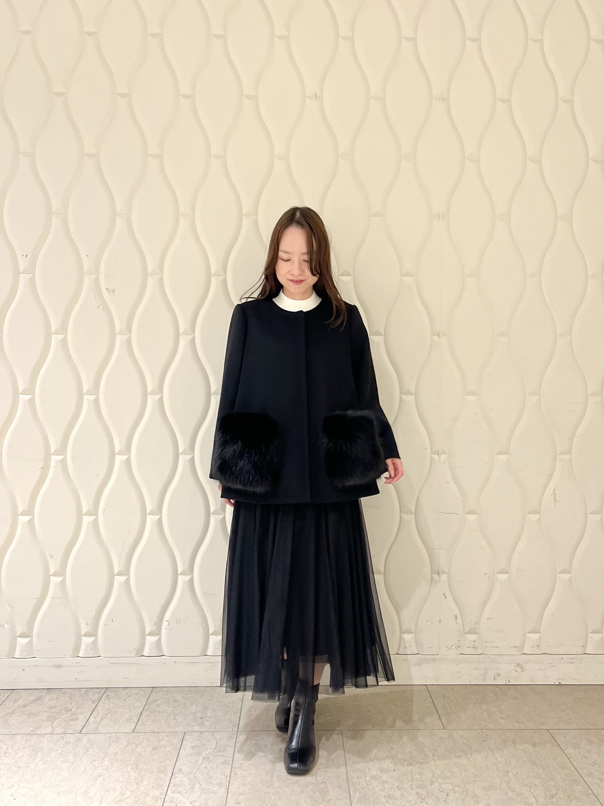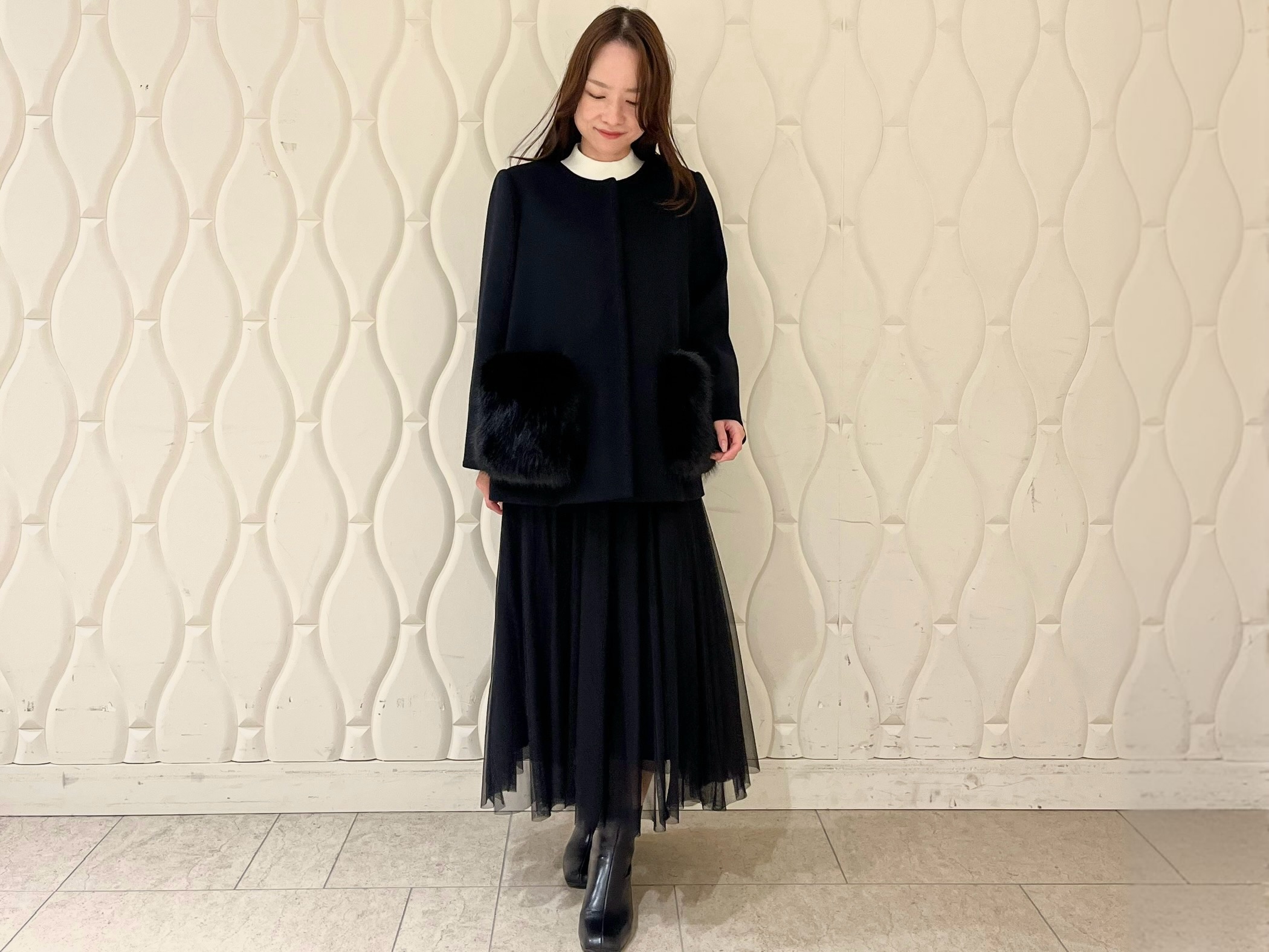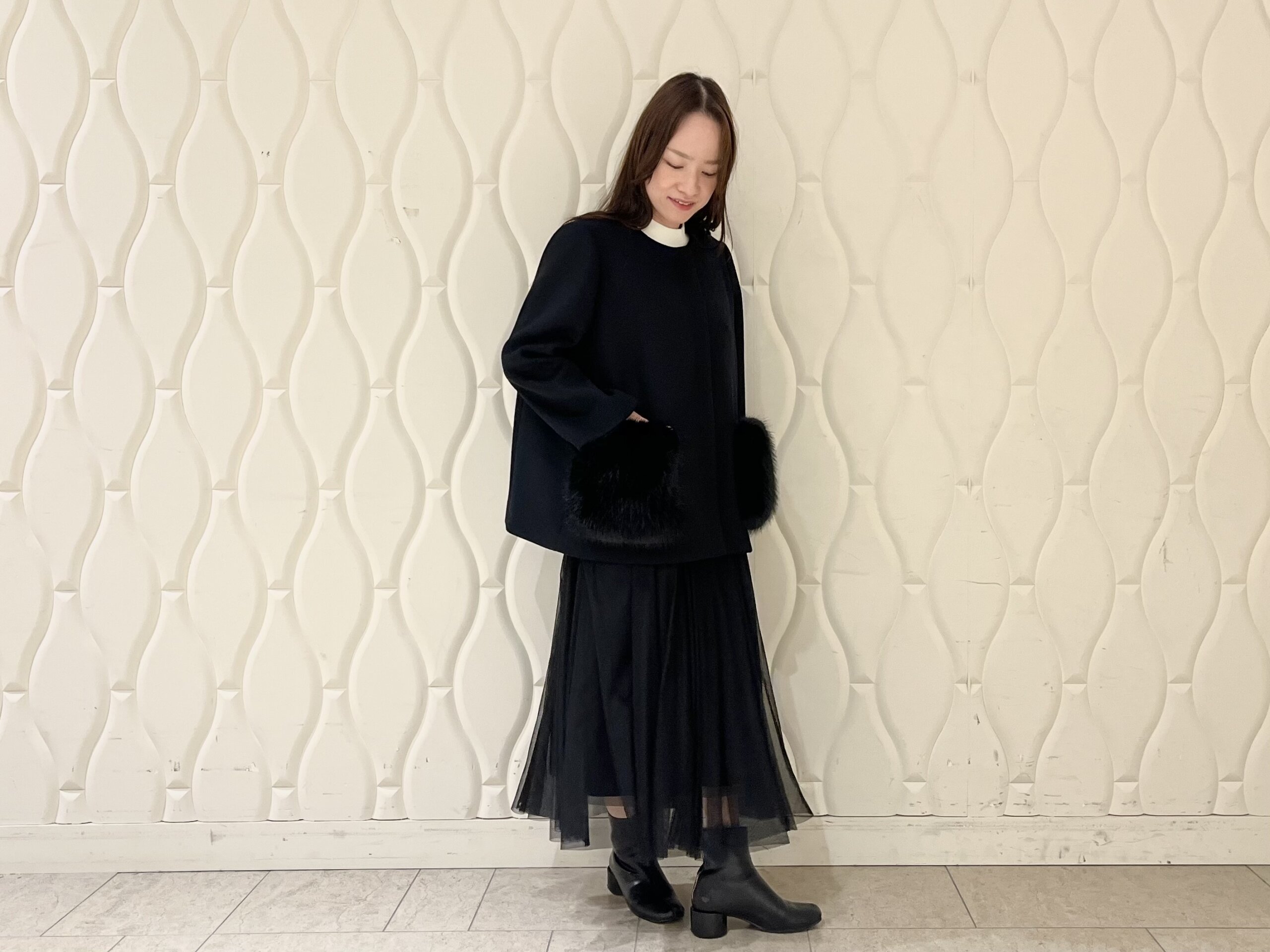動くたびに揺れるチュールスカートと合わせれば、同じブラックでも異素材のレイヤードによって軽さと深みが生まれ、冬のオールブラックスタイルがぐっと洗練された印象に。